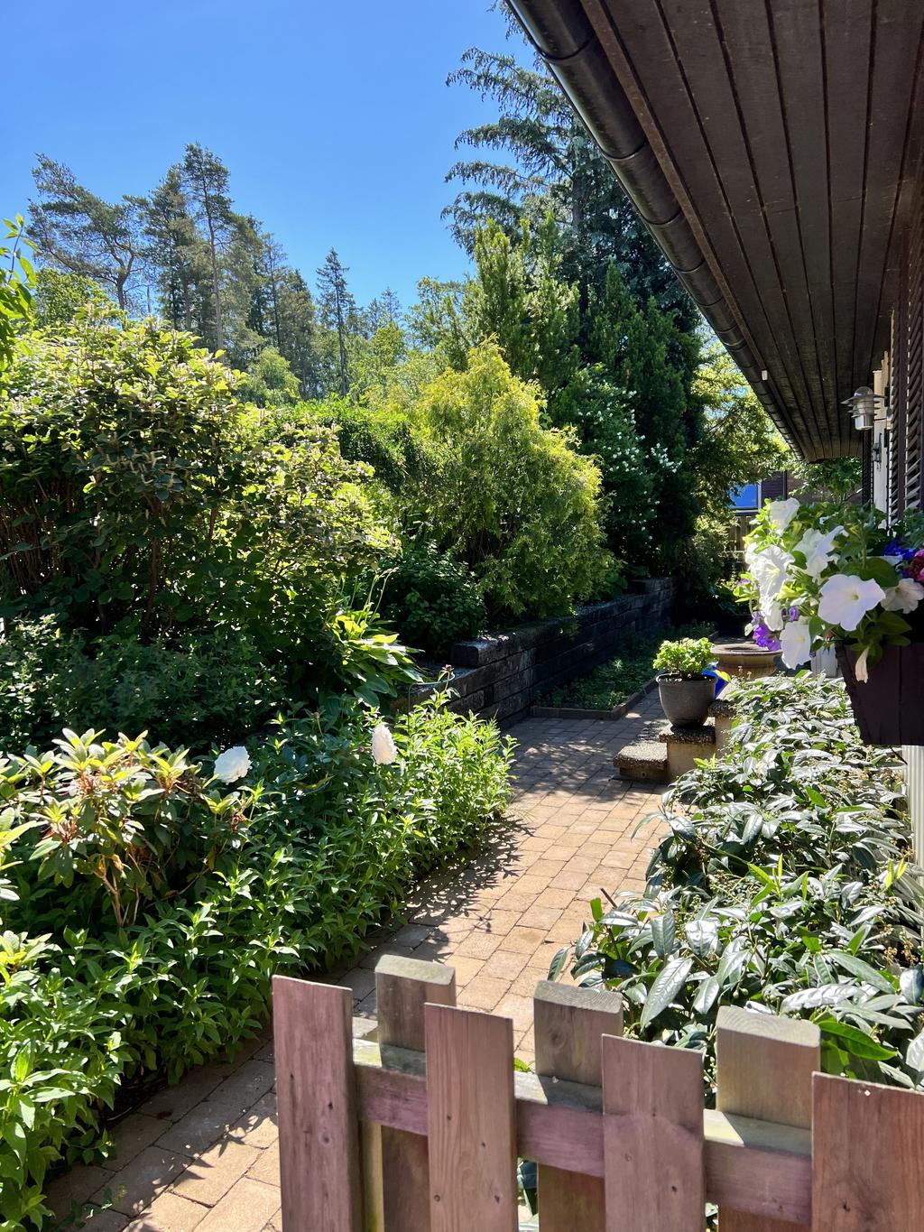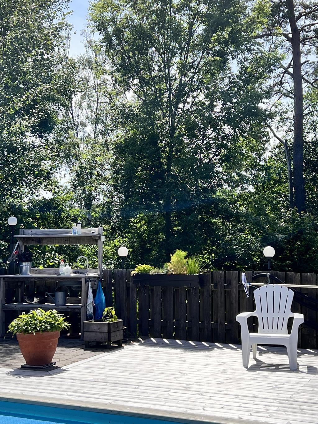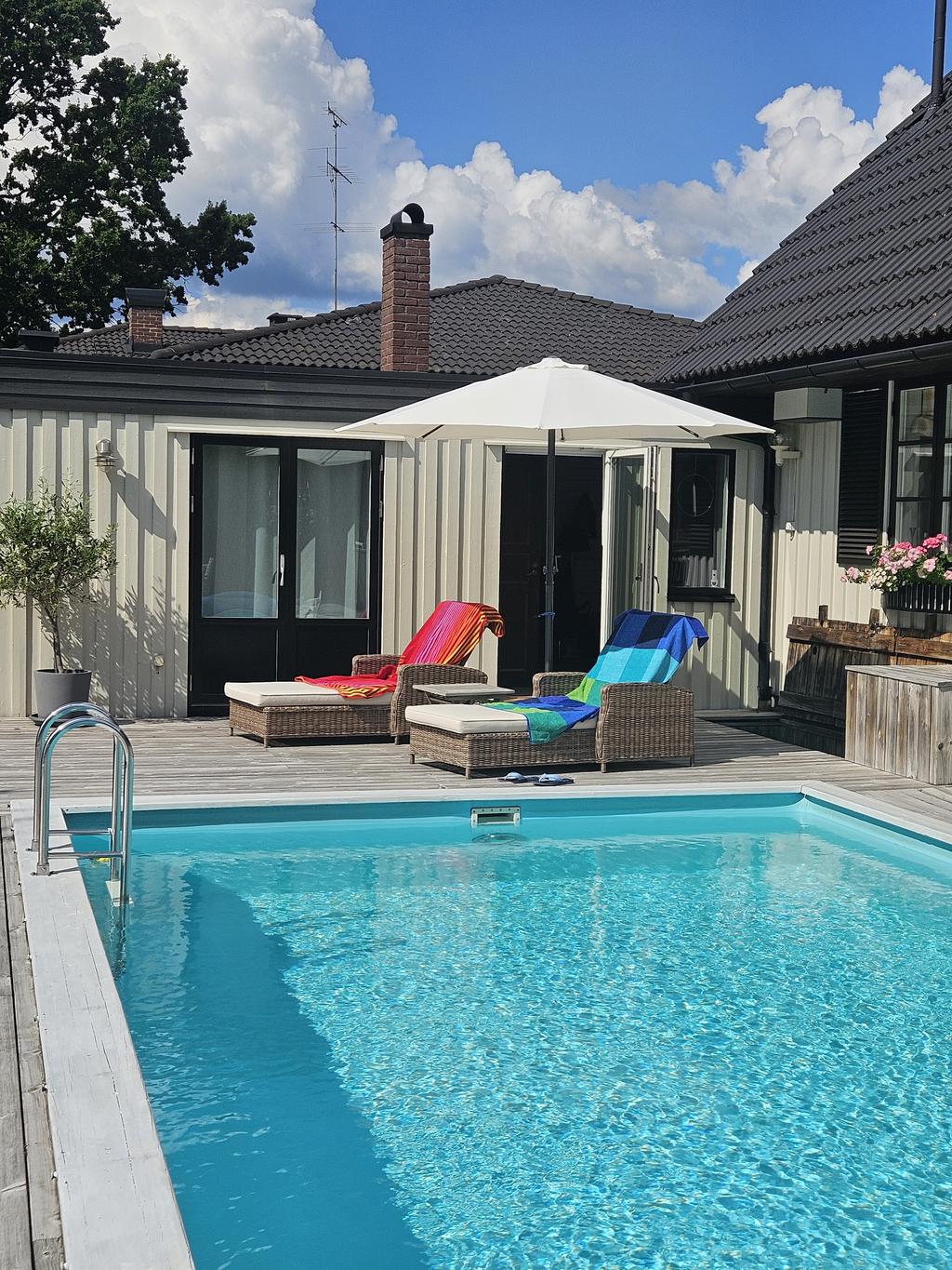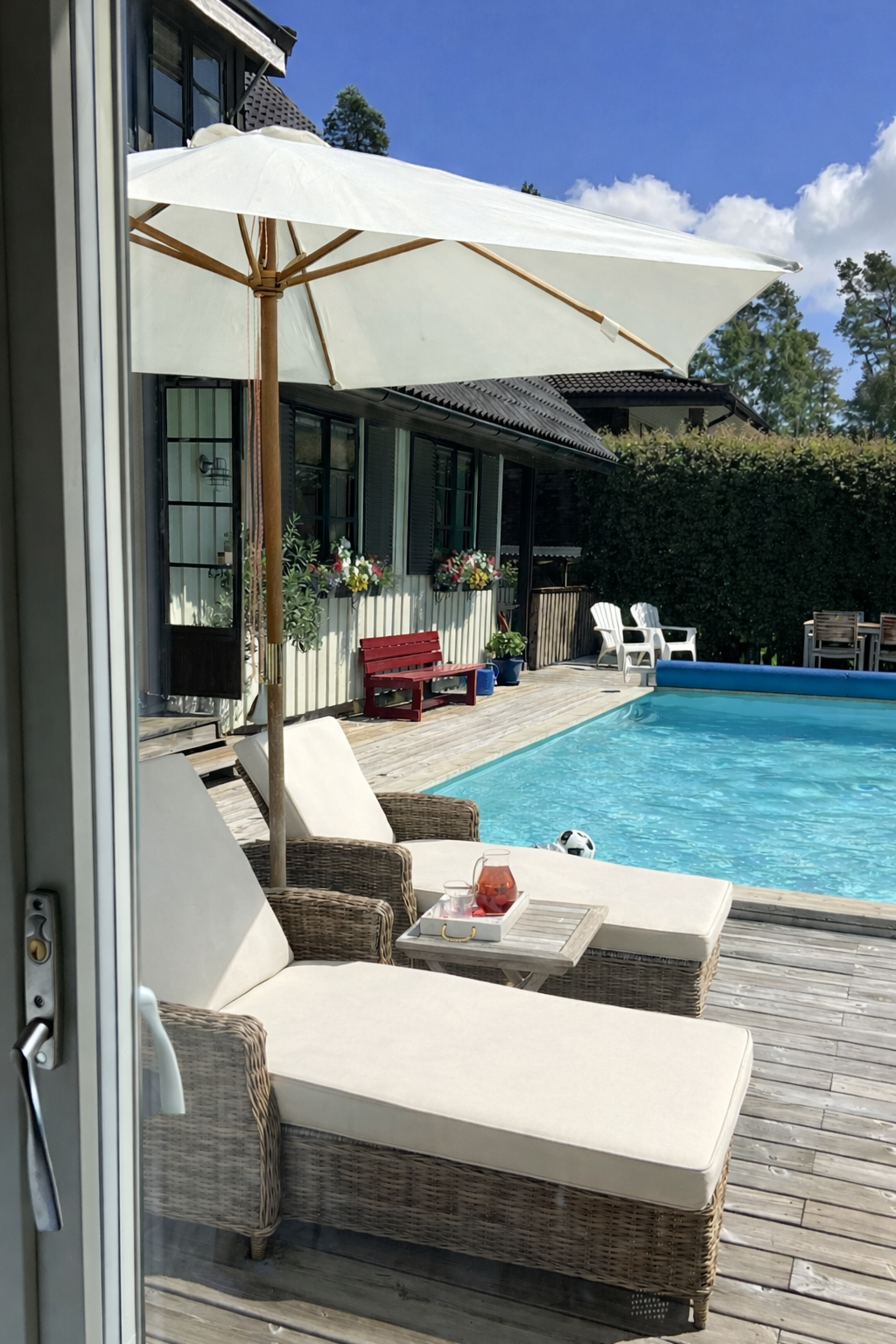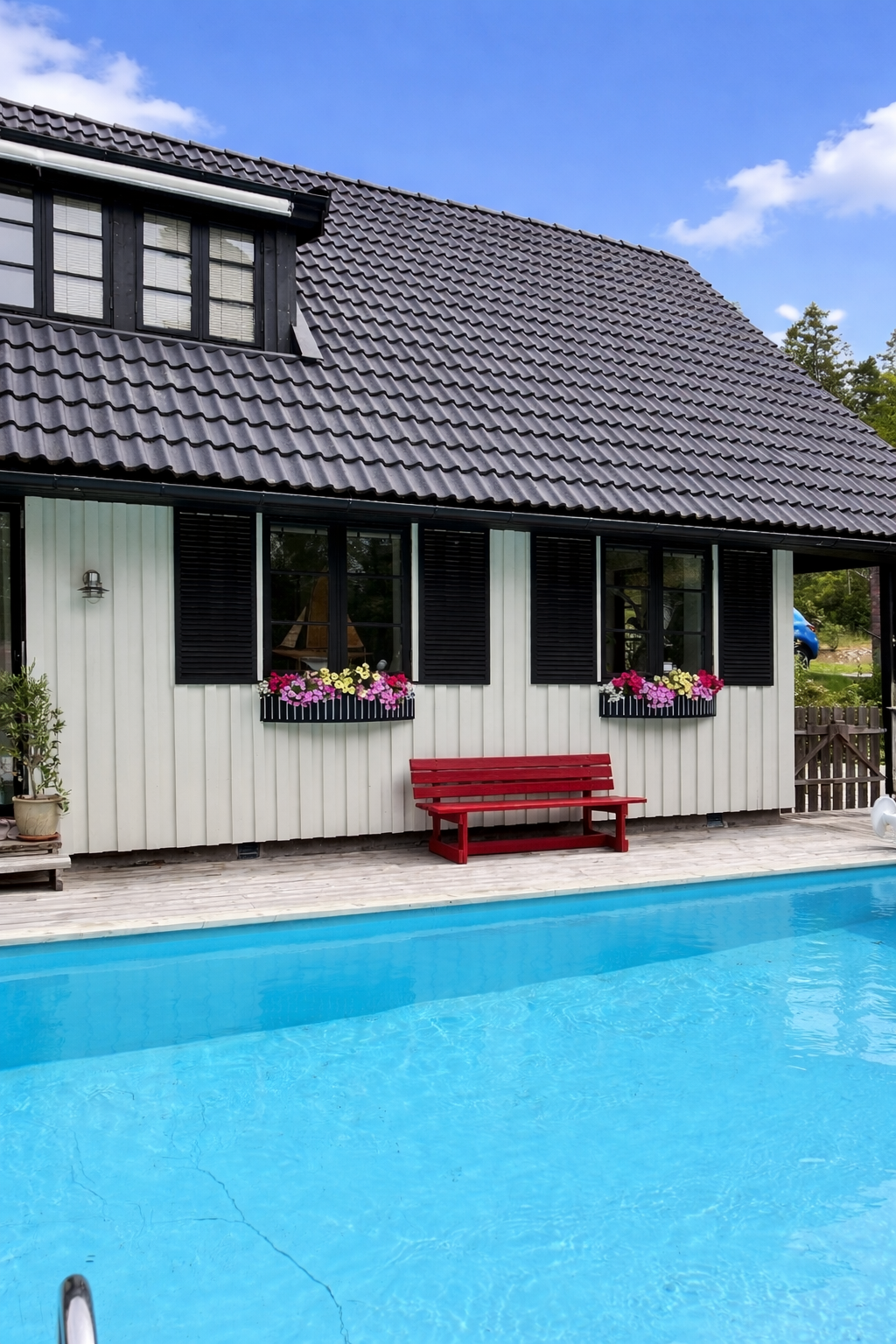 Fastigheten erbjuder generösa ytor både inne och ute och skapar en boendemiljö som passar lika bra för det lugna vardagslivet som för sociala tillställningar. Sommaren börjar tidigt i det privata poolområdet där vardagen snabbt känns avlägsen. Det stora pooldäcket är vindskyddat av vinkelhuset, häck och staket, vilket ger ett behagligt mikroklimat och en ovanligt lång bad- och utesäsong. Här finns gott om plats för flera sittgrupper samt en stenlagd hörna för grillplats med utekök. Altanen leder vidare till den kuperade, inhägnade trädgården idylliskt med flaggstång – en trygg och bilfri miljö där både lek, odling och avkoppling får ta plats.