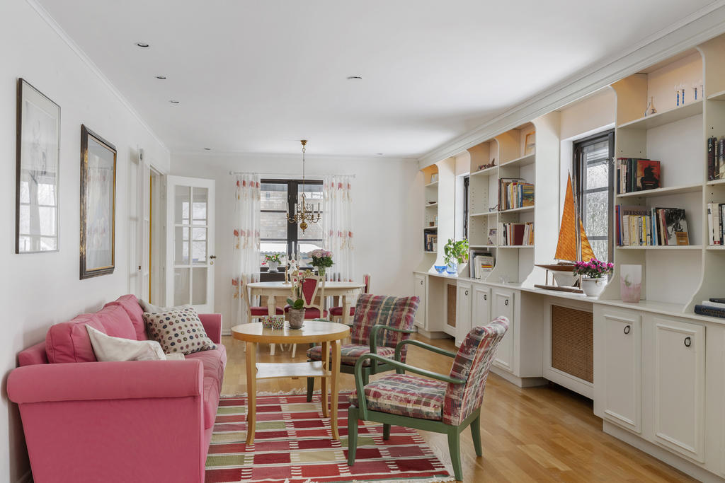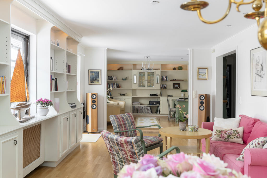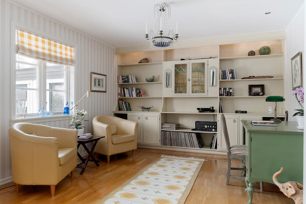 Husets hjärta och center är det stora vardagsrummet med det angränsande biblioteket, eller för all del matsal, kontor eller lekrum beroende på just era behov. Rummen skapar en varm och inbjudande miljö för samtal, umgänge och stilla stunder. I rummet finns vackra platsbyggda skåp, hyllor och vitrindelar. Här är det enkelt att föreställa sig storslagna tillställningar och middagar, men rummet är minst lika fantastiskt till familjens lugna hemmadagar. Varför inte slå sig ner med en bok och en kopp te med altandörren på glänt där ni hör familjens lek från altan och pool.