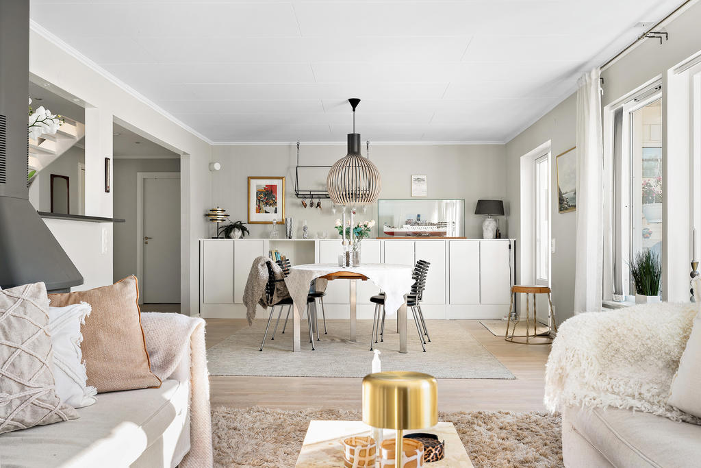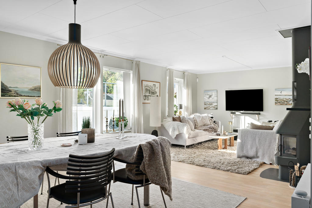 Mitt i rummet står den öppna spisen – hemmets hjärta – som sprider både värme och ro under kyliga kvällar. Tack vare den generösa ytan ryms både soffgrupp och ett stort matsalsbordet där familj och vänner kan samlas.