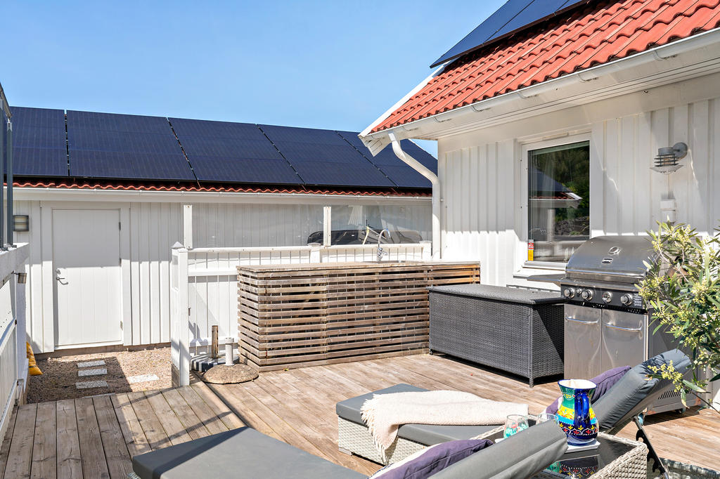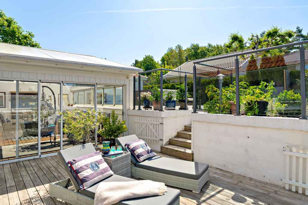 Från vardagsrummet kliver du ut till det fantastiska uterummet – en plats som förlänger sommaren och låter dig njuta av ljuset långt in på hösten. När dörrarna öppnas smälter inne och ute samman, och trädgården blir en förlängning av hemmet. På den generösa altanen väntar en oas för både avkoppling och umgänge. Här kan du sjunka ner i den inbjudande terrasspoolen, njuta av långa grillkvällar i uteköket med vänner. Den genomtänkta utemiljön bjuder också på grönska och odlingslådor där du kan låta örter och grönsaker frodas. Här används varje kvadratmeter med omtanke – en plats för både vila och lek.