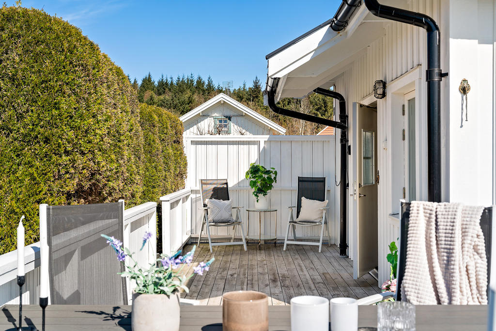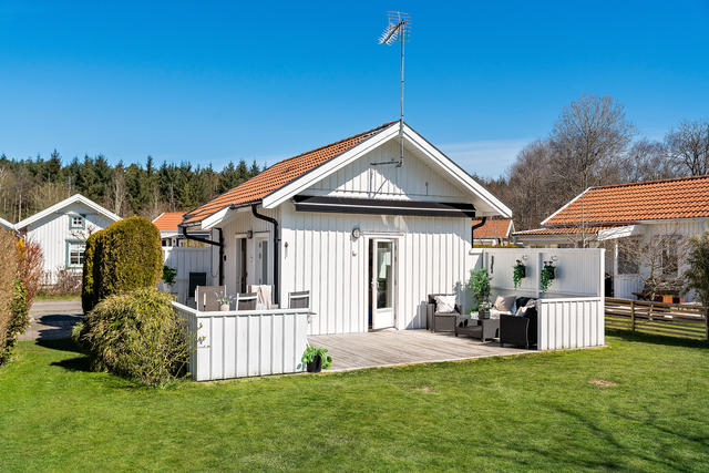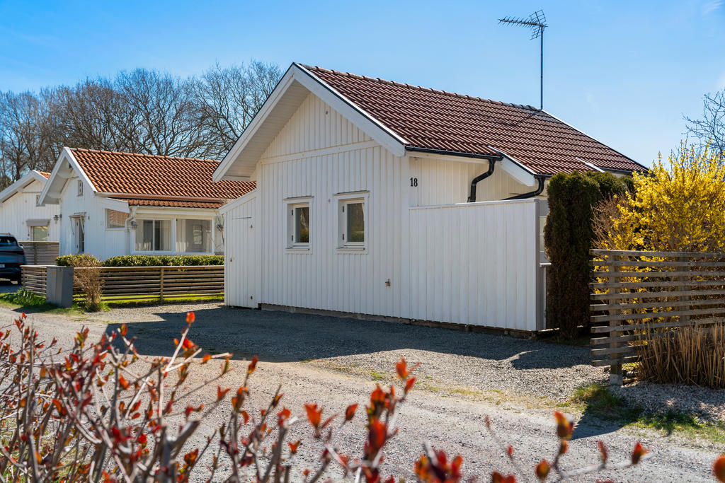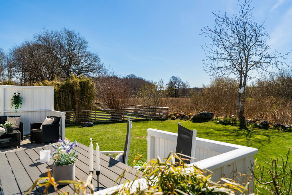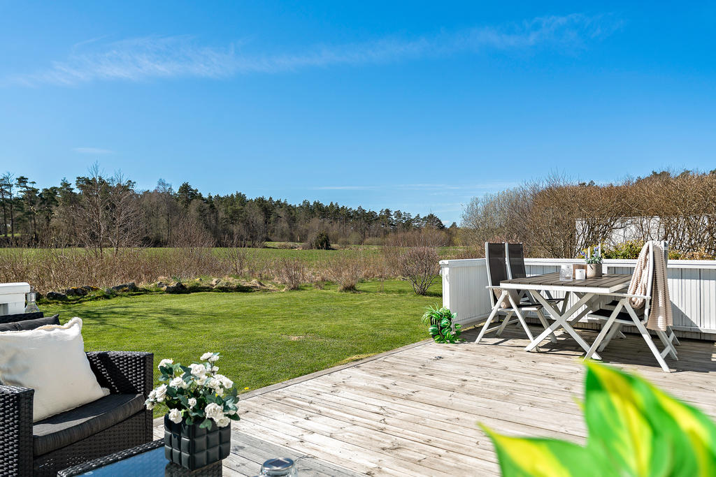 Utemiljön är en av bostadens stora tillgångar. Den generösa uteplatsen bjuder in till långa grillkvällar, avkopplande stunder i solen och umgänge från morgon till kväll. Vid behov skapar markisen behaglig skugga, och när sommaren är som varmast väntar havet bara en kort promenad bort. Intill huset finns dessutom ett praktiskt förråd för trädgårdsredskap och extra förvaring.