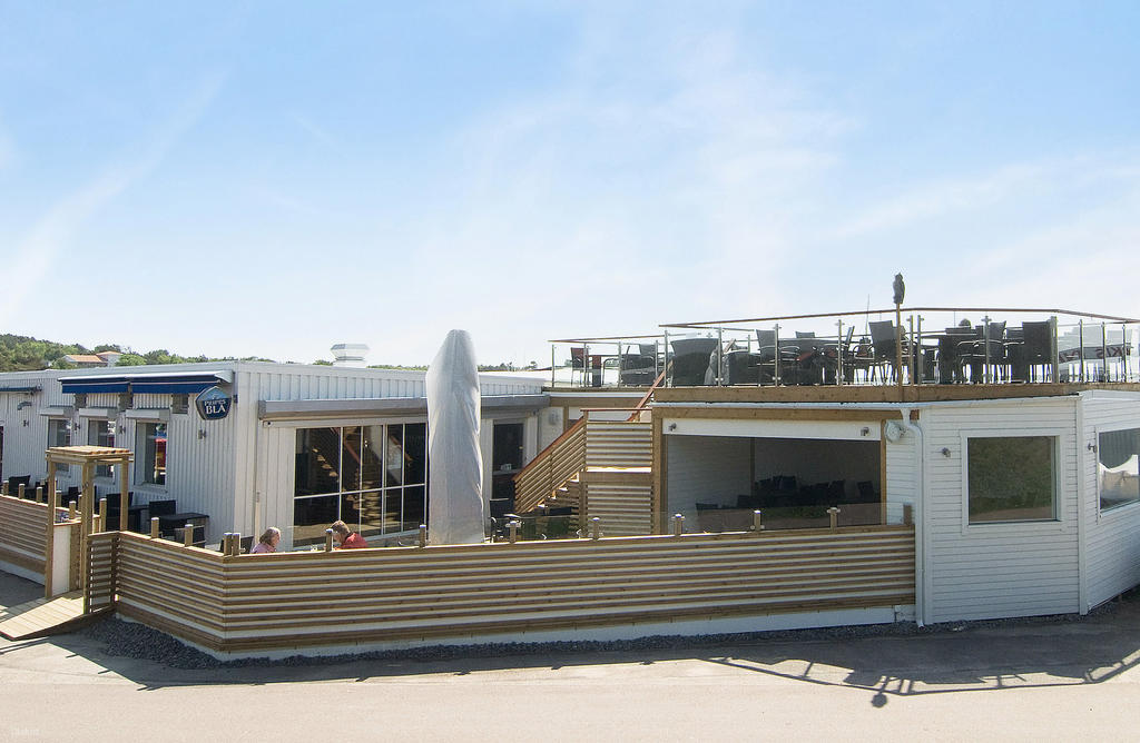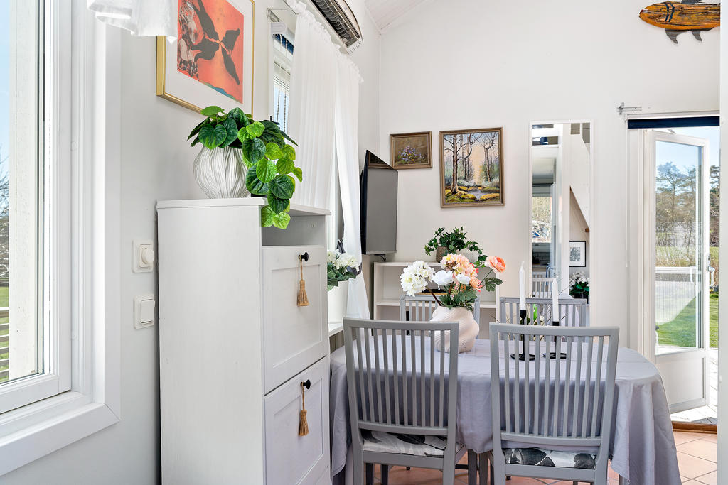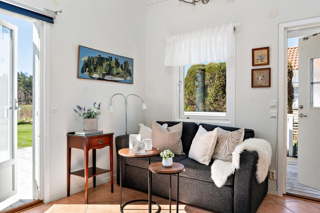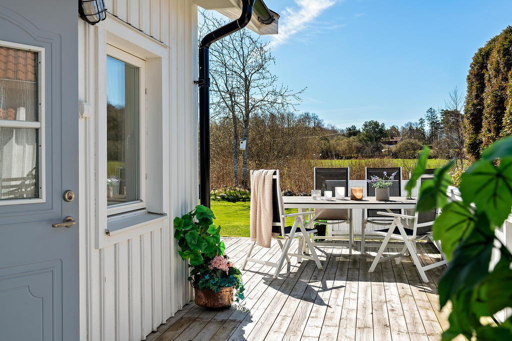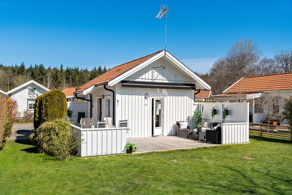 Utemiljön är en av bostadens stora tillgångar. Den generösa uteplatsen bjuder in till långa grillkvällar, avkopplande stunder i solen och umgänge från morgon till kväll. Vid behov skapar markisen behaglig skugga, och när sommaren är som varmast väntar havet bara en kort promenad bort. Intill huset finns dessutom ett praktiskt förråd för trädgårdsredskap och extra förvaring.