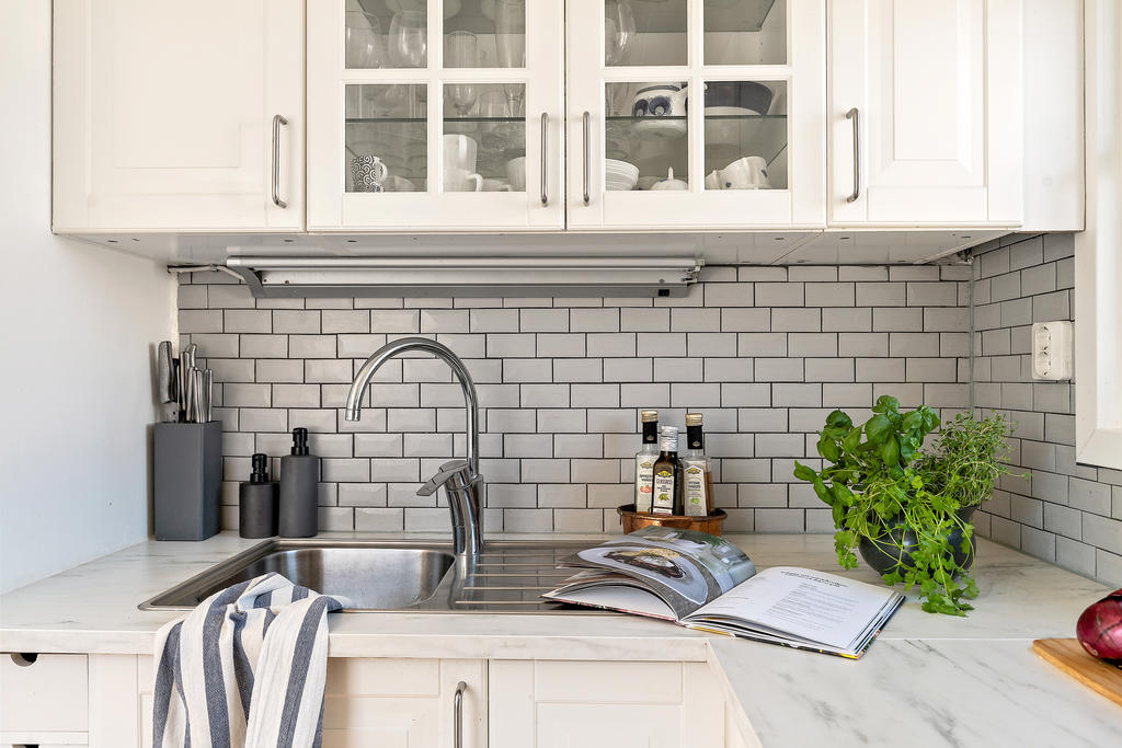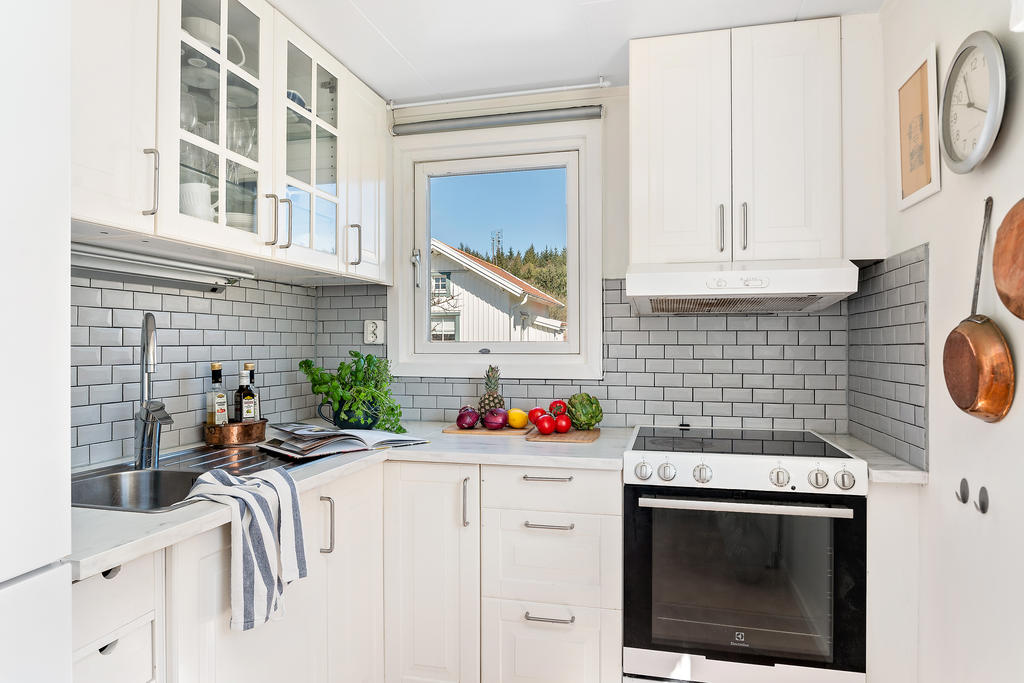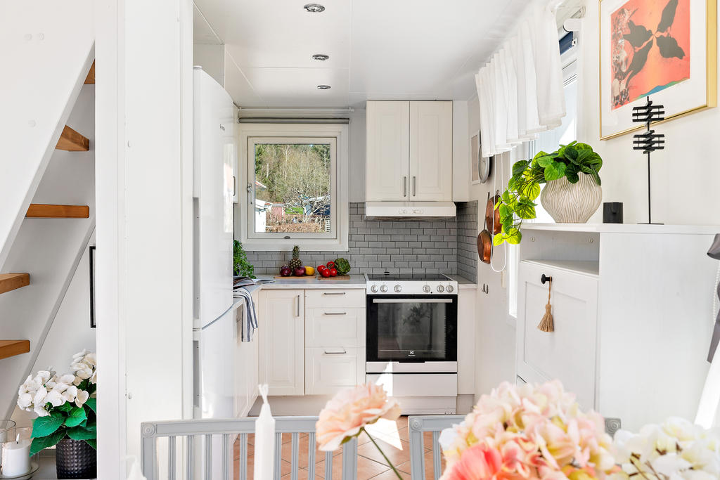 Köket är stilrent och praktiskt utformat med goda arbetsytor och bra förvaring. Intill finns en trivsam matplats för upp till fyra personer.
