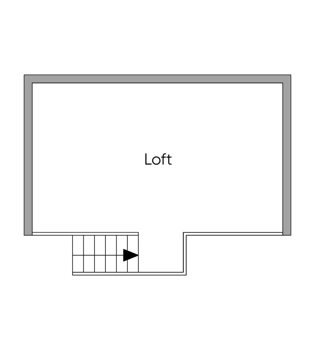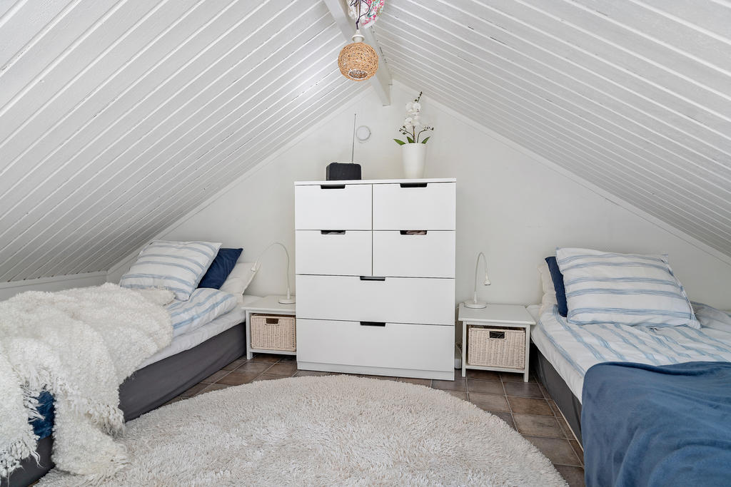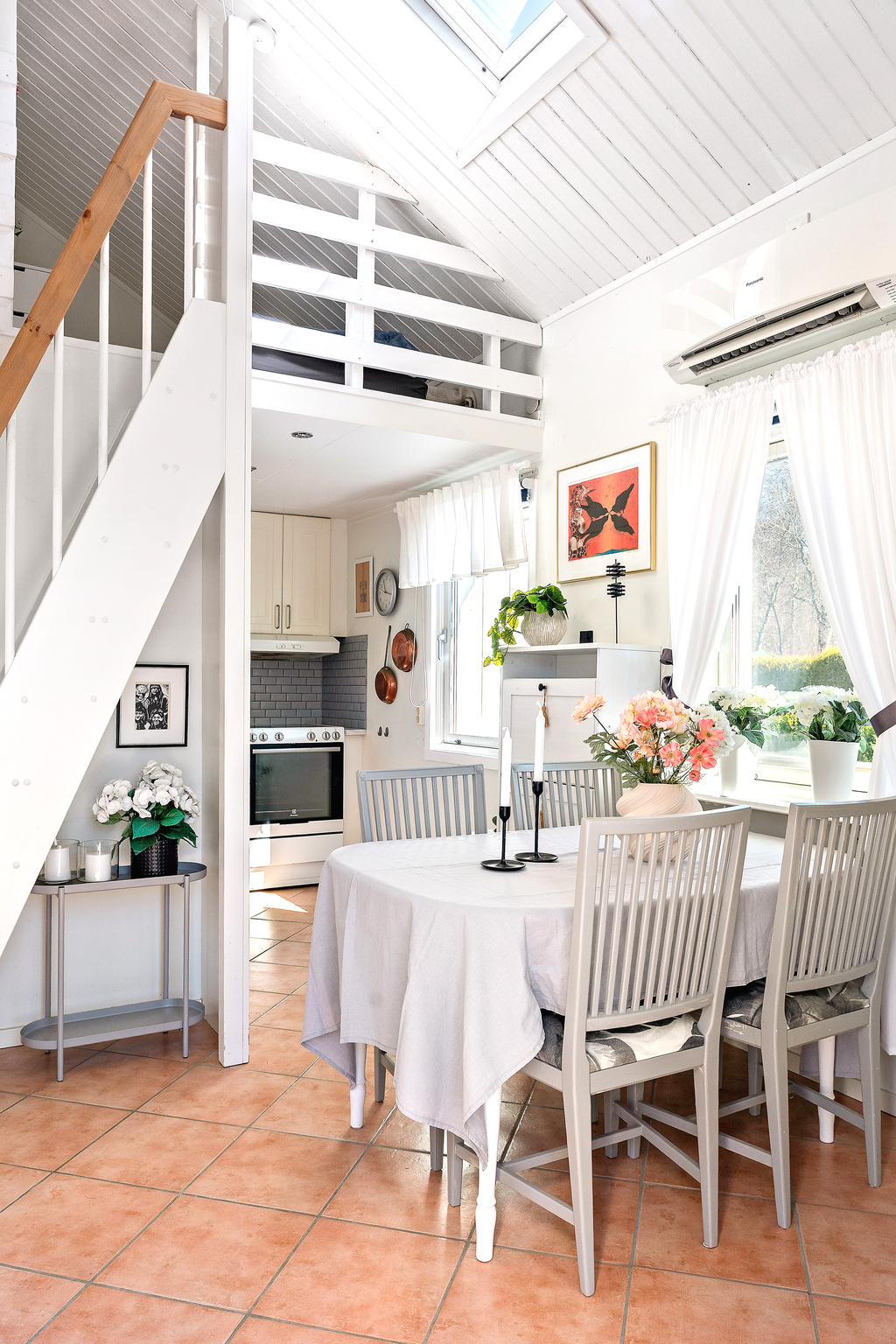 Ovanför köket ligger det rymliga sovloftet med plats för större madrass eller sängar, samt extra förvaring längs sidorna, en smart och mysig lösning som frigör värdefull golvyta.