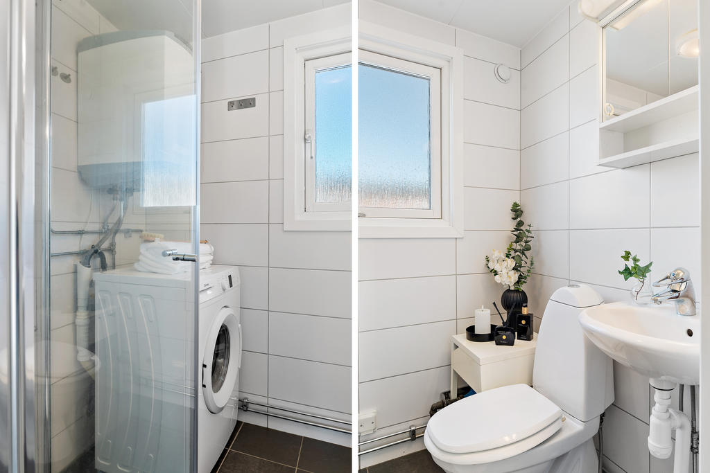 Badrummet är helkaklat och utrustat med dusch, handfat, toalett och vädringsfönster. Här finns även en tvättmaskin som bidrar till ett bekvämt vardagsliv.