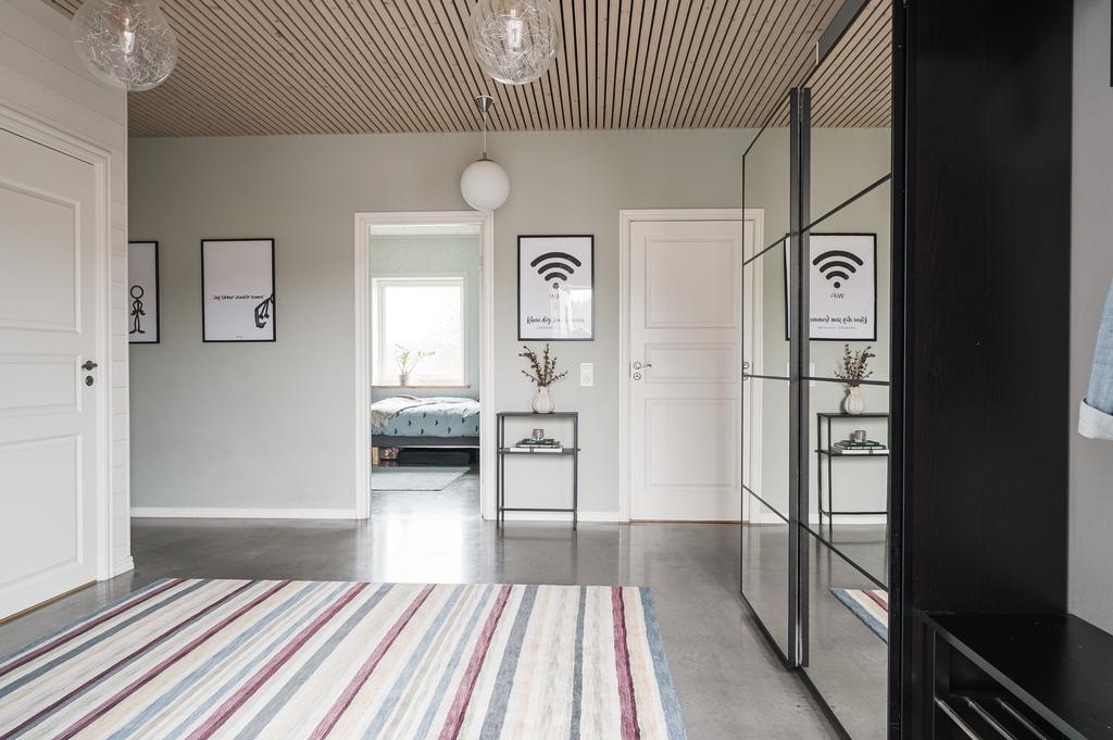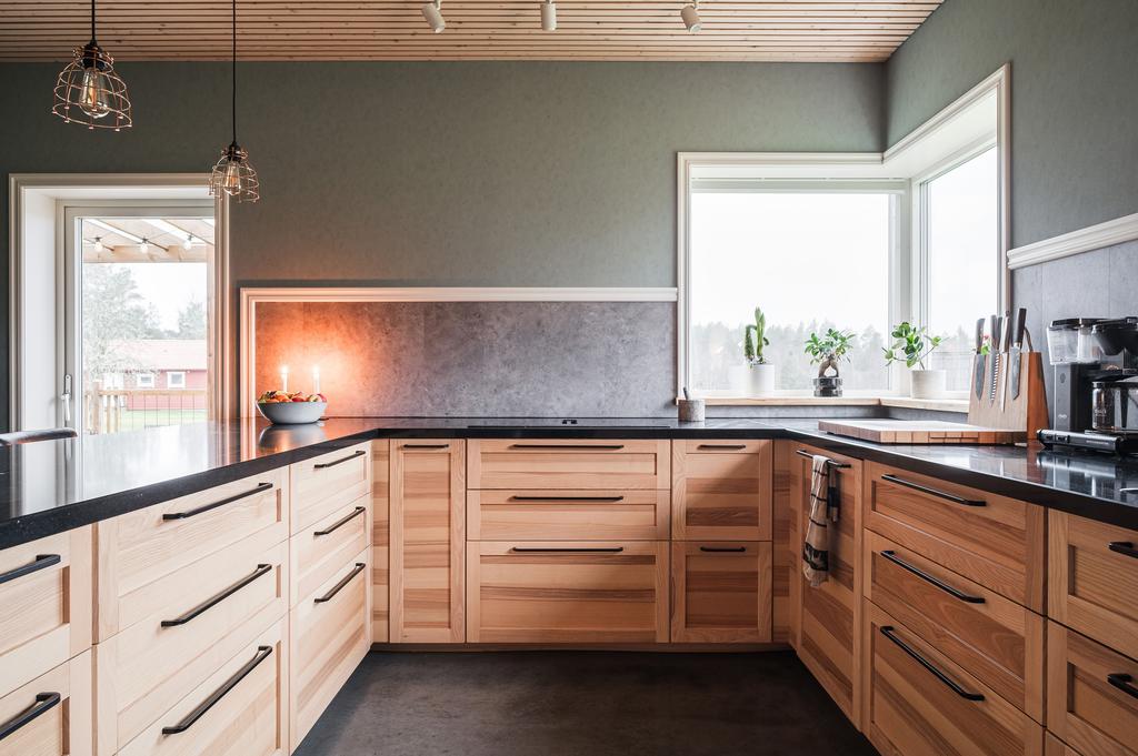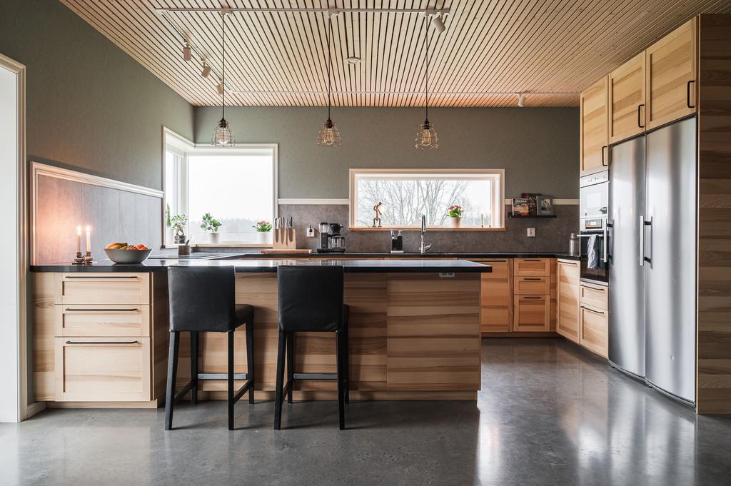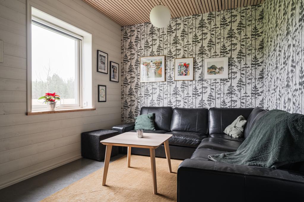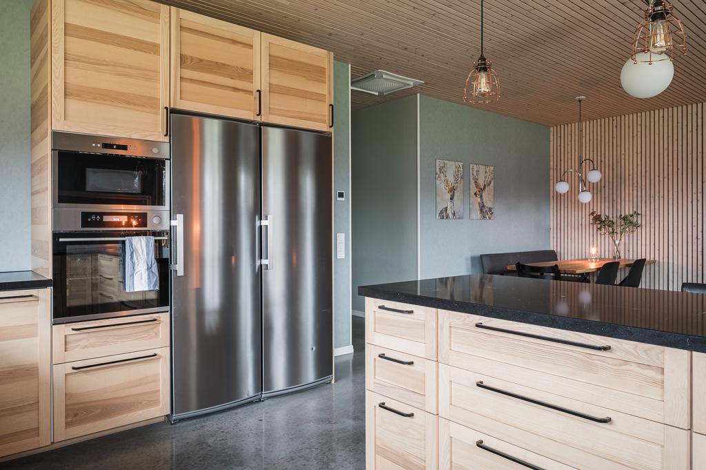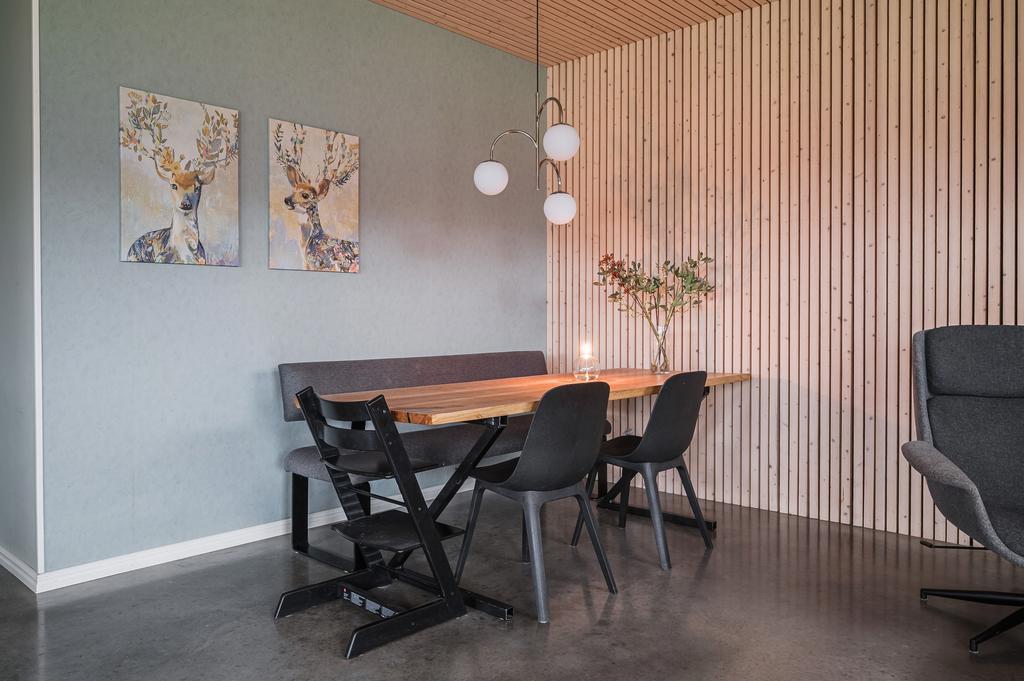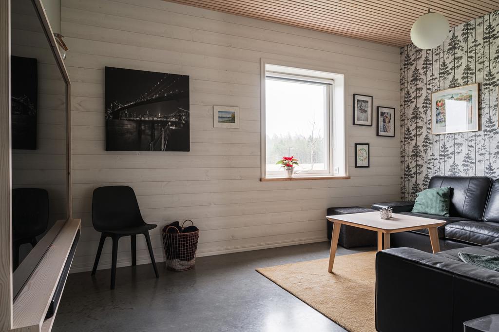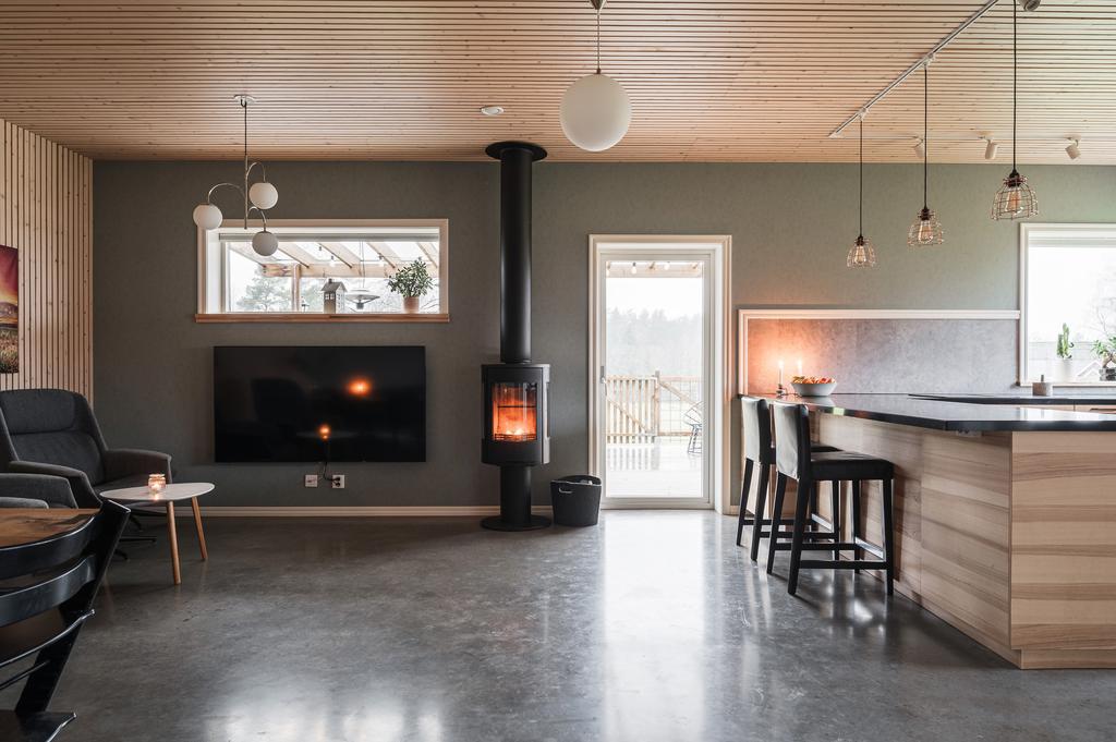 Invändigt öppnar huset upp sig mot ett smakfullt kök i öppen planlösning med vardagsrummet. Köket är välutrustat med generösa arbetsytor, köksö med sittplatser och stilrena materialval som harmonierar fint med bostadens genomgående design. Det ribbklädda innertaket ger karaktär och bidrar till en varm och exklusiv känsla. I vardagsrummet finns en centralt placerad Contura-kamin som både höjer mysfaktorn och fungerar som ett effektivt komplement till uppvärmningen.