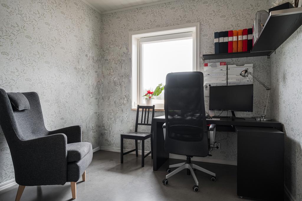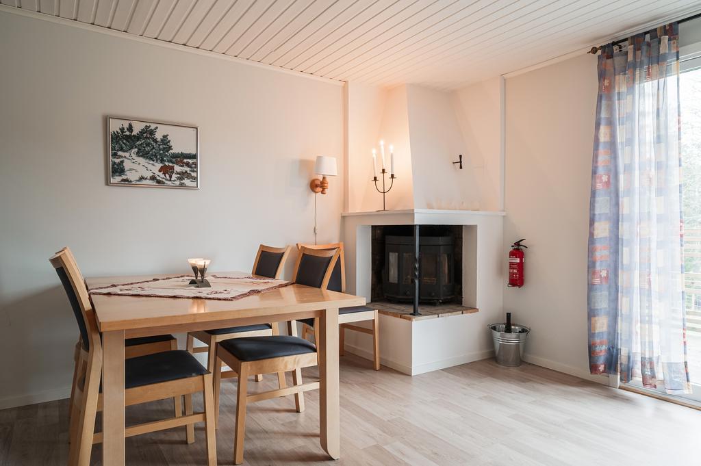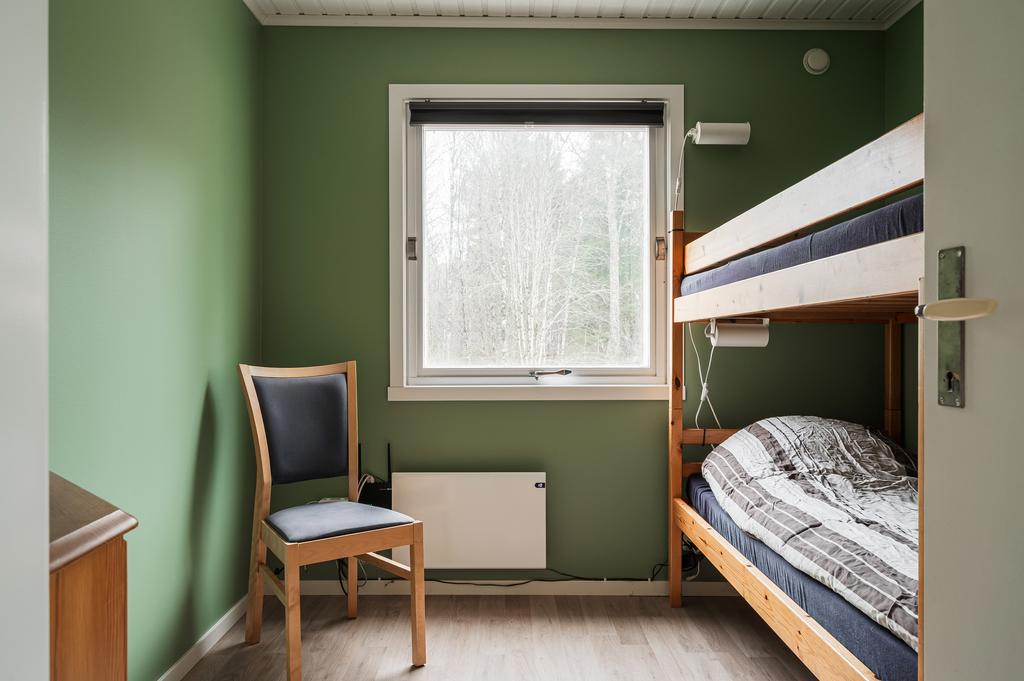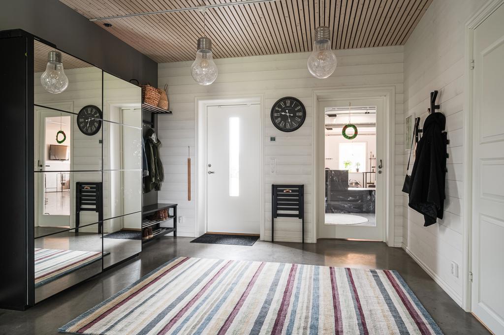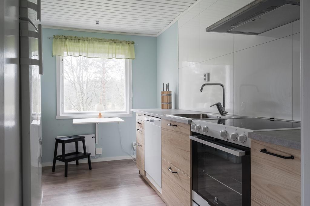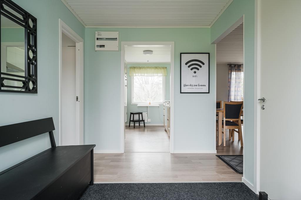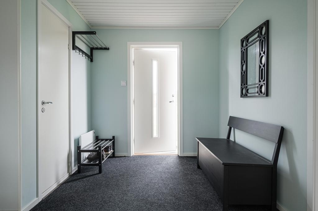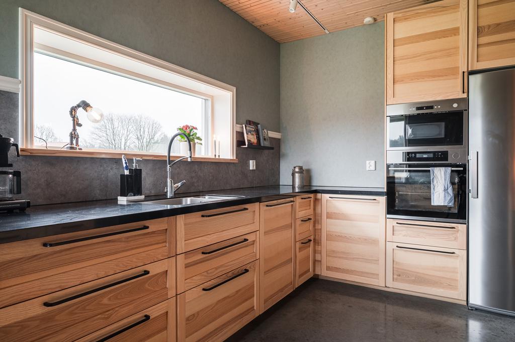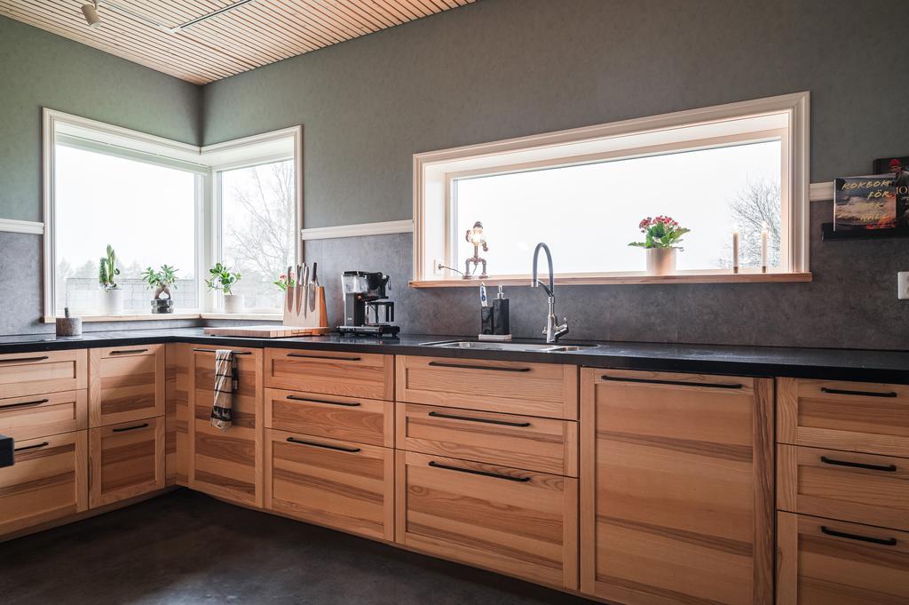 Invändigt öppnar huset upp sig mot ett smakfullt kök i öppen planlösning med vardagsrummet. Köket är välutrustat med generösa arbetsytor, köksö med sittplatser och stilrena materialval som harmonierar fint med bostadens genomgående design. Det ribbklädda innertaket ger karaktär och bidrar till en varm och exklusiv känsla. I vardagsrummet finns en centralt placerad Contura-kamin som både höjer mysfaktorn och fungerar som ett effektivt komplement till uppvärmningen.