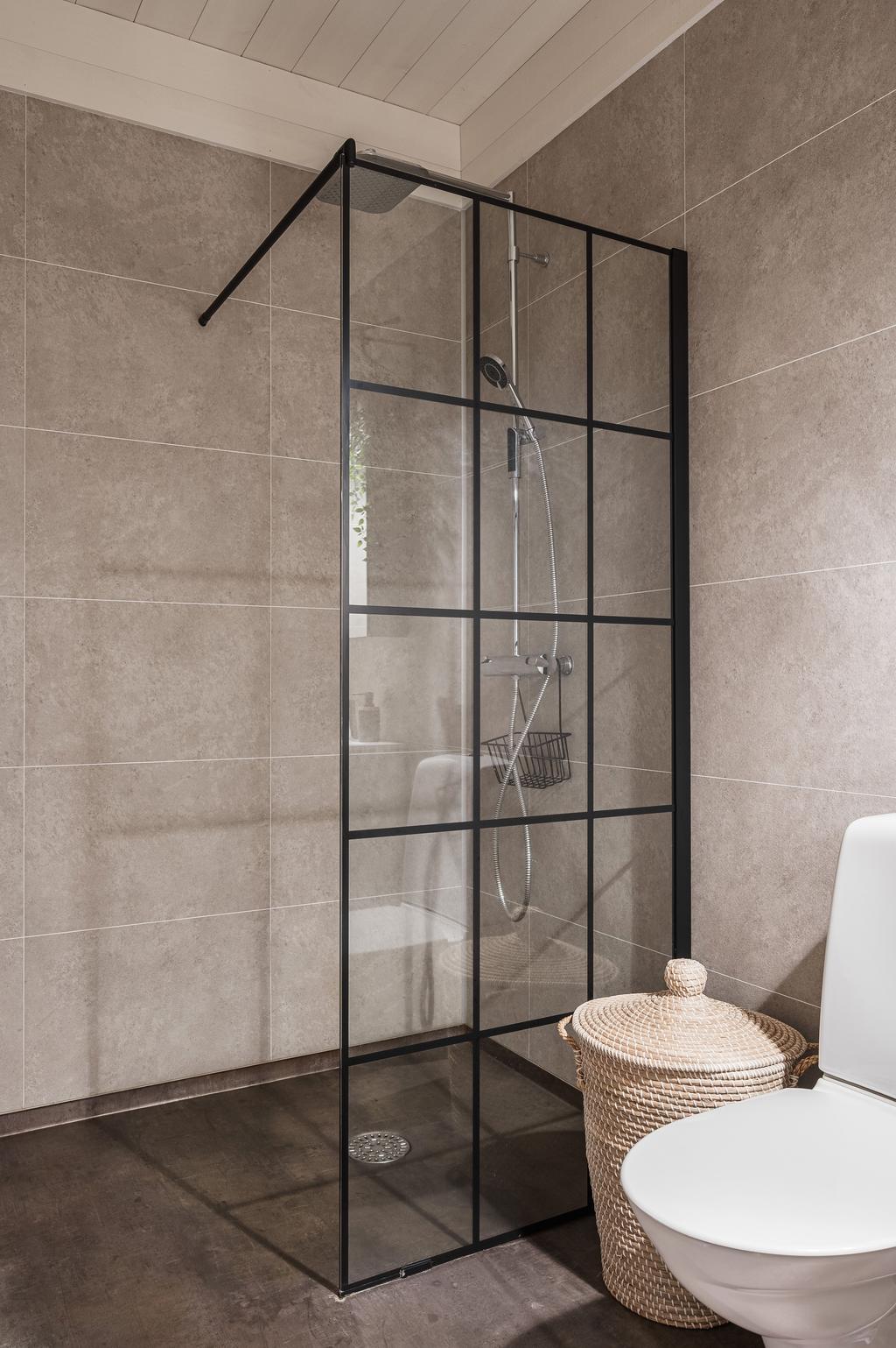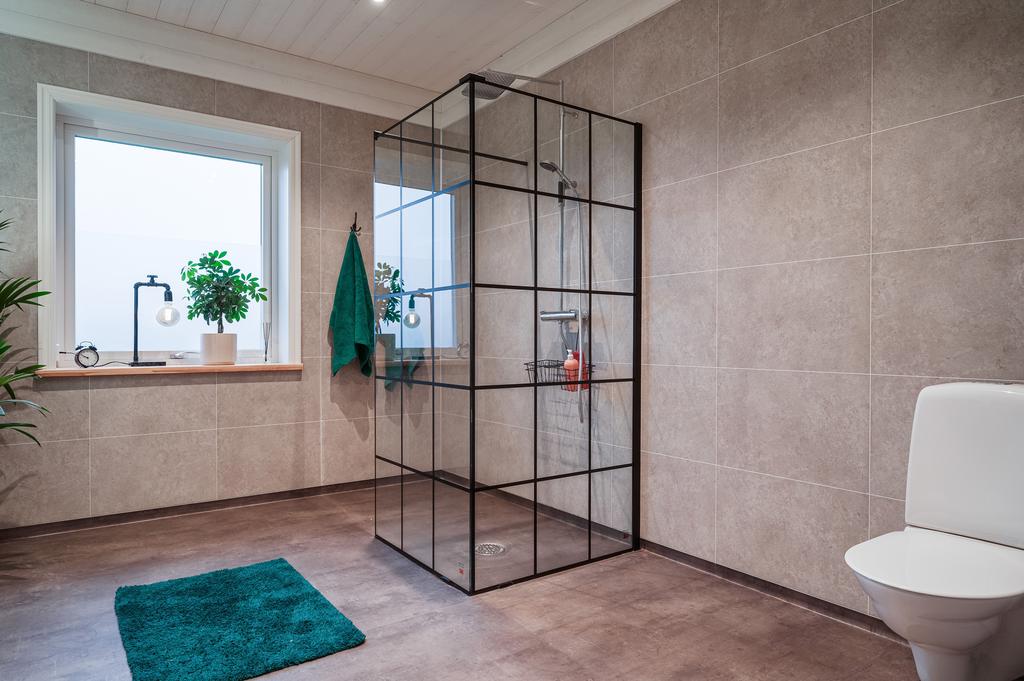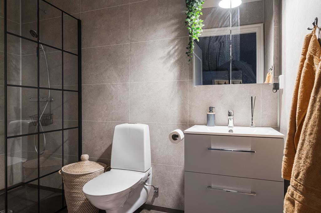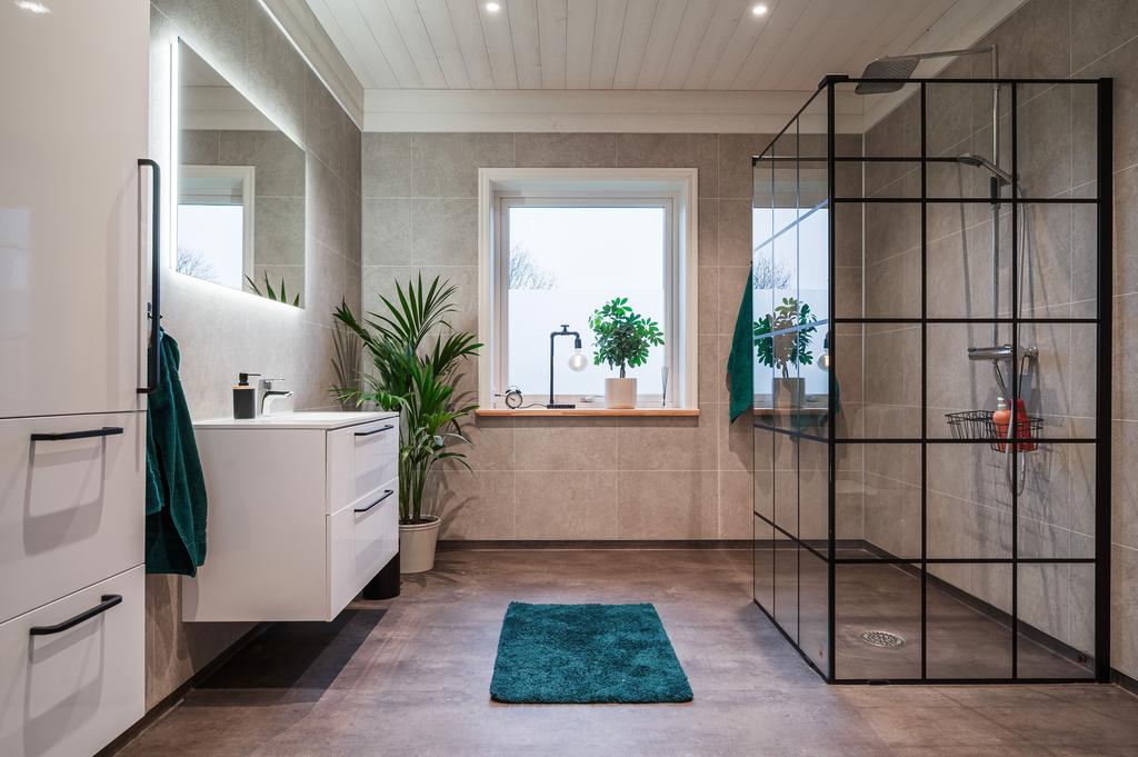 Huset erbjuder tre rymliga sovrum samt två badrum, båda utförda i moderna färg- och materialval. Det större badrummet imponerar med generösa ytor, dusch med industriglas, fönster för naturligt ljus samt stilren inredning. Här finns även en separat tvättavdelning med goda arbetsytor, förvaring och egen utgång till altanen – mycket praktiskt i vardagen.