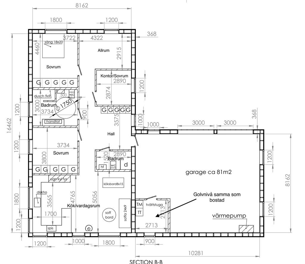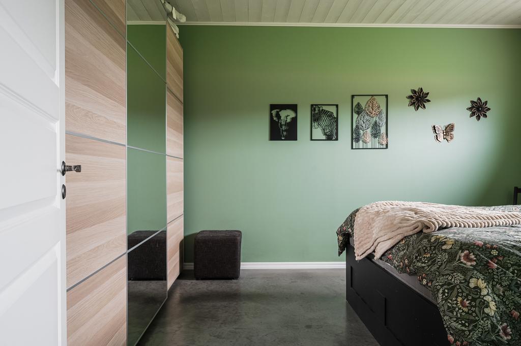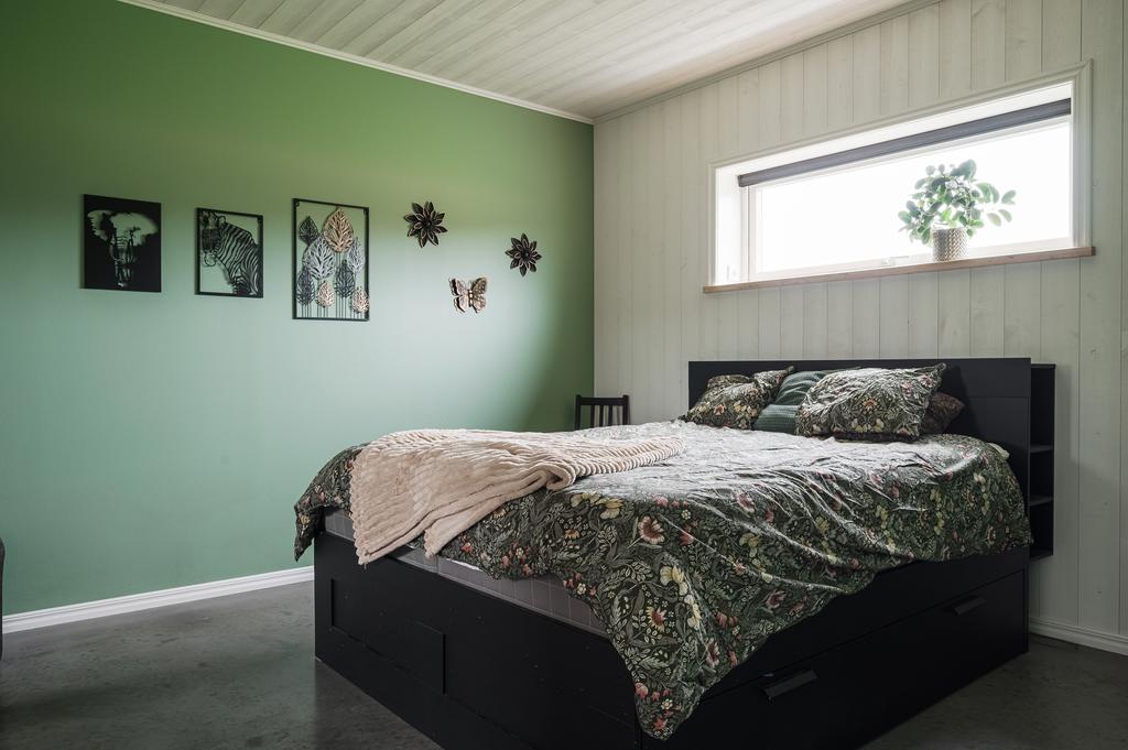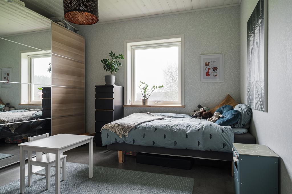 Huset erbjuder tre rymliga sovrum samt två badrum, båda utförda i moderna färg- och materialval. Det större badrummet imponerar med generösa ytor, dusch med industriglas, fönster för naturligt ljus samt stilren inredning. Här finns även en separat tvättavdelning med goda arbetsytor, förvaring och egen utgång till altanen – mycket praktiskt i vardagen.