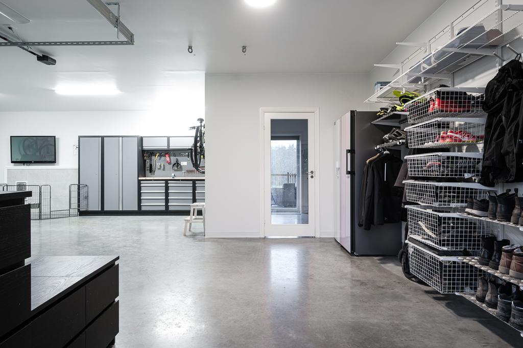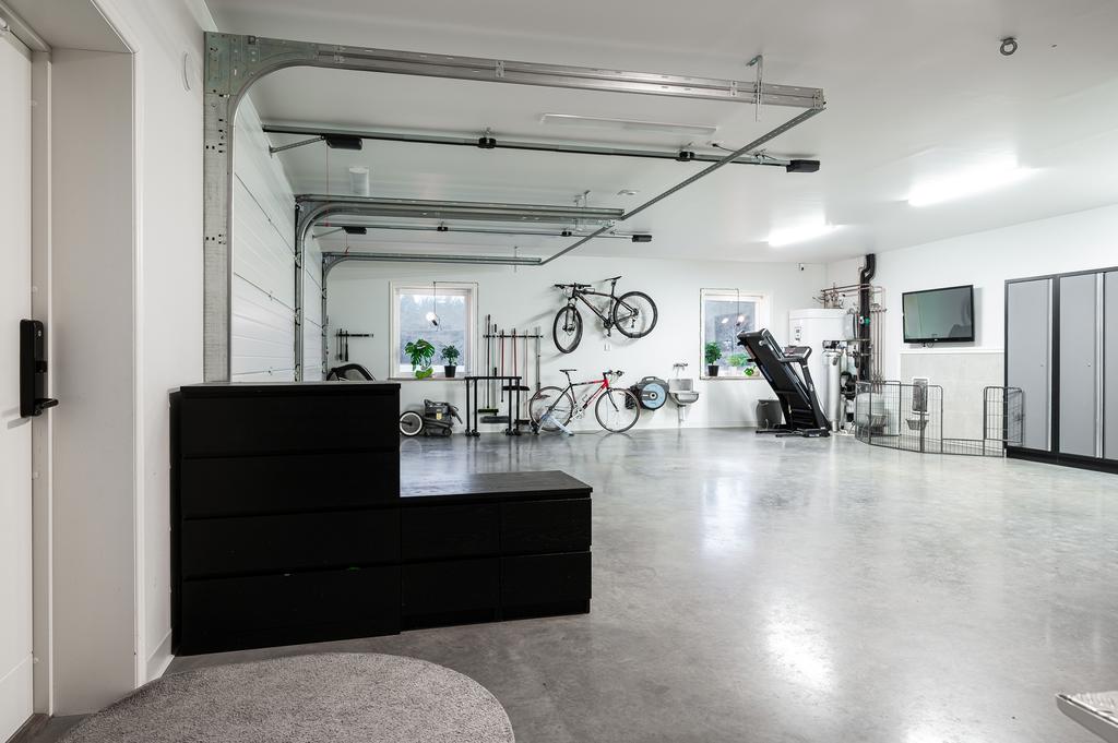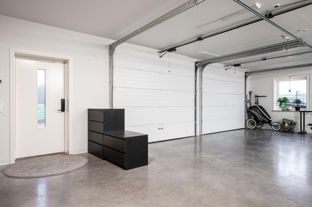 I direkt anslutning till bostaden finns ett rejält dubbelgarage med elektriska portar, vilket gör det enkelt att ta sig torrskodd mellan bil och bostad, en uppskattad detalj under årets kallare och regnigare dagar.