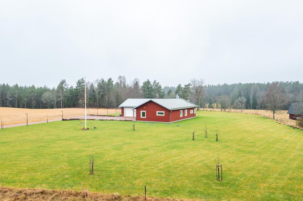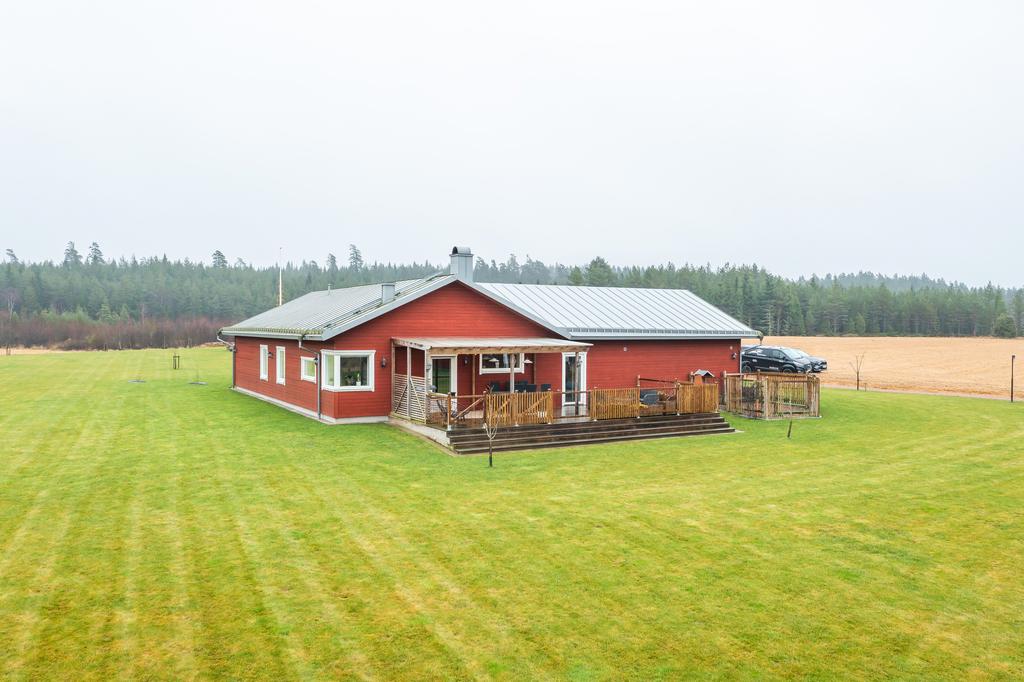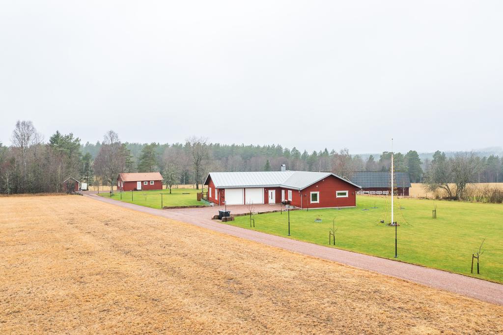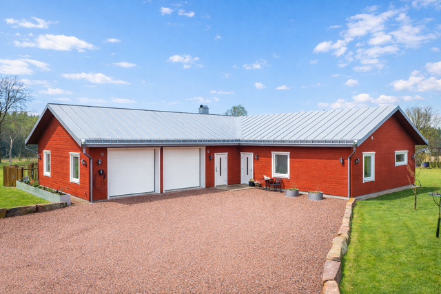 Exteriört präglas fastigheten av stående träpanel i varm kulör, ett elegant bandtäckt plåttak samt stora treglasfönster som ger ett fantastiskt ljusinsläpp. Bostaden är uppförd på gjuten platta med vattenburen golvvärme i hela huset, vilket skapar ett behagligt inomhusklimat året runt.