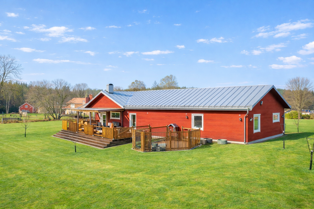 Utomhus erbjuds en stor altan med delvis tak, perfekt för sommarens måltider och umgänge. Tomten är plan, lättskött och erbjuder fina gräsytor med gott om plats för lek, odling eller framtida projekt.