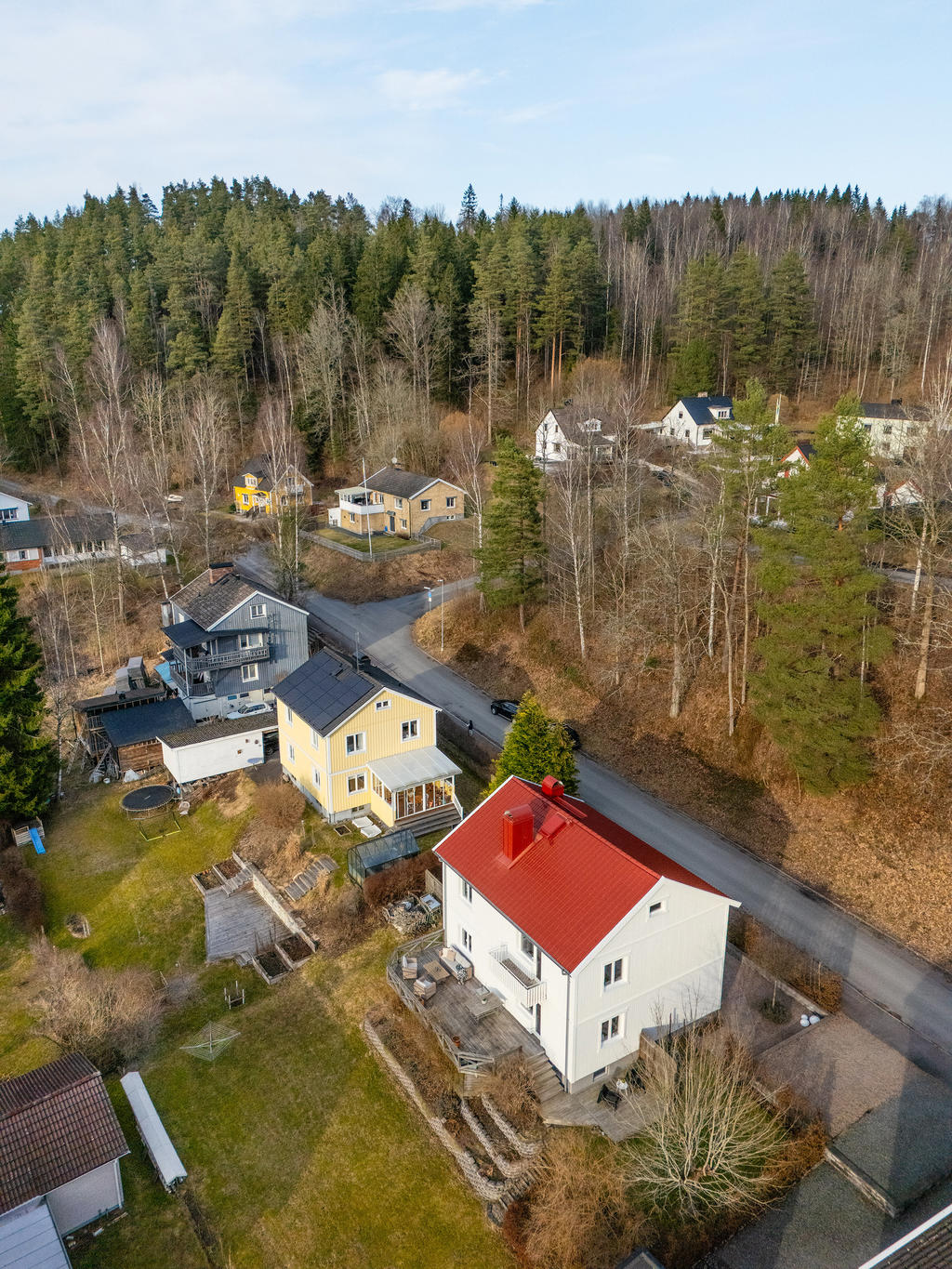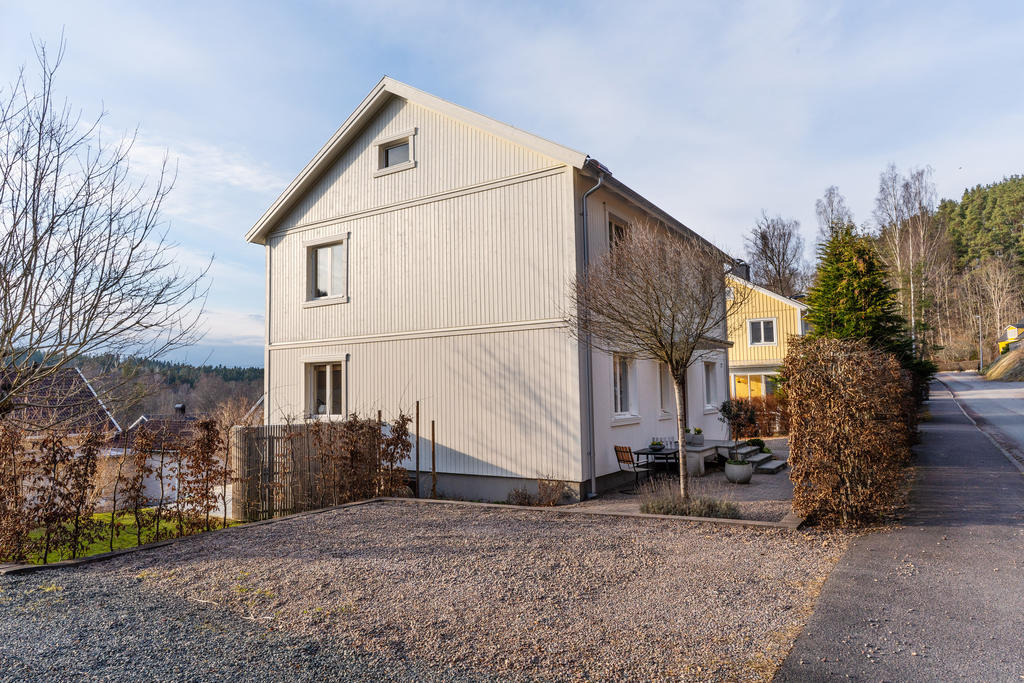 Trots att området är bebyggt med närliggande hus upplevs läget som både fritt och ljust, med en vacker utsikt över dalen. Det västliga läget ger härlig kvällssol – något som verkligen sätter guldkant på tillvaron. Trädgården erbjuder generösa ytor där den nedre delen lämpar sig utmärkt för lek och aktivitet, med plats för såväl studsmatta som fotboll.