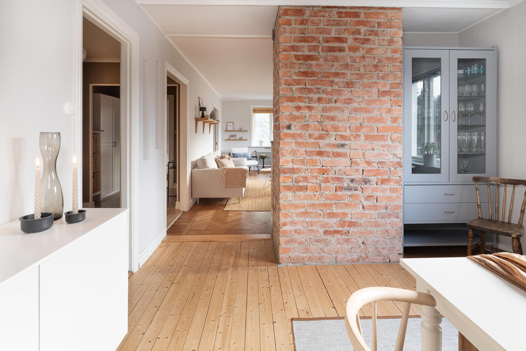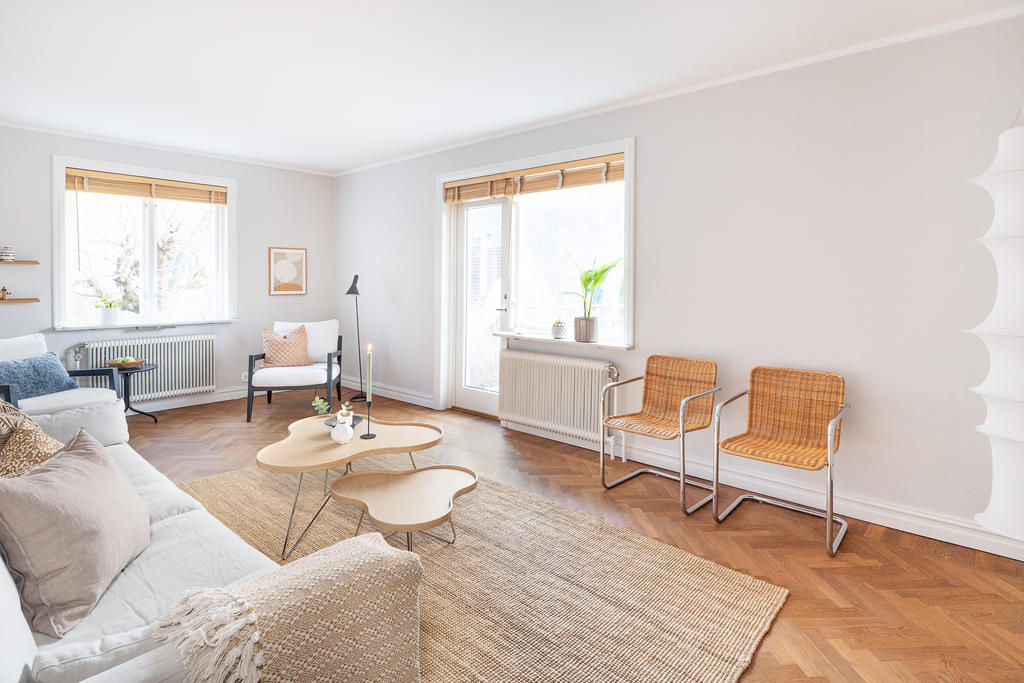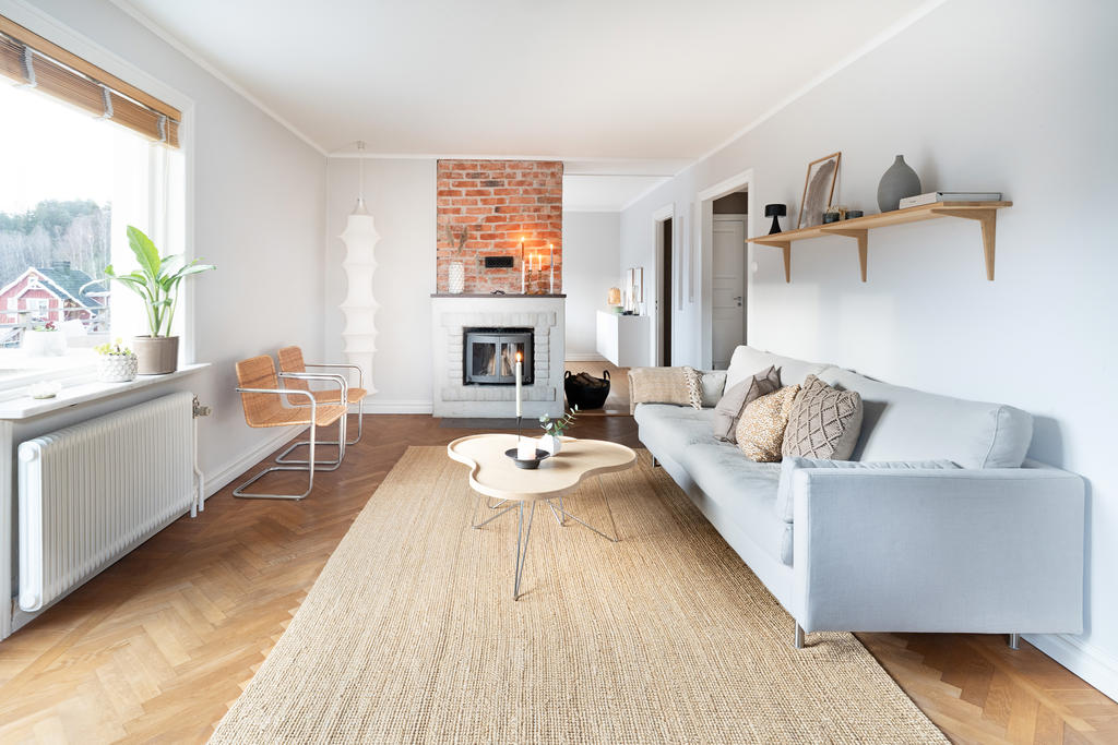 Villan uppfördes ursprungligen som en tvåfamiljsvilla med identiska planlösningar på båda våningsplanen. Redan på 1970-talet omvandlades övervåningen då köket togs bort till förmån för ett extra sovrum. Nuvarande ägare har varsamt moderniserat bostaden genom att öppna upp väggar och skapa ett luftigt trapphus, vilket ger ett generöst ljusinsläpp och en härlig rymd redan vid entrén. Interiört möts du av vackra materialval såsom stavparkett i ek och charmiga furuplankgolv, tillsammans med en framtagen murstock som skapar karaktär och värme. Köket från Lundins Kök i Hestra håller hög kvalitet och harmonierar väl med husets stil. Vidare finns fina, helkaklade badrum och WC samt bevarade 2-glasfönster som bidrar till bostadens tidstypiska charm.
