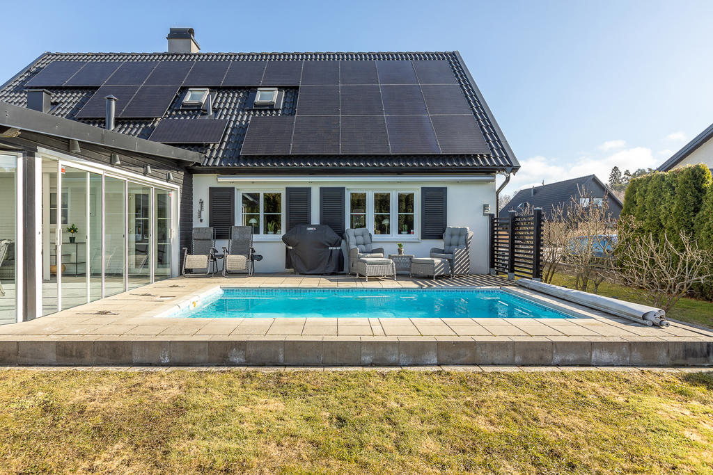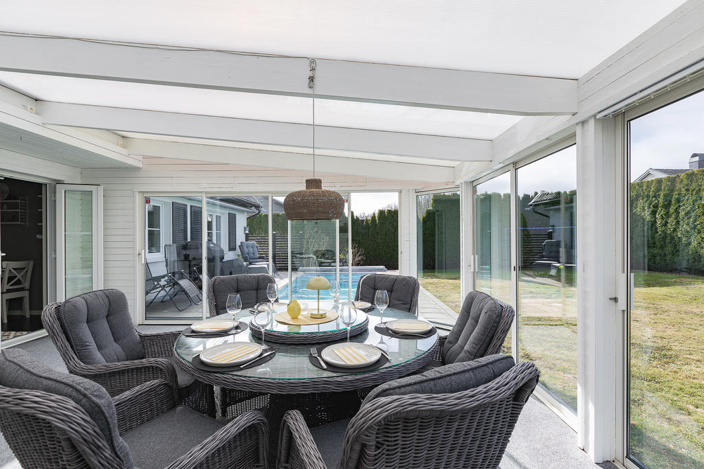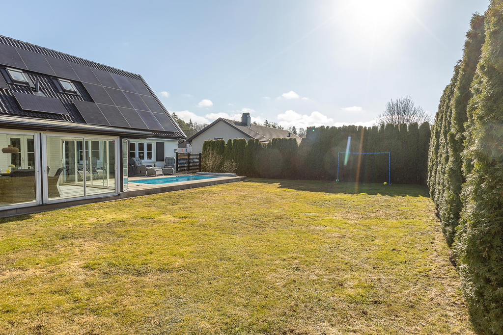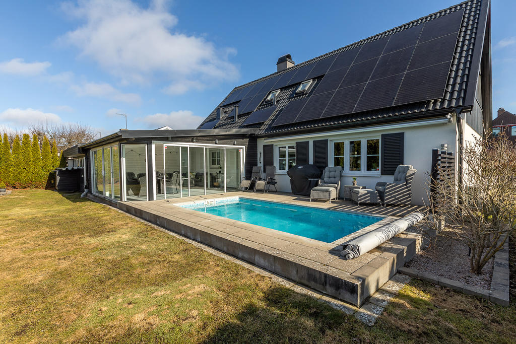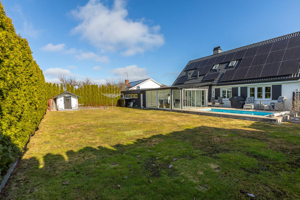 Poolvilla på Hov med insynskyddad tomt, inglasat uterum, dubbelgarage och dessutom bästa västerläge!