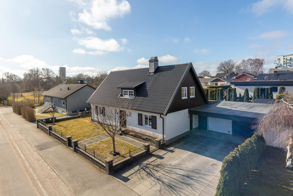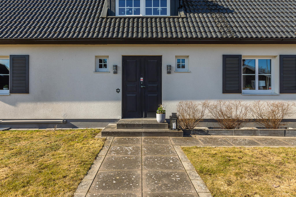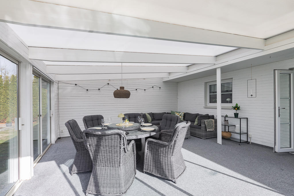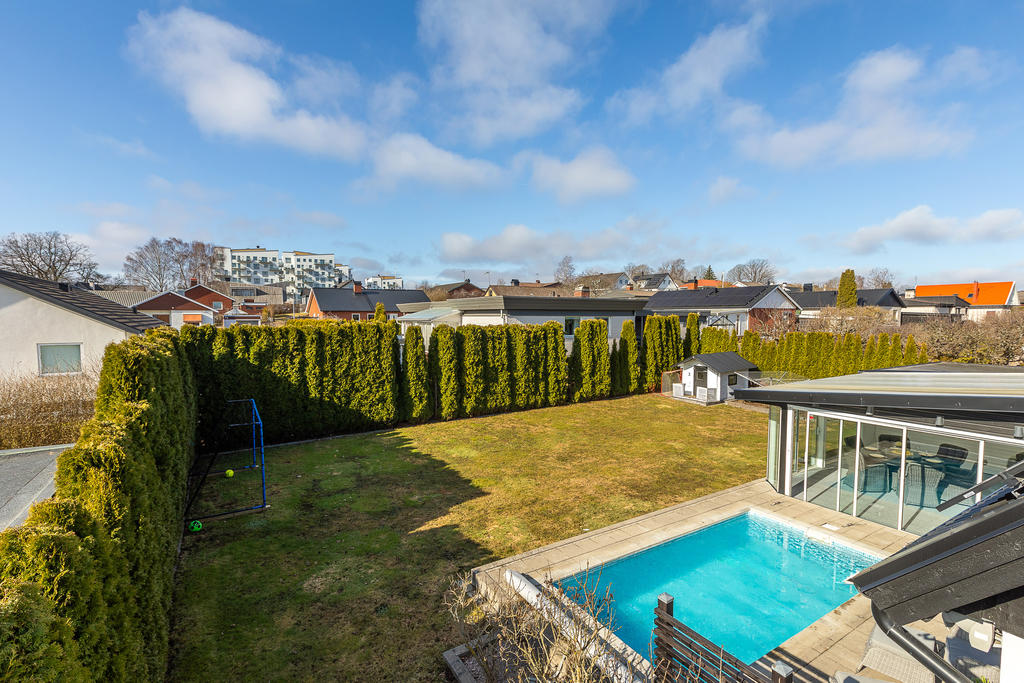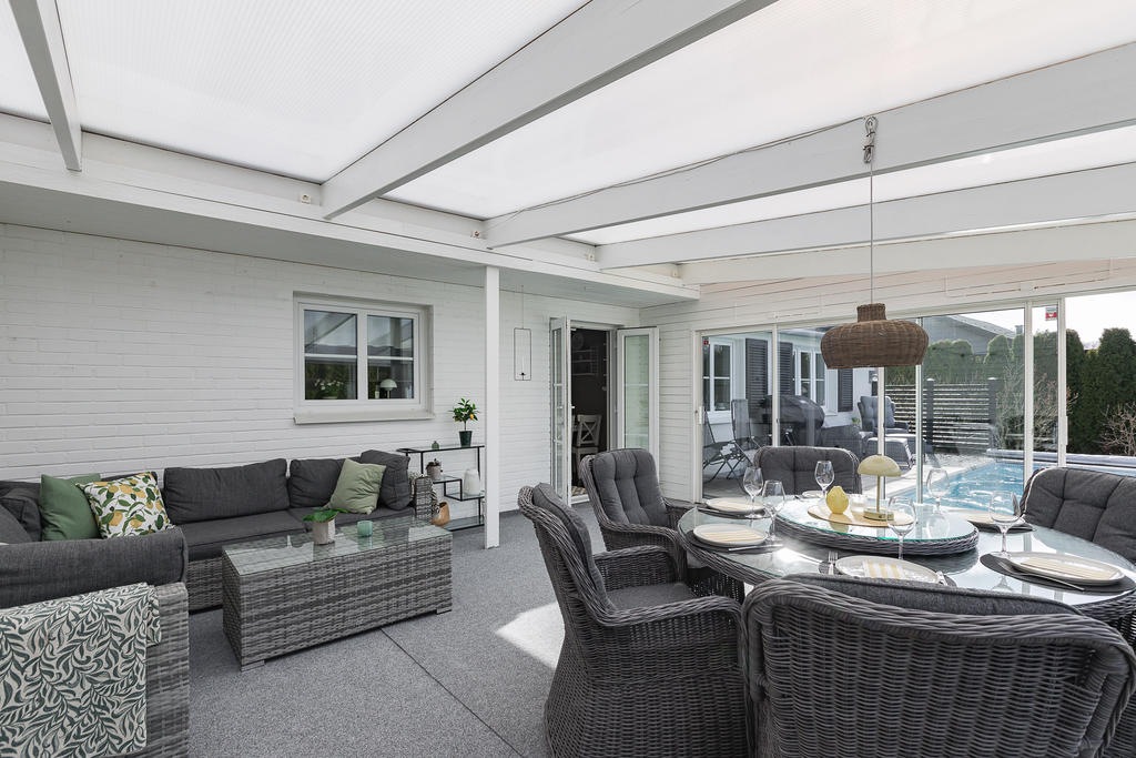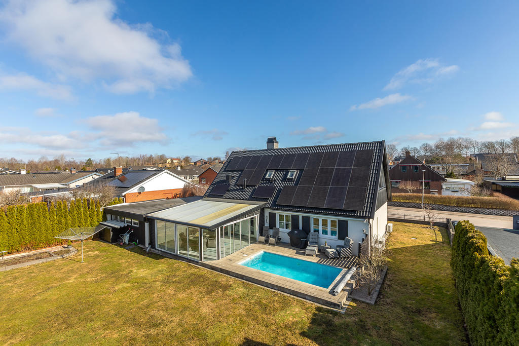 Poolvilla på Hov med insynskyddad tomt, inglasat uterum, dubbelgarage och dessutom bästa västerläge!