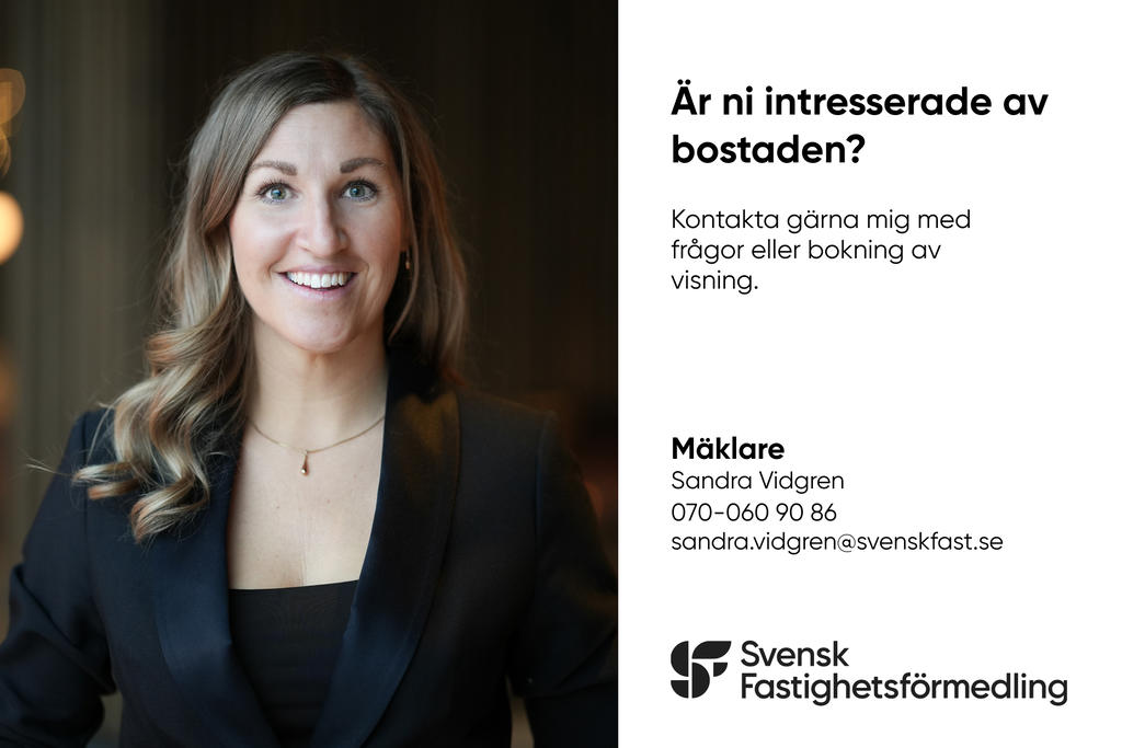 Med hjälp av vår boendekostnadskalkyl får du snabbt en uppfattning om vad den här bostaden skulle kosta dig per månad. Du kan enkelt justera siffrorna utifrån dina personliga förutsättningar. Kontakta mäklaren om du vill ha hjälp med beräkningen.