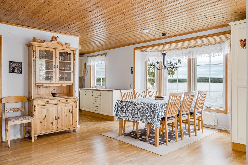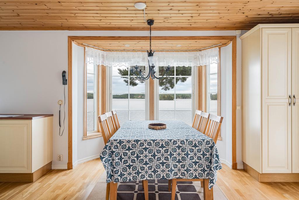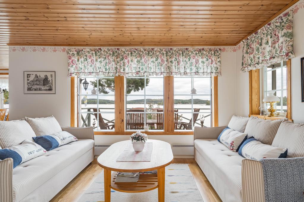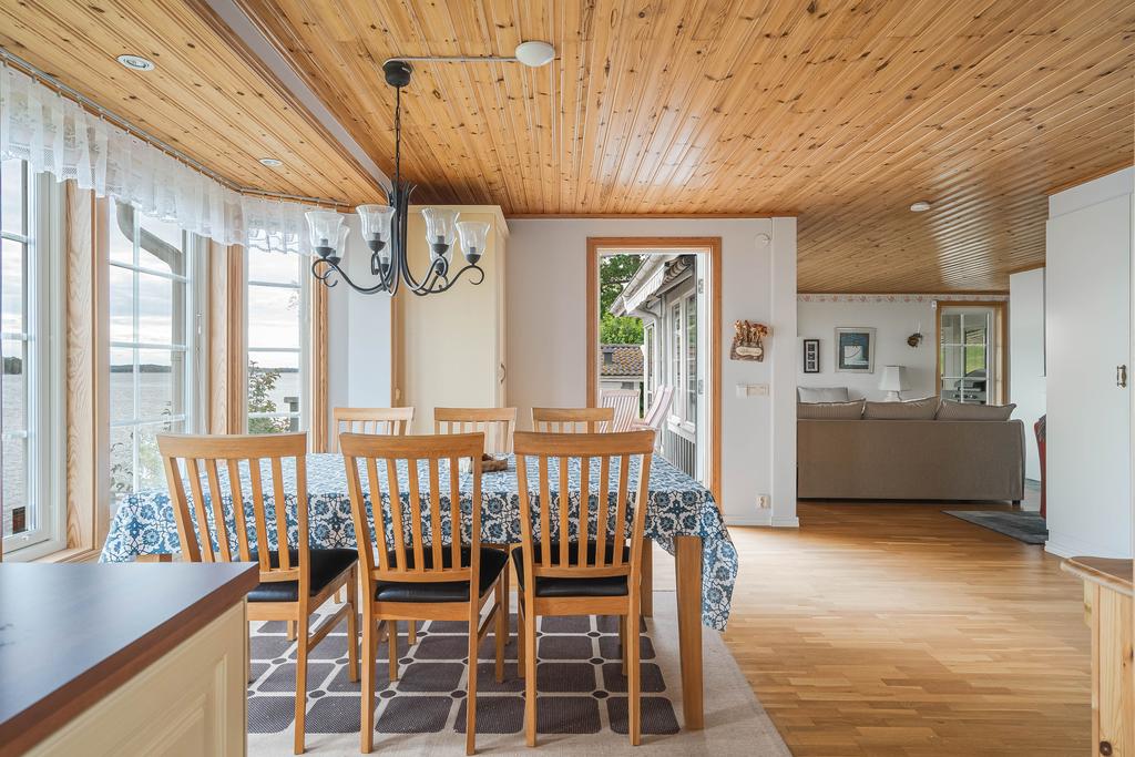 Bostadens yta ger plats för ett modernt och välskött kök med arbetsytor i vinkel och vy mot vattnet. Här går interiör ljusa toner med vitvaror i rostfritt och bra utrymmen överlag. Intill denna finns en naturlig matplats med generös yta för stora sällskap där man sitter rakt mot vattnet med vy från burspråk. Allrummet är även detta luftigt med tilltalande ljusflöden och fönster i tre väderstreck. Mitt i rummet ståtar en majestätisk eldstad med braskamin och det finns vidare utgång till ett inglasat uterum som ger fin extra rumslighet för umgänge att njuta av bedårande utsikter. Allrummen har även utgång mot en stor terrass mot vattnet som även förbinder gästhuset med en egenaltan runtom huskroppen. Utemiljön har fria utblickar och långsträckta vyer och man har även möblerbara ytor intill bryggan med ytterligare utemiljö. Gäststugan har ett ljust rum med tillhörande duschrum och bastu.