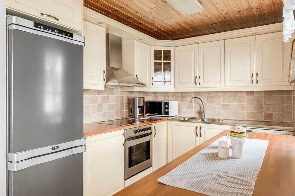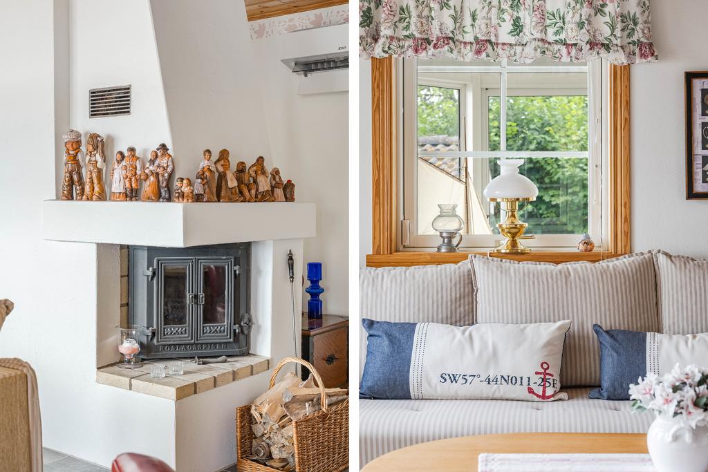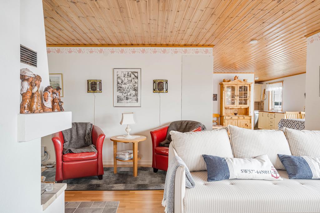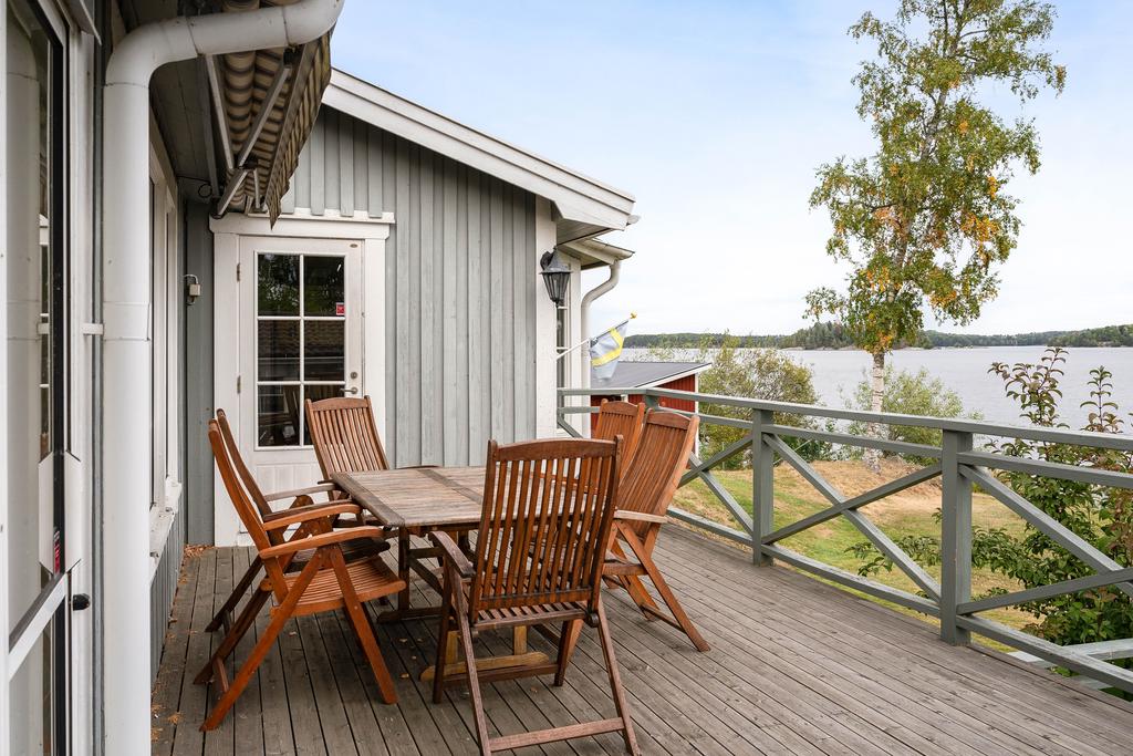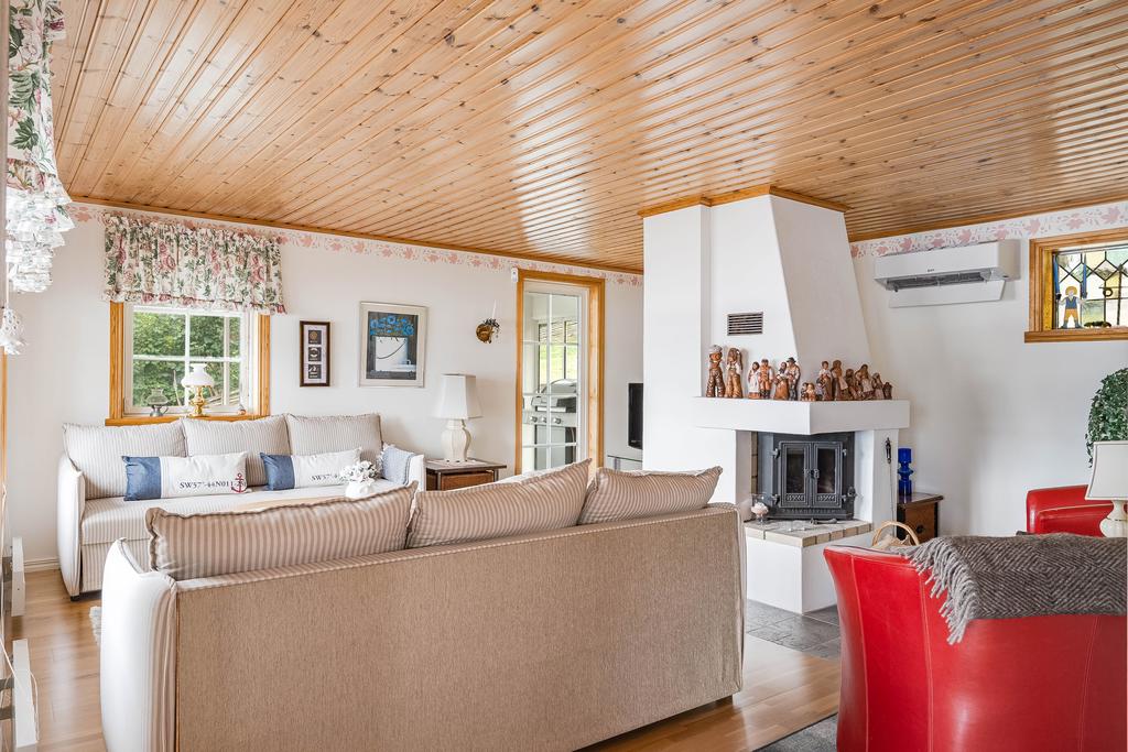 Bostadens yta ger plats för ett modernt och välskött kök med arbetsytor i vinkel och vy mot vattnet. Här går interiör ljusa toner med vitvaror i rostfritt och bra utrymmen överlag. Intill denna finns en naturlig matplats med generös yta för stora sällskap där man sitter rakt mot vattnet med vy från burspråk. Allrummet är även detta luftigt med tilltalande ljusflöden och fönster i tre väderstreck. Mitt i rummet ståtar en majestätisk eldstad med braskamin och det finns vidare utgång till ett inglasat uterum som ger fin extra rumslighet för umgänge att njuta av bedårande utsikter. Allrummen har även utgång mot en stor terrass mot vattnet som även förbinder gästhuset med en egenaltan runtom huskroppen. Utemiljön har fria utblickar och långsträckta vyer och man har även möblerbara ytor intill bryggan med ytterligare utemiljö. Gäststugan har ett ljust rum med tillhörande duschrum och bastu.