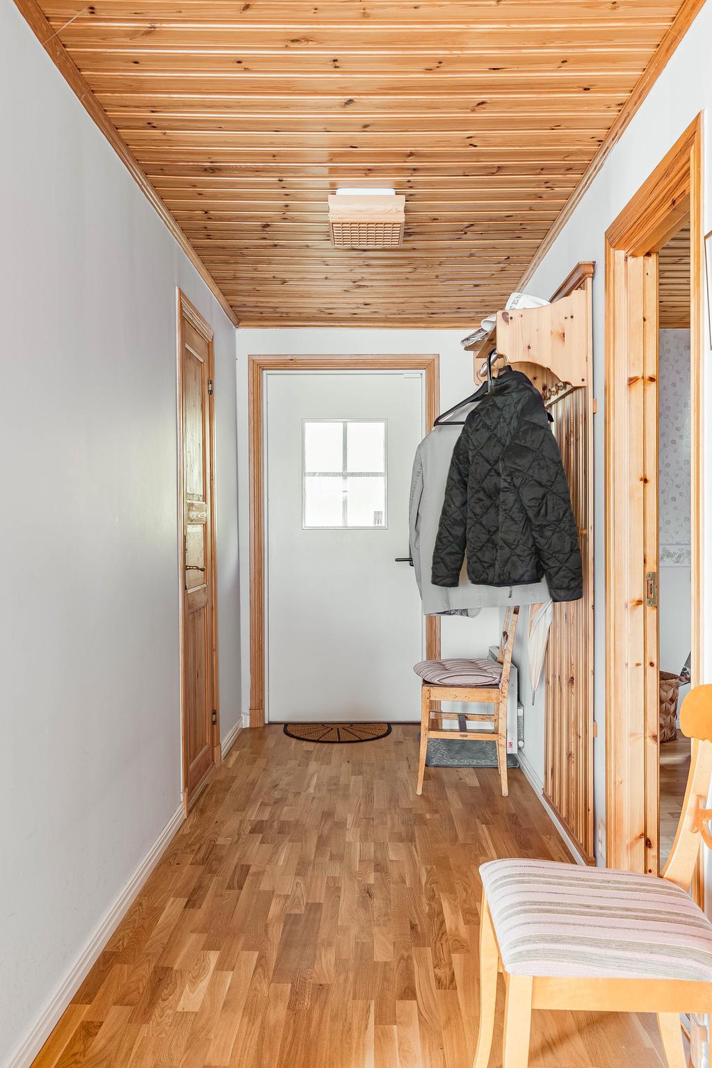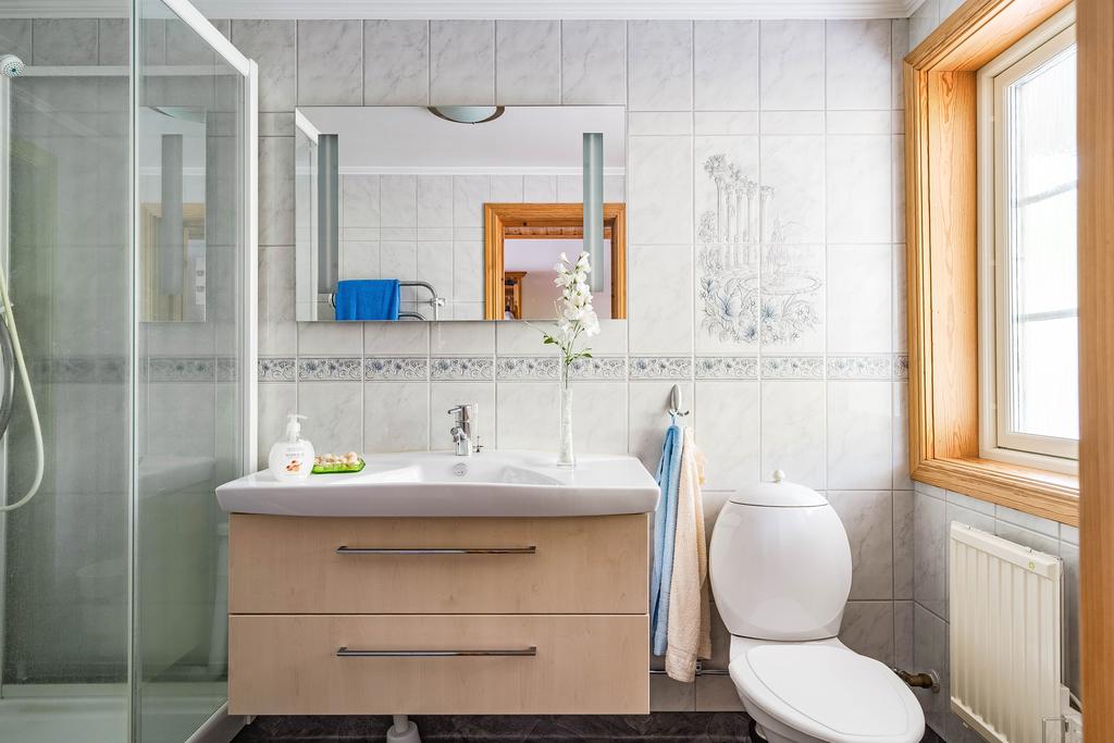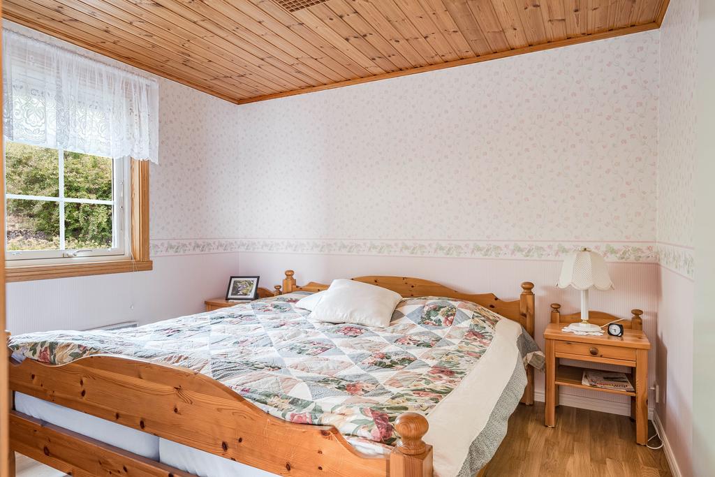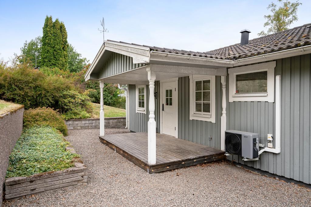 Husens inre delar ger gott om plats för parallella sällskap med extra rum i gästhus och den vackra tomten omfattar hela 1 558 kvm med både plana gräsytor och en mjuk sluttning från vägen. Här finns parkeringsyta och ett fristående garage intill tomten, med servitut, och vidare en separat bod för förvaring. En stensatt gång med belysning leder i slingrade steg ner mot entrésidan med access till huset via förstukvist under tak. Här välkomnas man vidare in i en hall med kapphängare och access till ett helkaklat badrum med dusch. Två sovrum är placerade i fil såsom varav ett med gott om plats för dubbelsäng och med platsbyggda garderober och det andra något mindre.