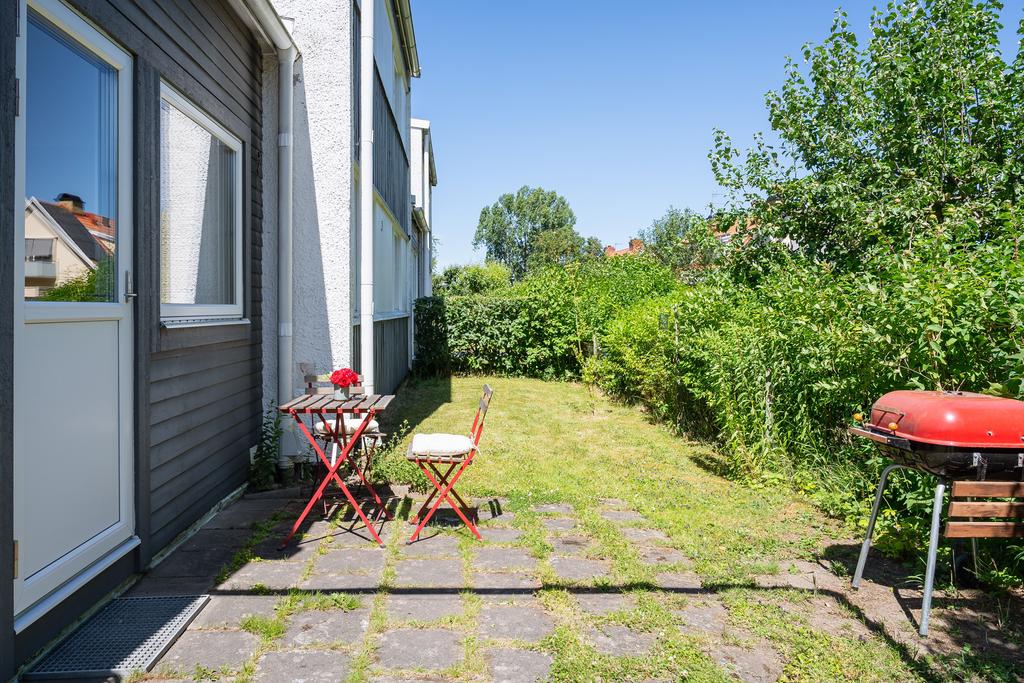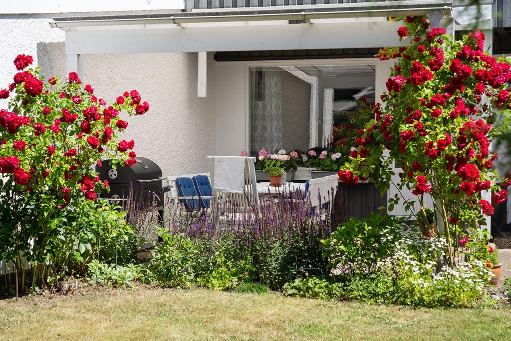 blomster och grönska i det soliga västläget och det ryms även en grästäppa som inramas av