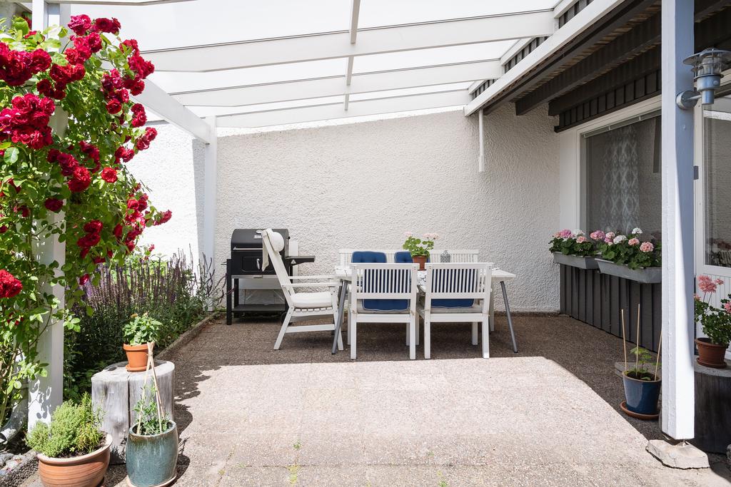 Trädgården är mysig och lättskött med den trevliga uteplatsen under tak. Här frodas