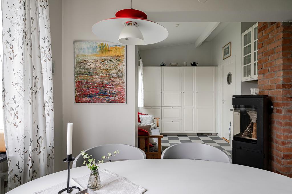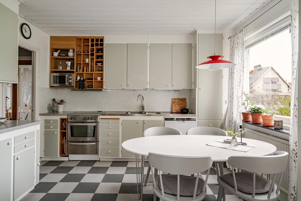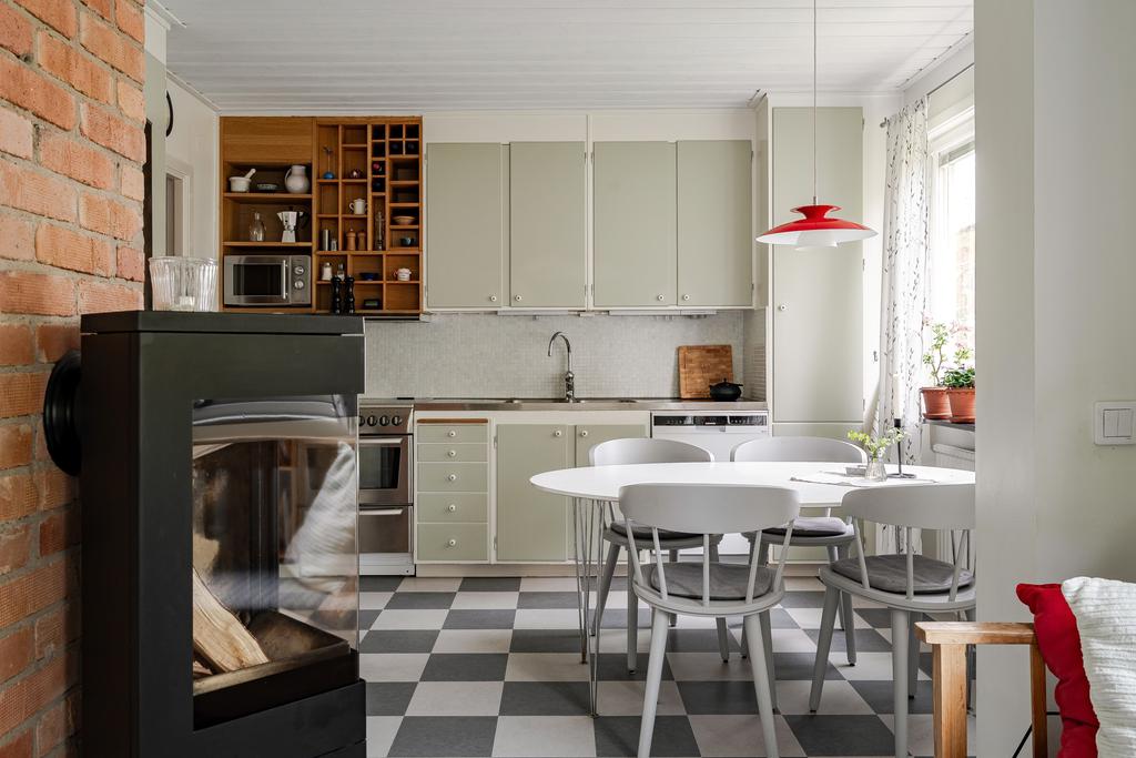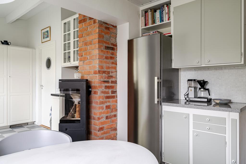 stilren känsla för husets ursprung där man har både matplats och funktionella köksdelar. Här