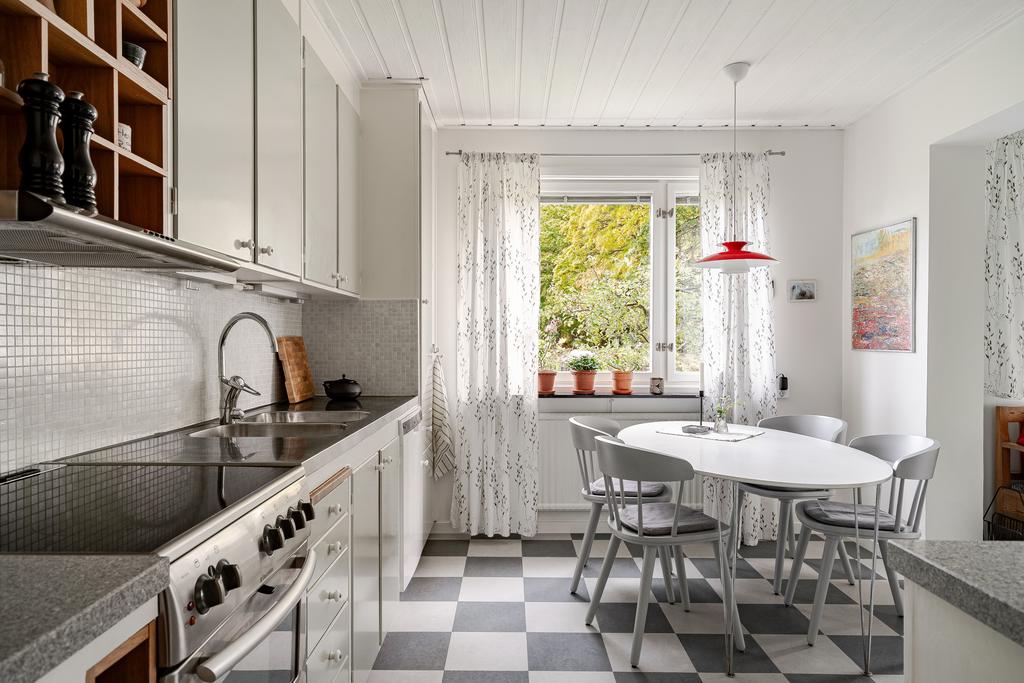 tillgång till utemiljön på båda sidor om huset. Köket är ytterst trivsamt med renoverad yta i