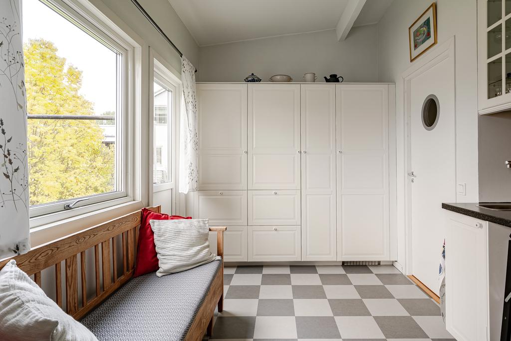Härifrån har man även utgång till en skyddad uteplats med förmiddagssol.