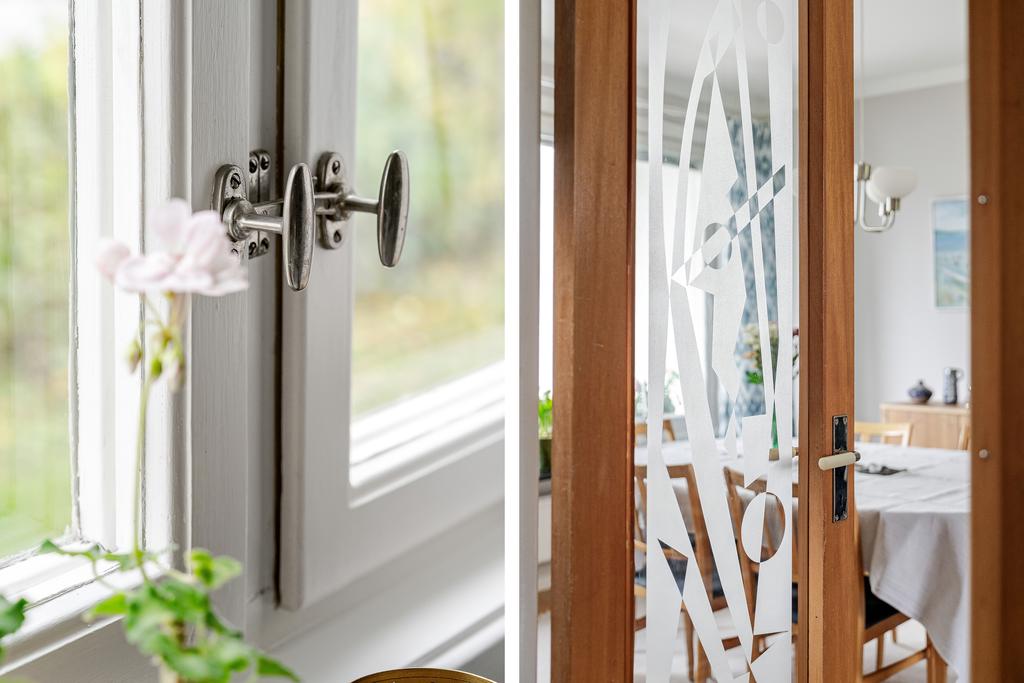 innerdörrar med glas samt blyinfattade fönster bidrar till en väbevarad känsla som genomgår