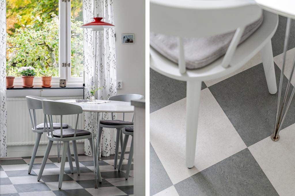 går färgskala i ljust gråa toner med schackrutiga golv och det ryms även en gemytlig