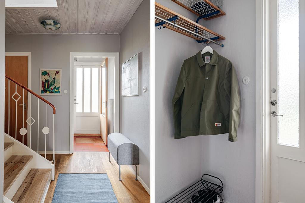 entrésida med en ljus hall med utrymme för ytterkläder samt access till WC. Redan vid första