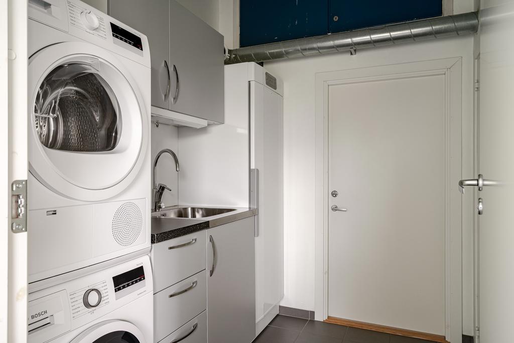 och en funktionsvägg med vidare anslutning till en praktisk tvättstuga, förråd och garaget.