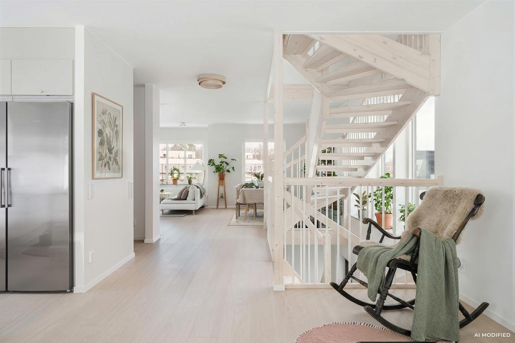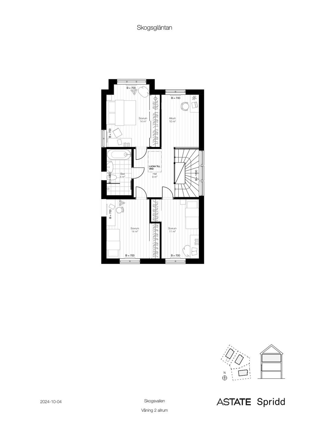 En trappa upp ryms de mer familjära delarna med hela fyra möjliga sovrum av varierad karaktär och storlek, fördelade i varsitt hörn av huskroppen. Varje rum har förvaring och otroligt härliga vyer från sina olika lägen och de stora fönstren som återfinns även här. Översta planet ger även plats för ytterligare ett badrum med badkar och dusch eller tvättavdelning. Till varje bostad ges även trädgårdstäppa med möjlighet till uteplats med områdets bästa läge mot skogens kant och allmänning. Utförandet i sin helhet är påkostat och kvalitativt med möjligheter för egna tillval där sobert skandinaviska toner och luftigt ljus präglar husen.