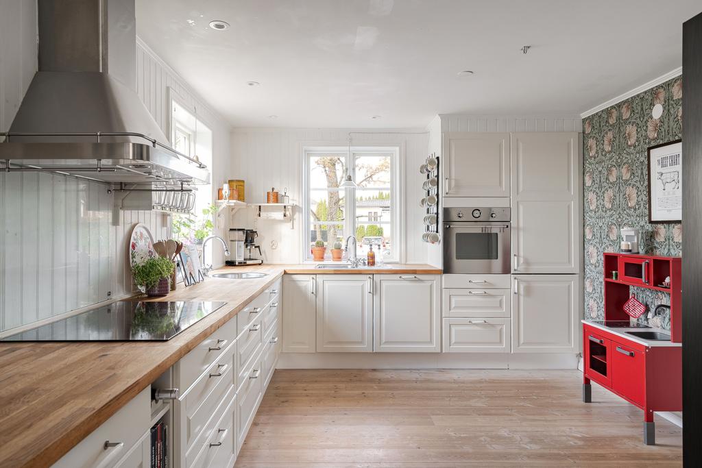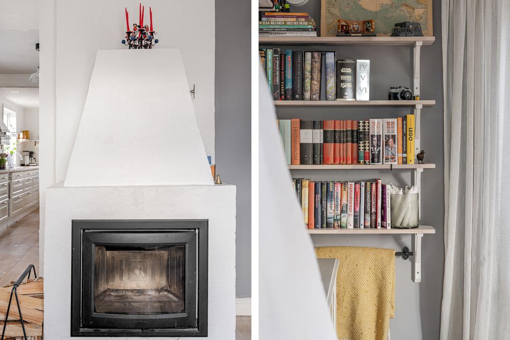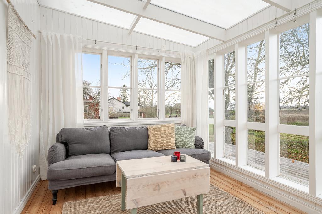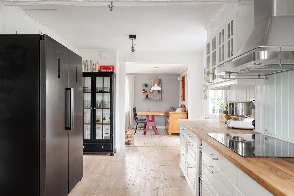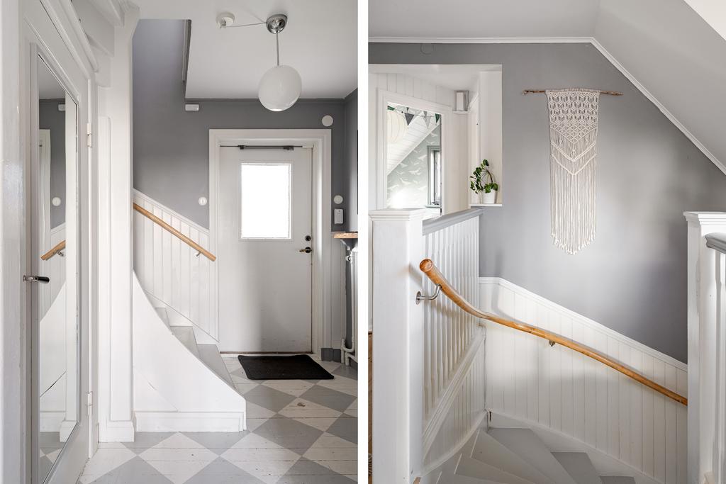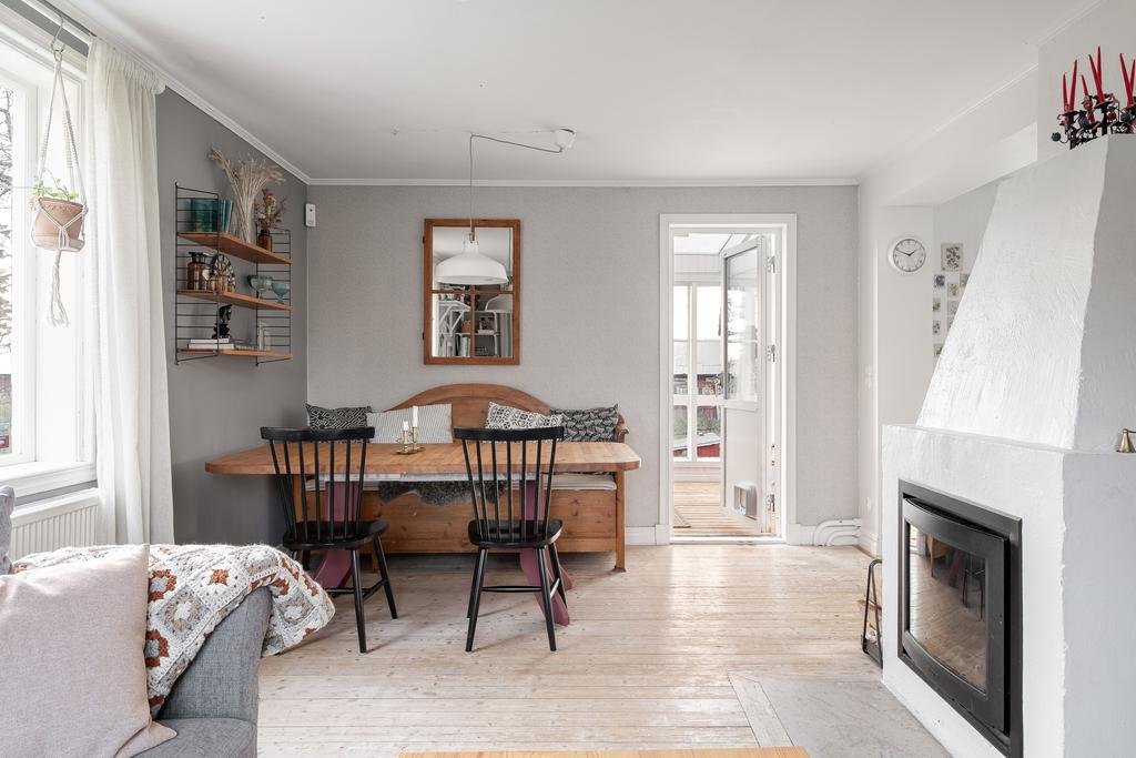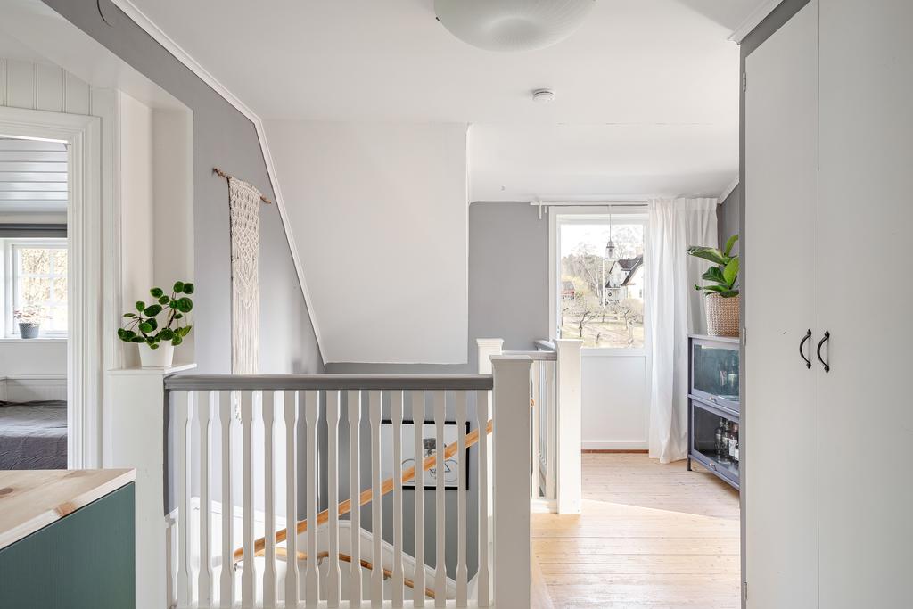 Huset har moderniserats löpande i en stilsäker anda där äldre detaljer möter uppdaterade materialval. Entréplanet rymmer sociala ytor, badrum och ett extra utrymme i det inglasade uterummet. Köket är lantligt och vackert renoverat med ljusa material, dubbla hoar och två fönster som ger härligt ljusinsläpp. Inredningen består av redahylla, pärlspont och gedigna, såpade trägolv som löper genom hela våningsplanet. Intill köket finns en naturlig matplats som sedan övergår i ett ombonat allrum med en stämningsfull braskamin. Från entréplanet nås även uterummet, där man kan njuta av utsikten och årstidernas skiftningar. Badrummet, renoverat 2023, är helkaklat i vitt och har klinkergolv, badkar och ett fint ljusinsläpp – tidlöst och modernt.
