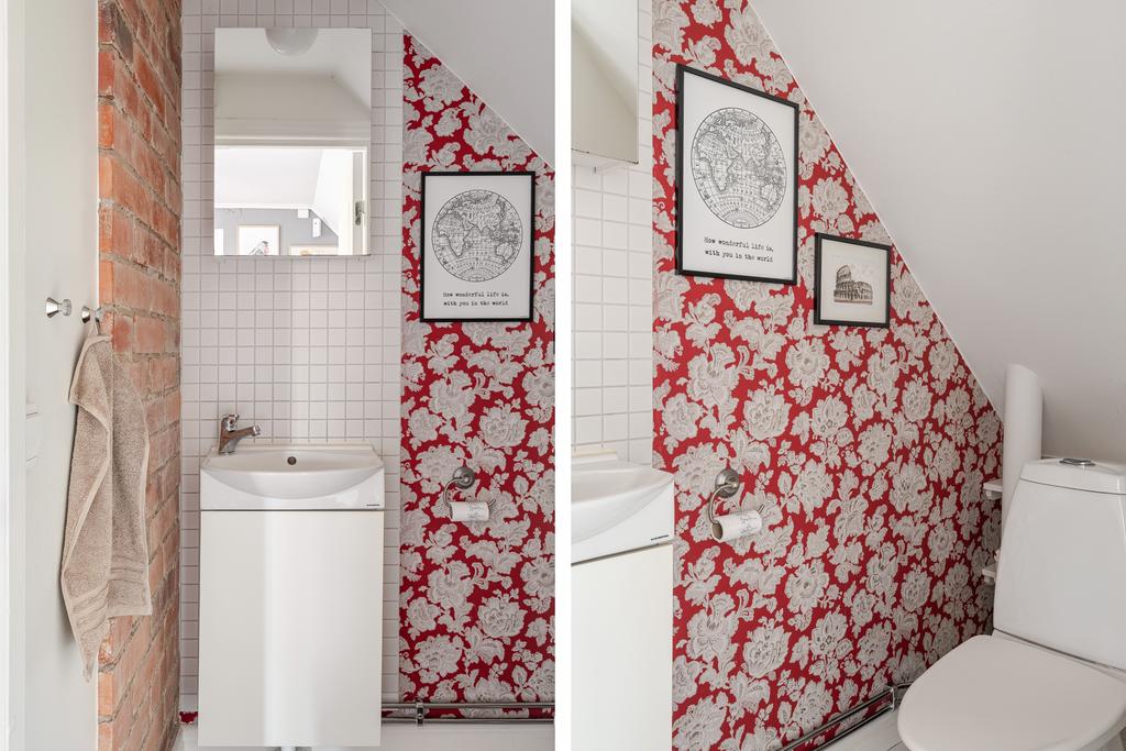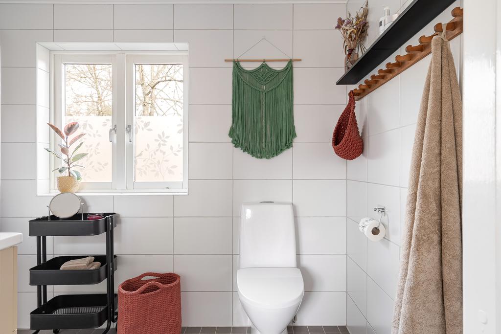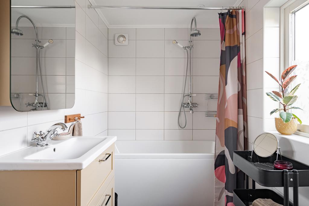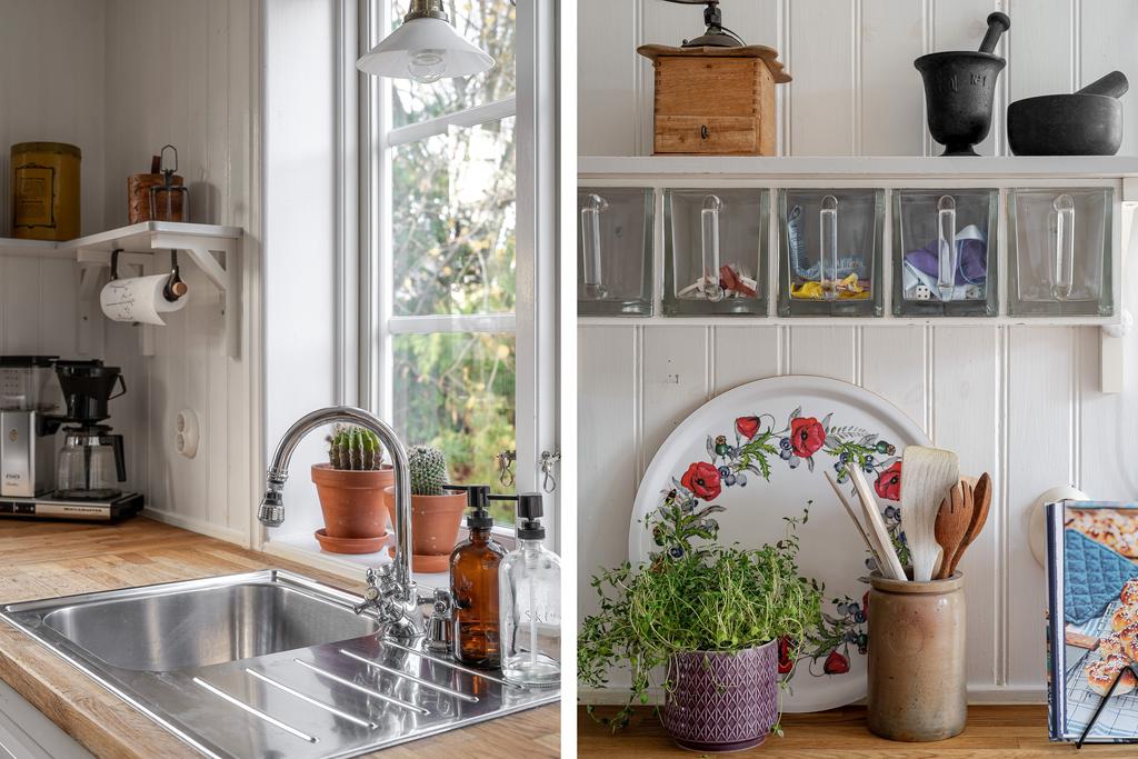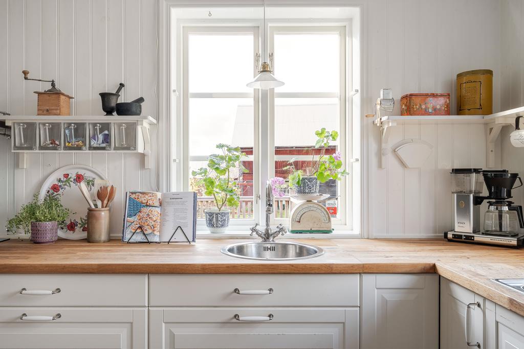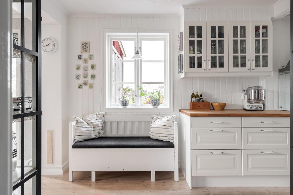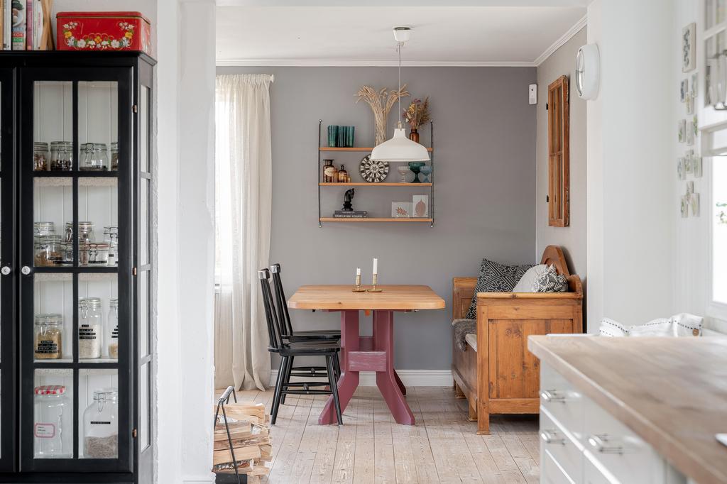 Huset har moderniserats löpande i en stilsäker anda där äldre detaljer möter uppdaterade materialval. Entréplanet rymmer sociala ytor, badrum och ett extra utrymme i det inglasade uterummet. Köket är lantligt och vackert renoverat med ljusa material, dubbla hoar och två fönster som ger härligt ljusinsläpp. Inredningen består av redahylla, pärlspont och gedigna, såpade trägolv som löper genom hela våningsplanet. Intill köket finns en naturlig matplats som sedan övergår i ett ombonat allrum med en stämningsfull braskamin. Från entréplanet nås även uterummet, där man kan njuta av utsikten och årstidernas skiftningar. Badrummet, renoverat 2023, är helkaklat i vitt och har klinkergolv, badkar och ett fint ljusinsläpp – tidlöst och modernt.