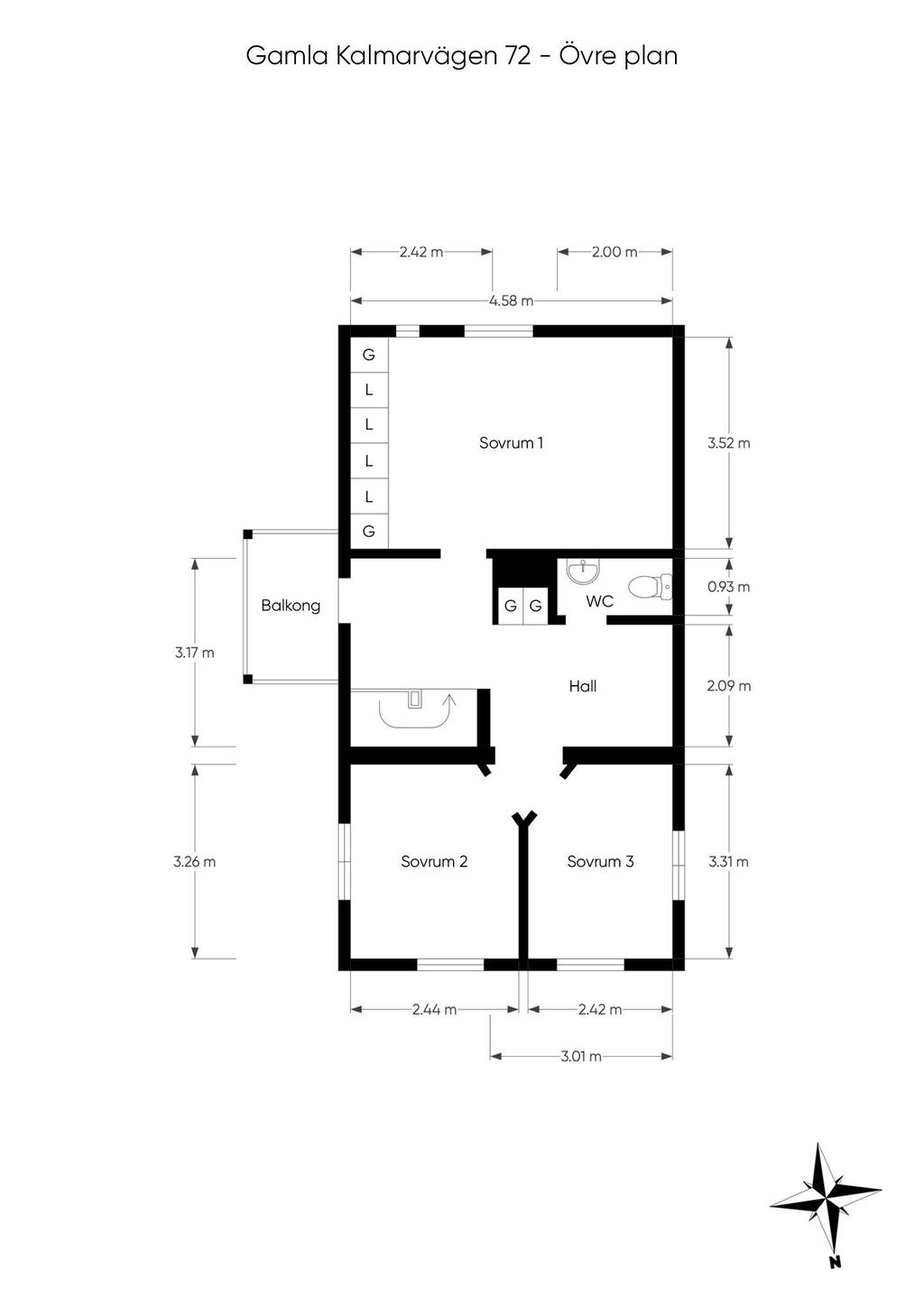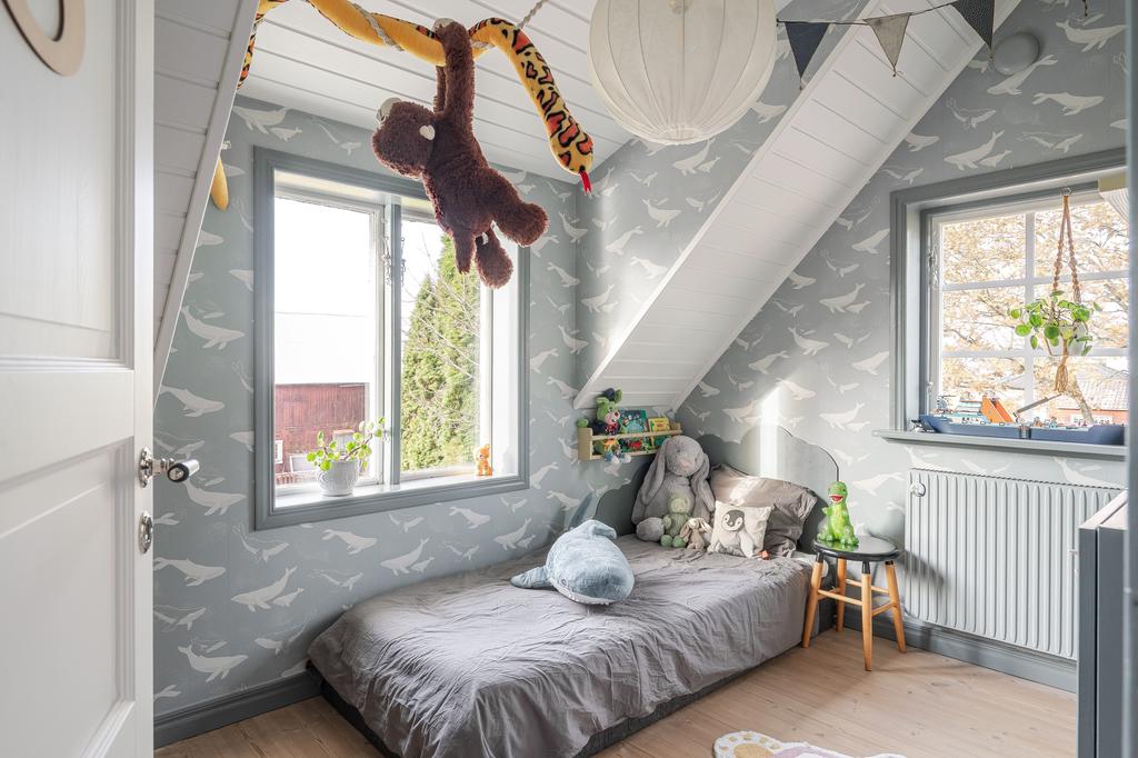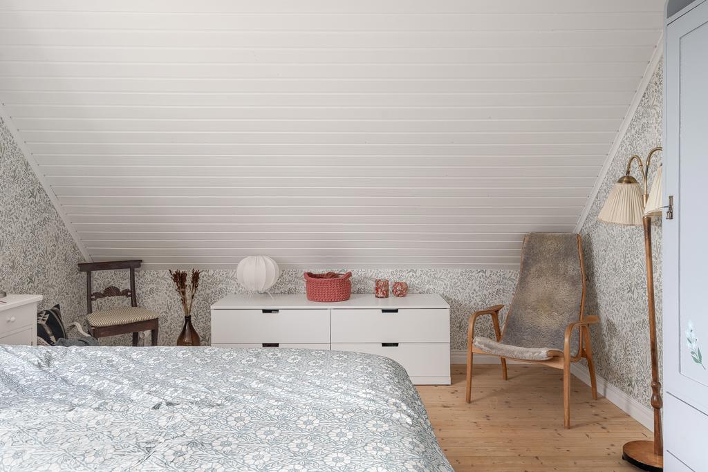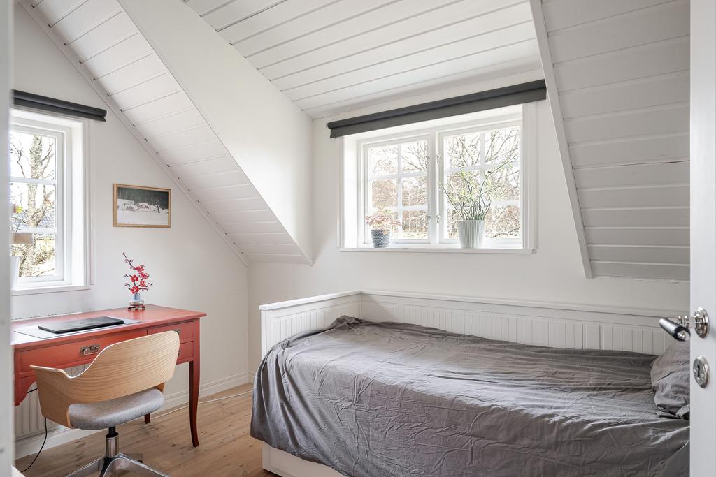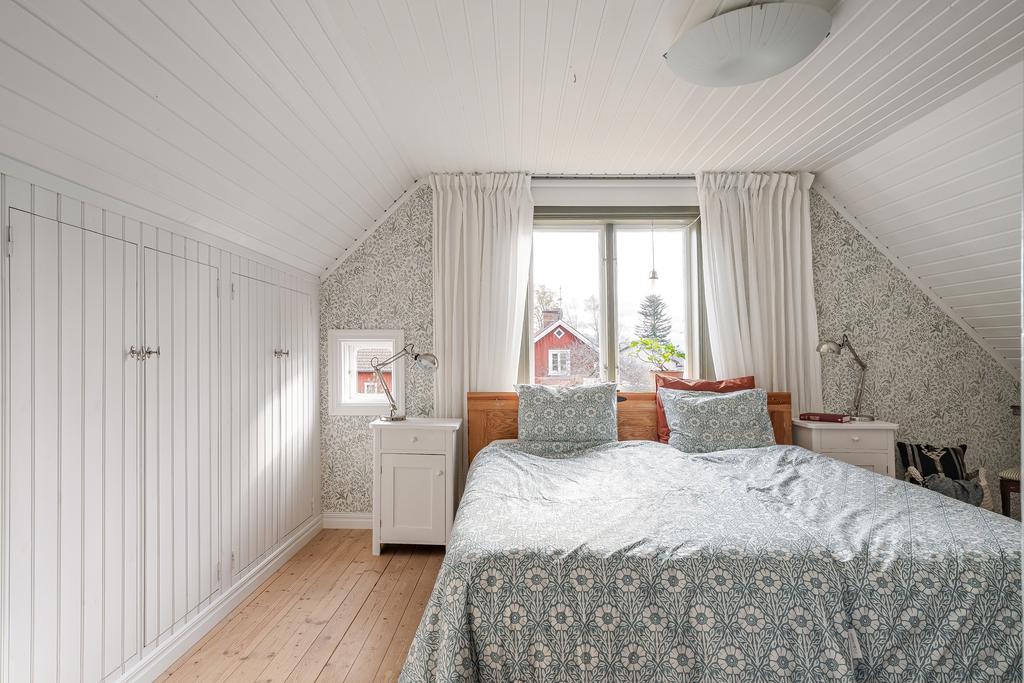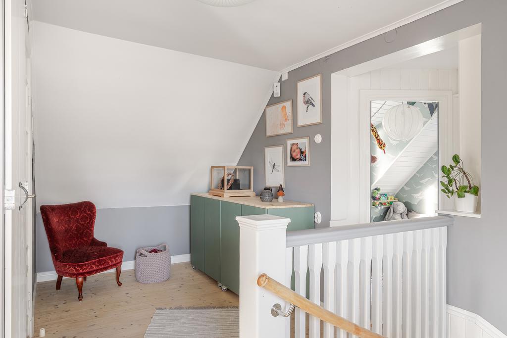 Det övre planet har ljus och trivsel från flera väderstreck. Hallen ovanför trappan kan möbleras som läshörna eller användas för extra förvaring, och här finns även en modern WC. Tre sovrum, två mindre och ett större master bedroom med god förvaring i kattvindarna, ryms under det mysiga snedtaket.