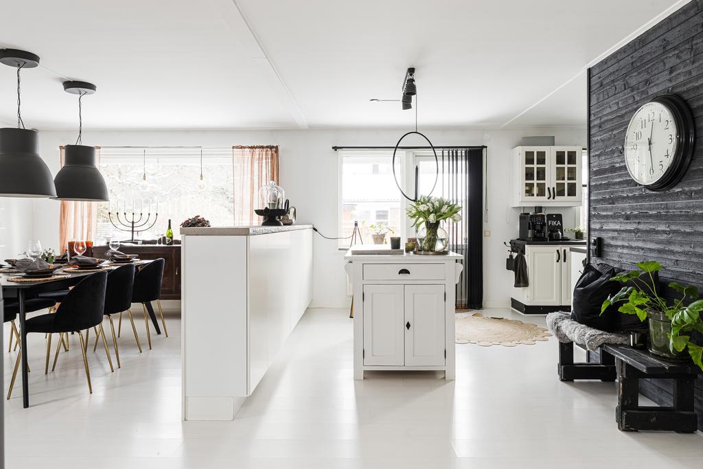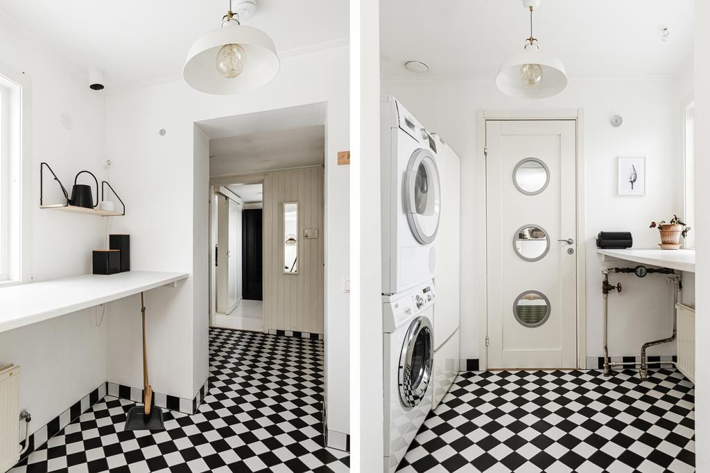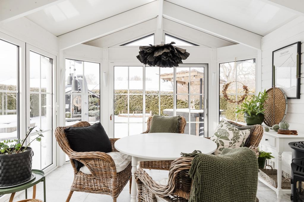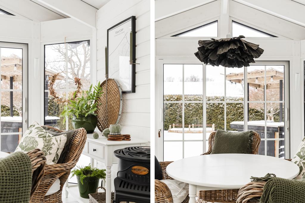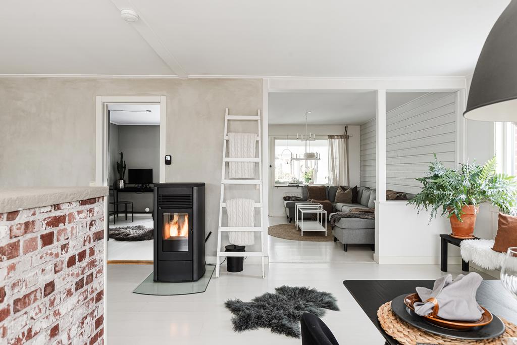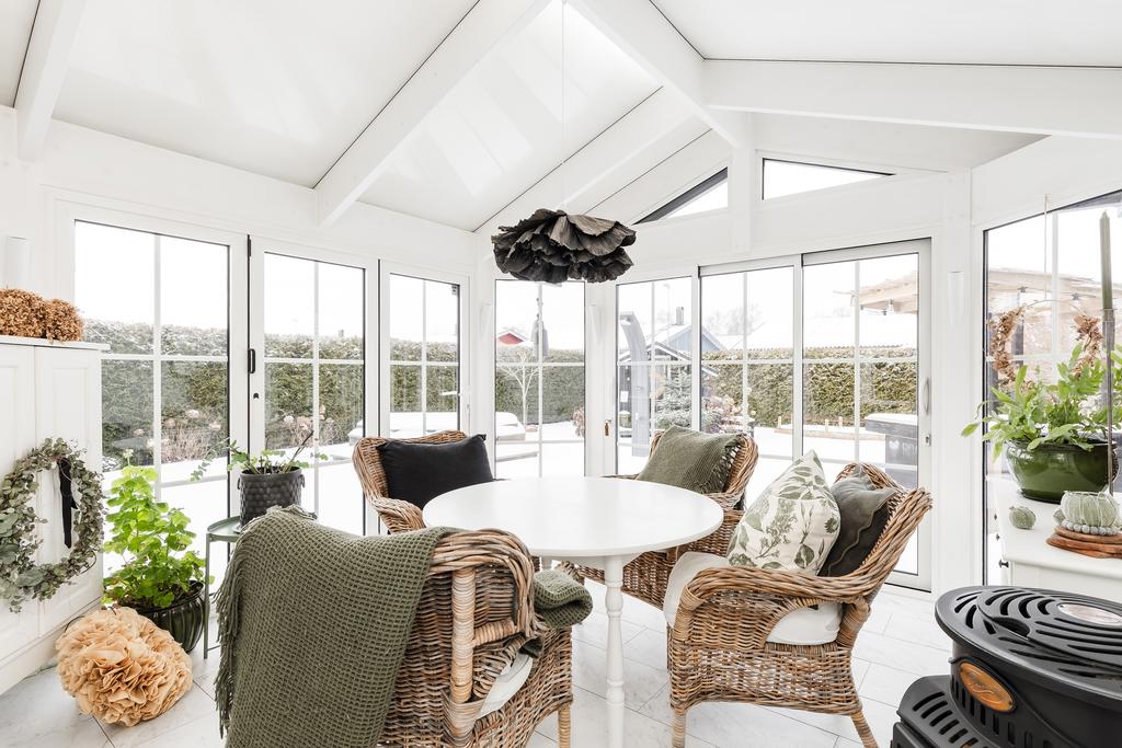 Vidare in i hemmet ges ett härligt utrymme för de mer sociala delarna med allrum, matsal och kök. Rumsligheten är öppen och ljus med generös plats för ett större matbord och med ett vardagsrum intill som sedan ansluter mot ett fantastiskt uterum mot trädgården. Centralt placerat finns en gemytlig braskamin och helheten har en ombonad känsla med ljus från flera håll och vy mot grönskan utanför. Köket är fint planerat med gott om arbetsyta, serveringsbänkar och trivsam öppenhet mot matsalen. Från köket ansluter sedan en funktionell tvättstuga med vidare access till sidobyggnaden.