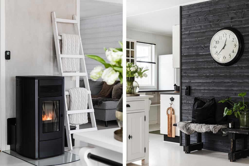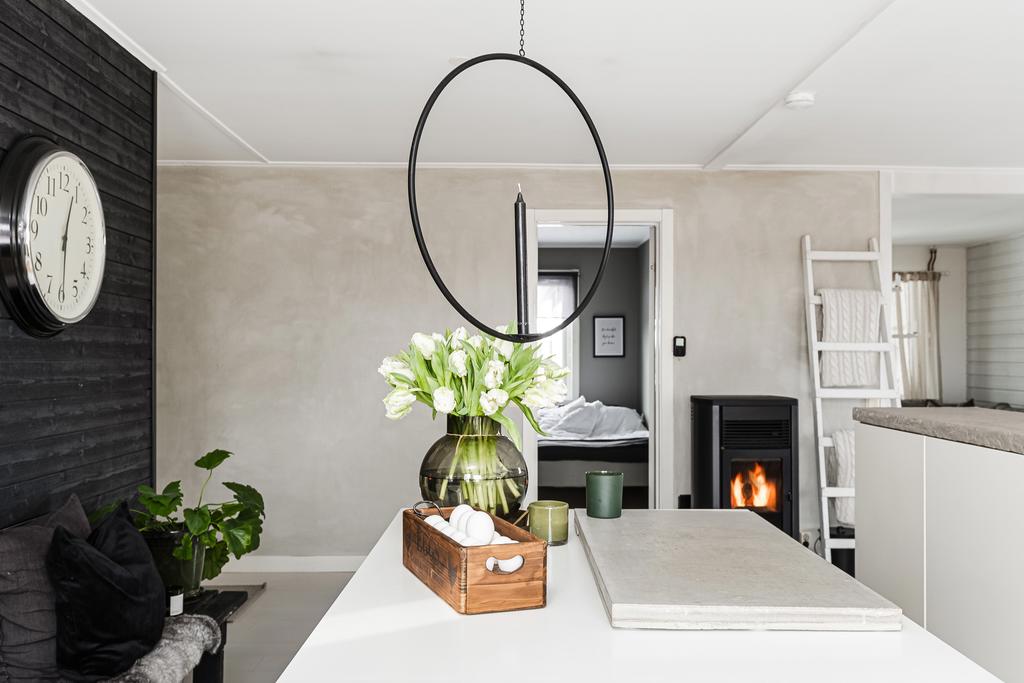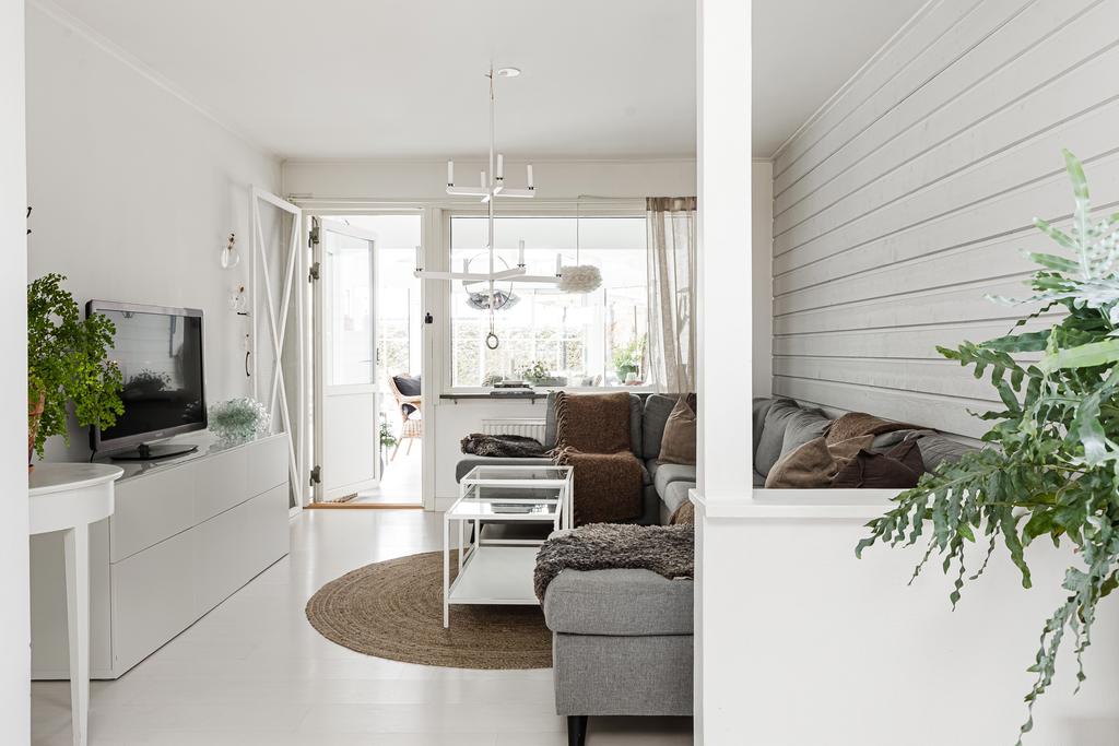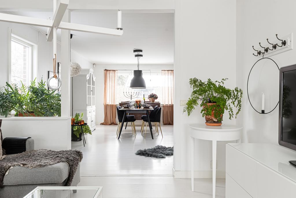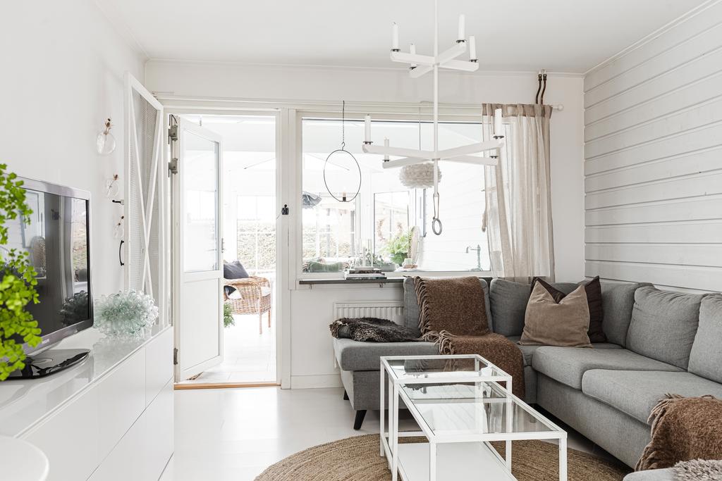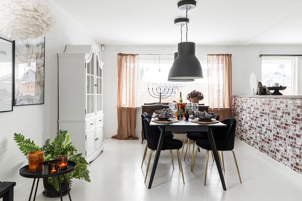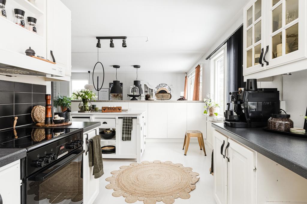 Vidare in i hemmet ges ett härligt utrymme för de mer sociala delarna med allrum, matsal och kök. Rumsligheten är öppen och ljus med generös plats för ett större matbord och med ett vardagsrum intill som sedan ansluter mot ett fantastiskt uterum mot trädgården. Centralt placerat finns en gemytlig braskamin och helheten har en ombonad känsla med ljus från flera håll och vy mot grönskan utanför. Köket är fint planerat med gott om arbetsyta, serveringsbänkar och trivsam öppenhet mot matsalen. Från köket ansluter sedan en funktionell tvättstuga med vidare access till sidobyggnaden.