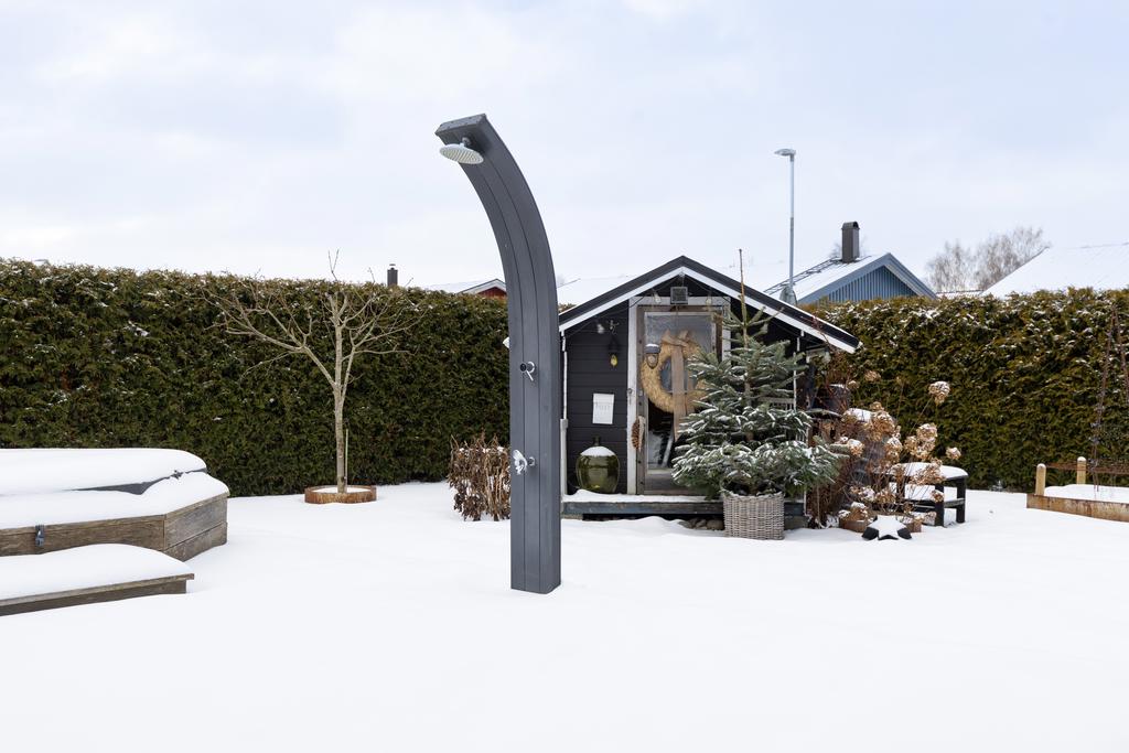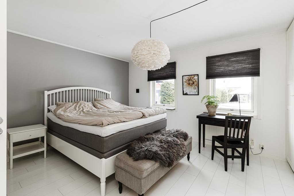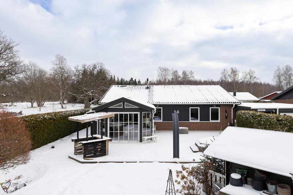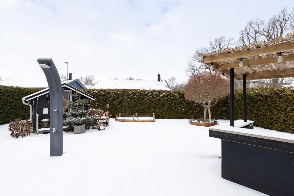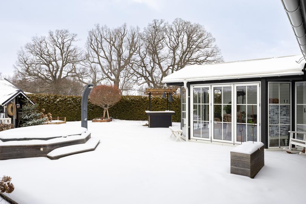 Helheten är flexibel och gästvänlig med enhetliga materialval och genomtänkt funktion. Utvändigt erbjuds den välskötta trädgårdens lummiga delar där man har terrass intill uterummet med grillplats och utedusch där det även finns utespa. Trädgården är prydlig och bjuder på både blomsterprakt och välordnad grönska med lekstuga och tomten löper även runt huset med uteplats även från köket vilket ger lyxiga ytor att njuta av som kan växlas efter säsong och väderlek även i utemiljön.