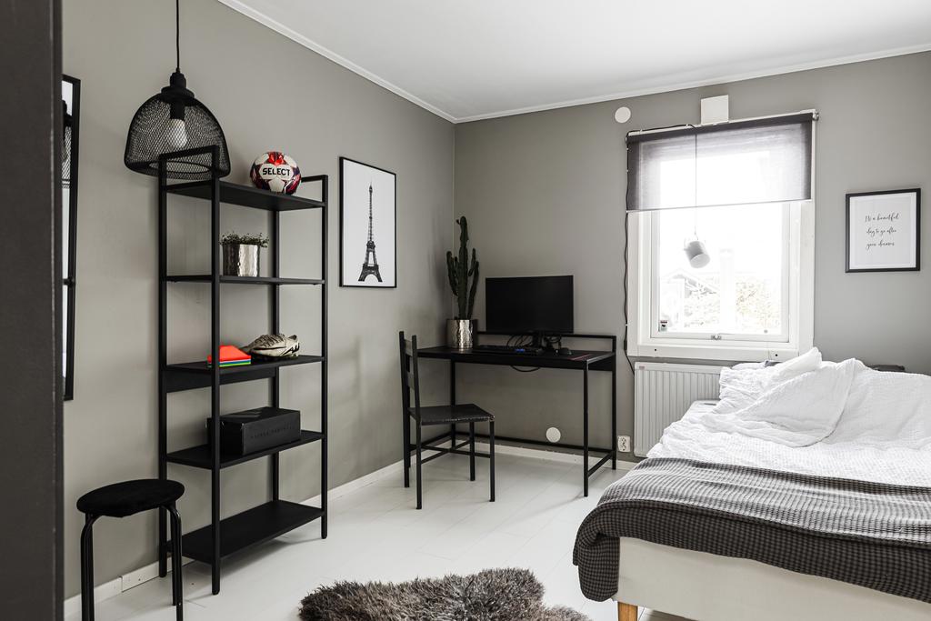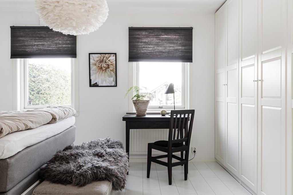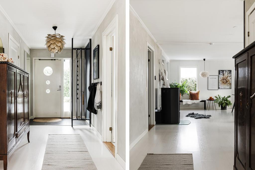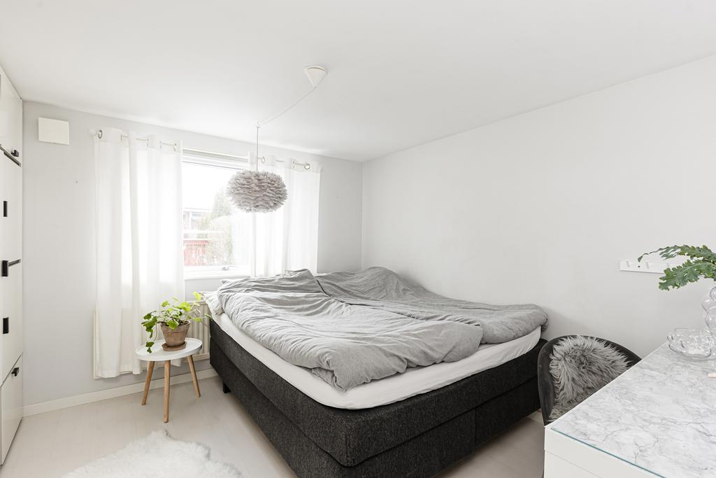 Entréhallen är ljus och luftig med plats för avhängning där både badrum och ett separat gäst WC är placerat i fil. Badrummet är modernt och helkaklat med både badkar och dusch samt härligt ljusinsläpp från fönster. Till vänster från hallen finns ett större sovrum med hel garderobsvägg och två fönster vilket även ger att man har möjlighet att dela av detta i två mindre sovrum vid behov. Ytterligare ett rymligt sovrum är placerat i samma del, även här med samma tilltalande karaktär och med garderober.