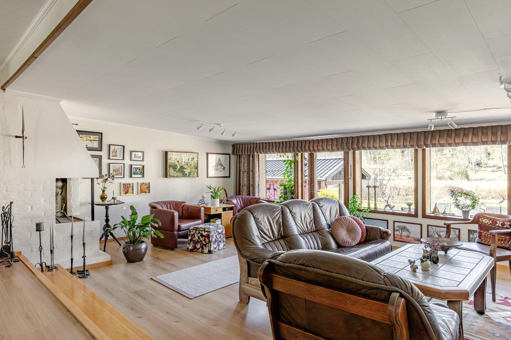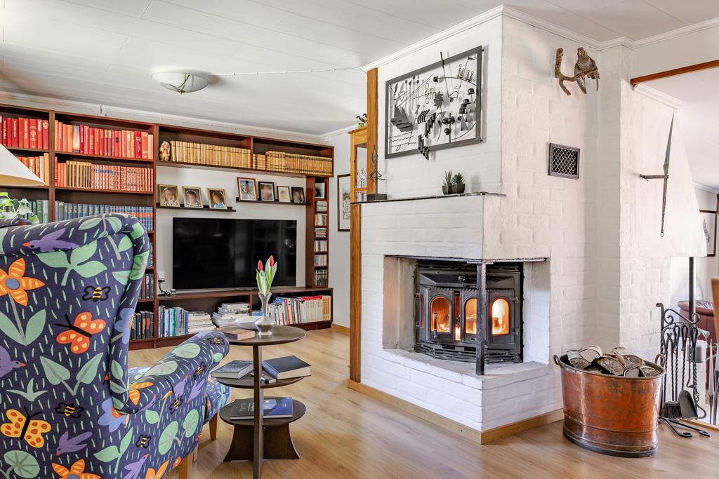 Sovrummet är ombonat med gott om plats samt med mycket utrymme i den stora, längsgående garderoben med praktisk skjutvägg. Vidare når man ett funktionellt arbetskök med stilren interiör i grått och vitvaror i rostfritt. Här finns det mesta man behöver för matlagningen och skåpsutrymmen där man har sällskapsdelarna fördelade intill i genomgående yta med härligt ljust från två håll. Den sociala delen rymmer en naturlig plats för matbord med generös yta med ytterligare rumsligheter för flera möblemang. Centralt i rummet ståtar en gemytlig öppen spis med braskamin och man har även utgång mot den ljuvliga utemiljön mot trädgårdssidan. Huset rymmer även ytterligare ett sovrum såsom gästrum eller kontor, samt biyta i källare och flera bodar på tomten.