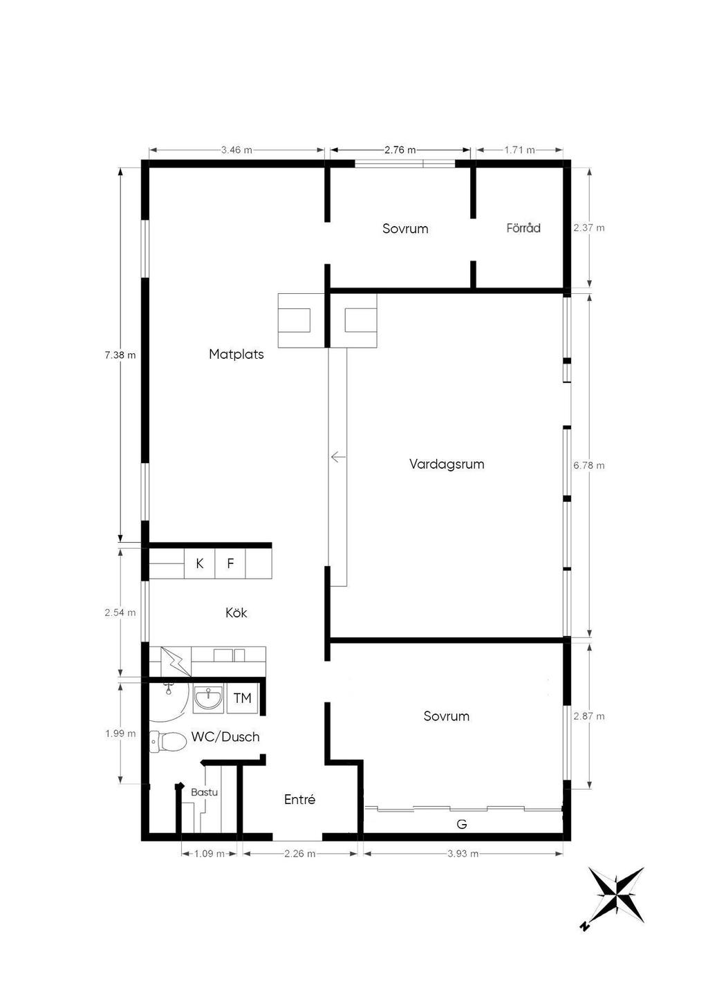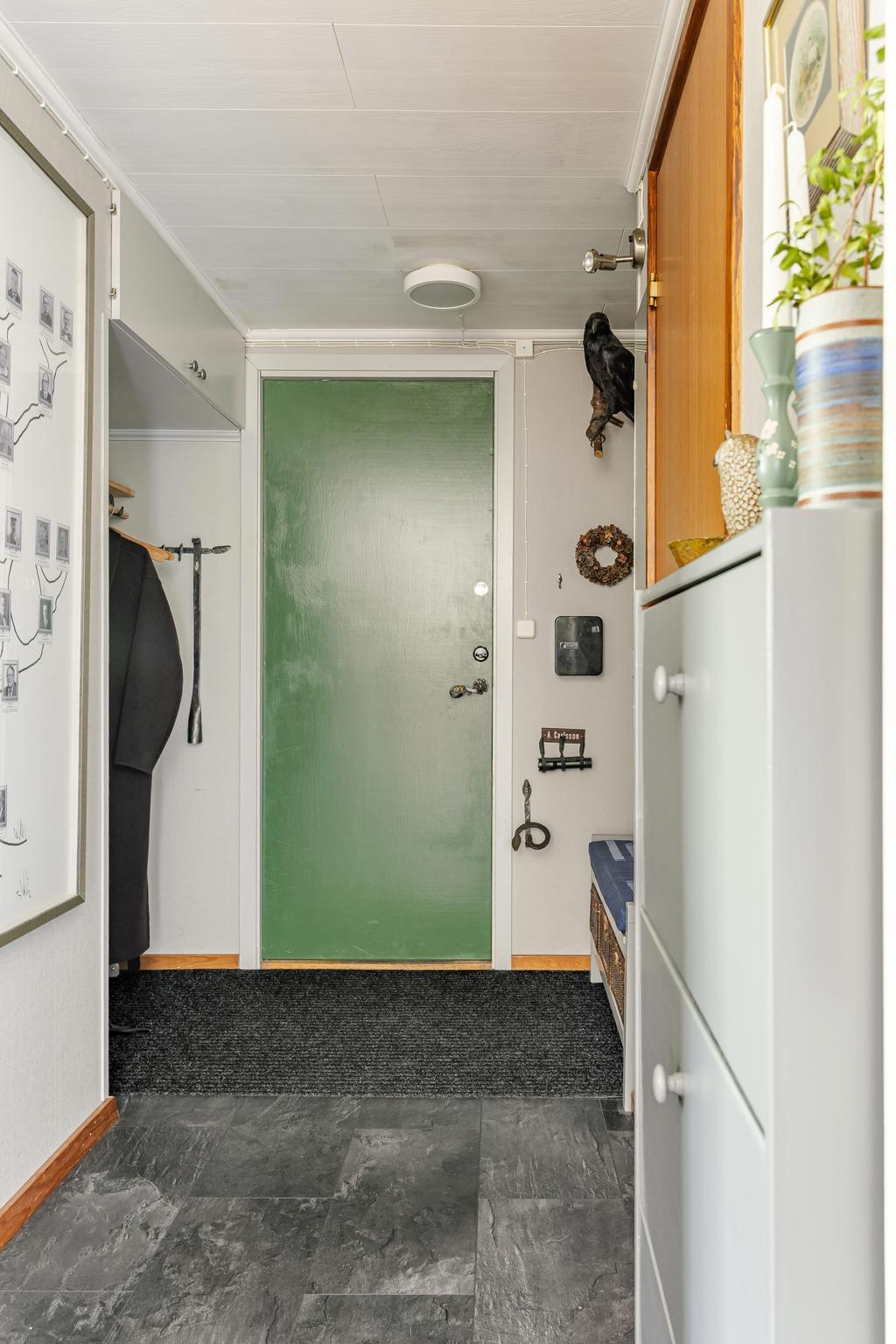 Entrésidan ger en vidbyggd infart med plats för flera bilar att parkera och man ges vidare access till huset via grind och en trivsam terrass som löper längs husets gavel. I hallen finns bra förvaring och möjlighet att sitta ned där man har ett modernt badrum till vänster och ett större sovrum till höger. Badrummet har dusch och egen tvättpelare med helkaklade ytor, golvvärme samt klinkergolv. Här finns också lyxen med egen bastu!
