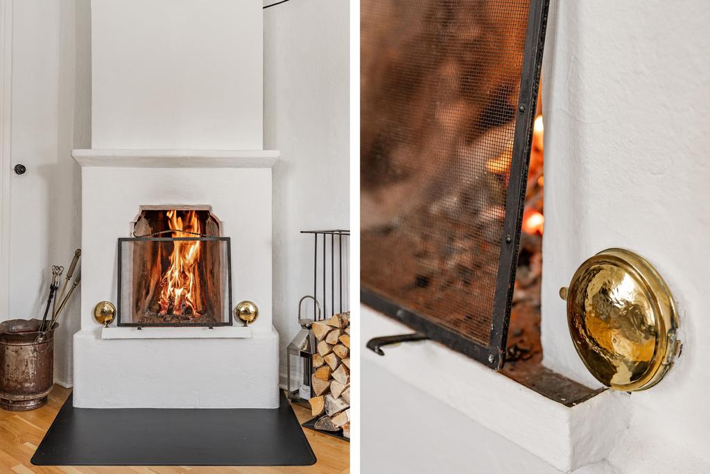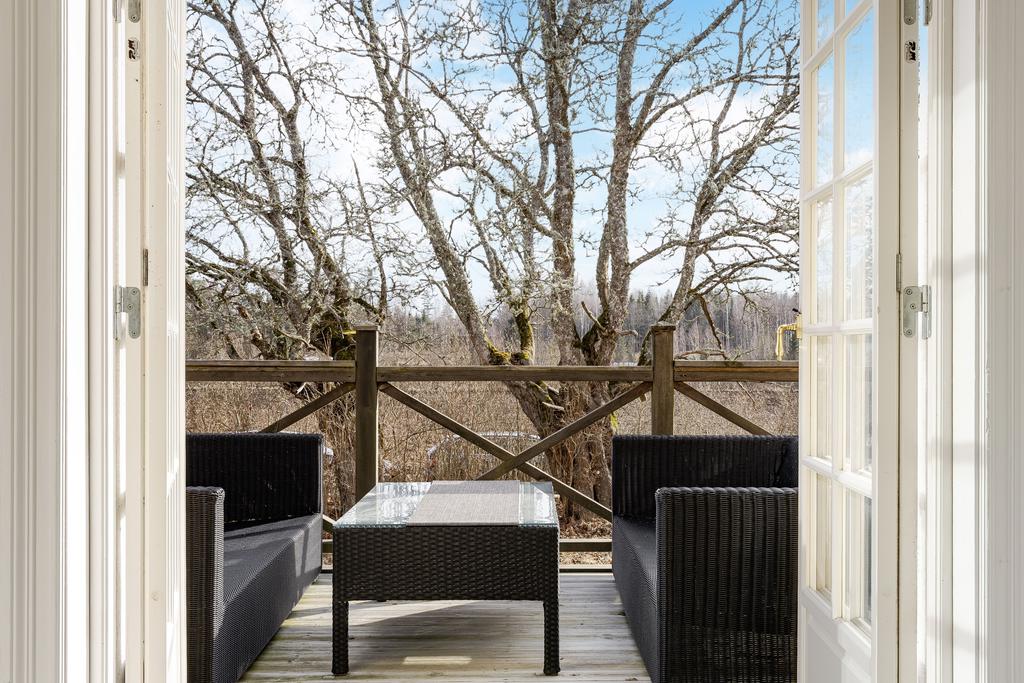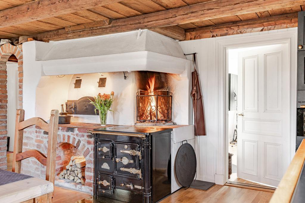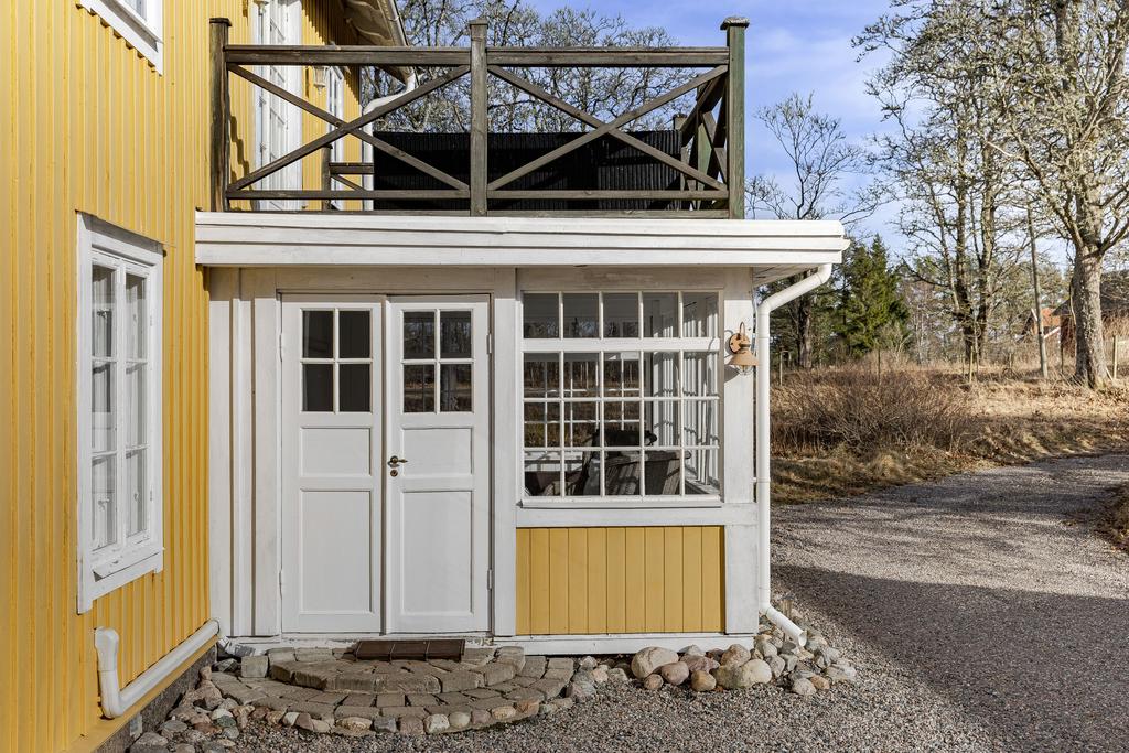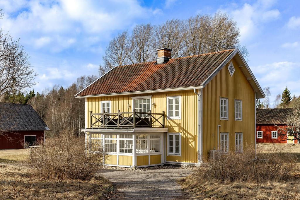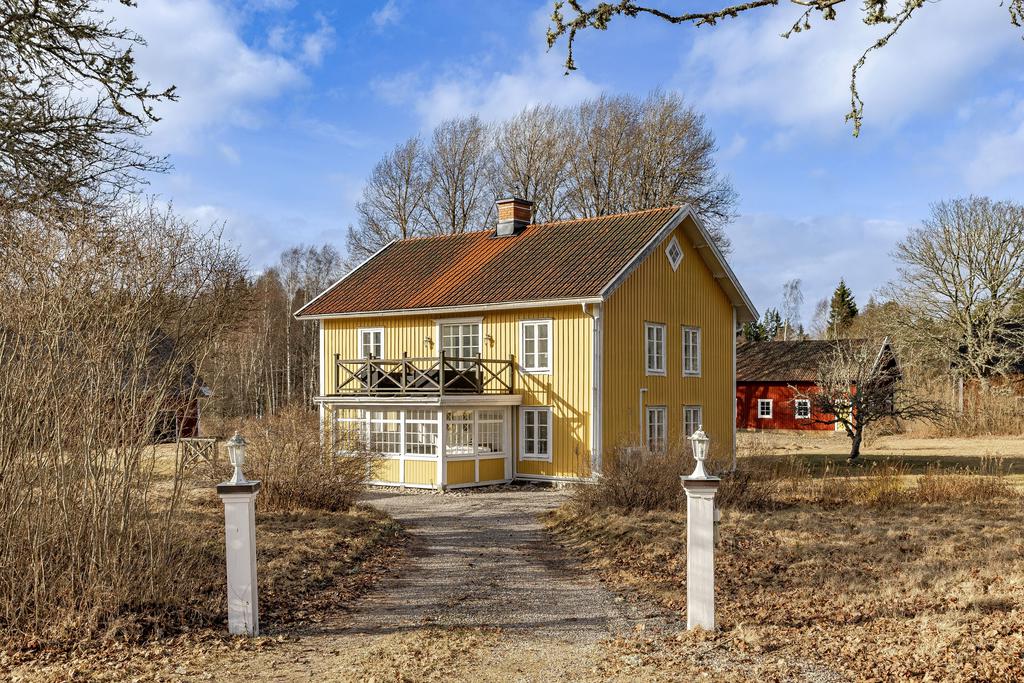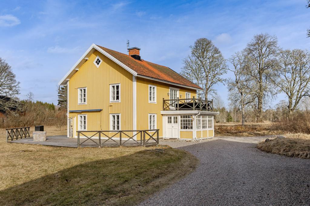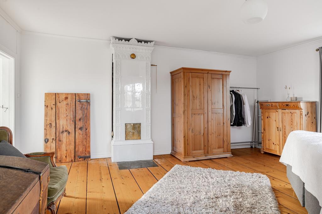 Mangårdsbyggnaden om ca 160 kvm förenar 1700-talets själ med modern komfort. Det generösa lantköket är gårdens hjärta – med murad öppen spis, tegelvalv, synliga takbjälkar och klassisk vedspis. Här möts bevarade originaldetaljer och varsam renovering i en varm och genuin atmosfär där man gärna samlar stora sällskap eller familjens vardagliga måltider. Samtliga fem rum har eldstäder som ger huset liv och karaktär året runt och många av rummen har även gedigna massiva trägolv med breda tiljor. Glasverandan med sina spröjsade fönster, balkongen med utsikt över åkerlandskapet och den stora altanen i kvällssol skapar en vardaglig lyx av varierade platser att njuta av läget, årstider och vyer. Helheten är flexibel och generös till yta med gott om plats för stor familj, gäst och fest där detaljer och välbevarad charm genomgår ytorna. Huset har även ett modernt badrum med helkaklad interiör, hörnbadkar och dusch med en elegant duschvägg i glas.