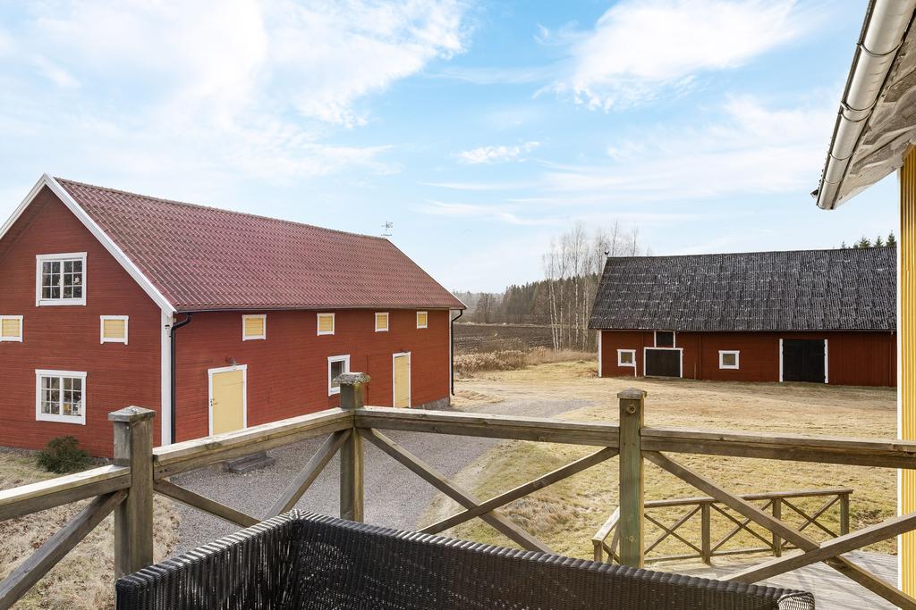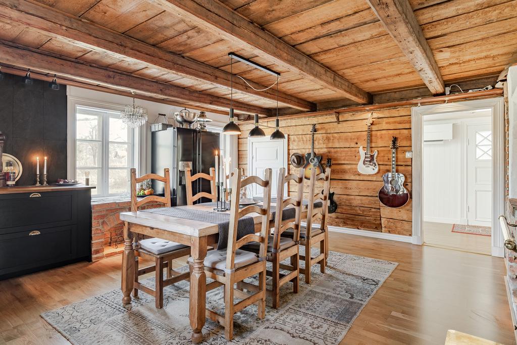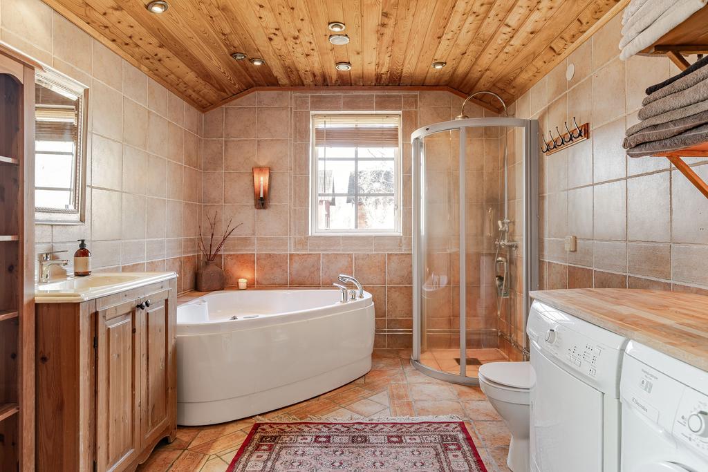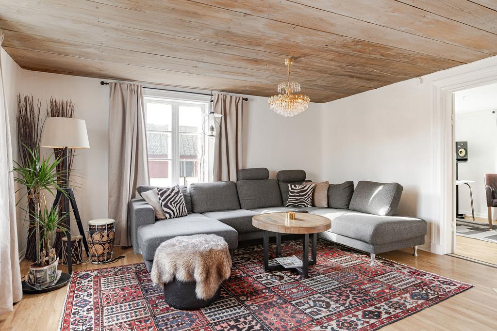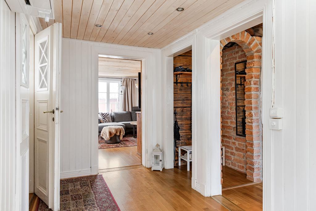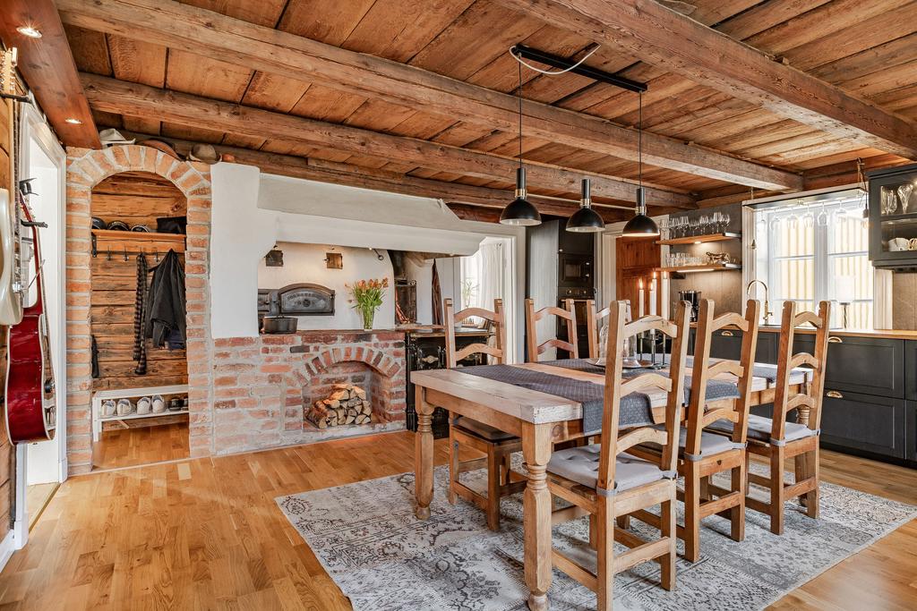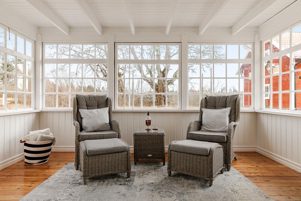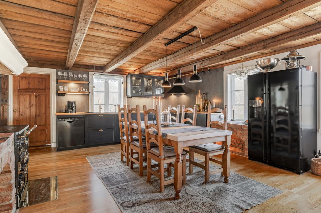 Mangårdsbyggnaden om ca 160 kvm förenar 1700-talets själ med modern komfort. Det generösa lantköket är gårdens hjärta – med murad öppen spis, tegelvalv, synliga takbjälkar och klassisk vedspis. Här möts bevarade originaldetaljer och varsam renovering i en varm och genuin atmosfär där man gärna samlar stora sällskap eller familjens vardagliga måltider. Samtliga fem rum har eldstäder som ger huset liv och karaktär året runt och många av rummen har även gedigna massiva trägolv med breda tiljor. Glasverandan med sina spröjsade fönster, balkongen med utsikt över åkerlandskapet och den stora altanen i kvällssol skapar en vardaglig lyx av varierade platser att njuta av läget, årstider och vyer. Helheten är flexibel och generös till yta med gott om plats för stor familj, gäst och fest där detaljer och välbevarad charm genomgår ytorna. Huset har även ett modernt badrum med helkaklad interiör, hörnbadkar och dusch med en elegant duschvägg i glas.