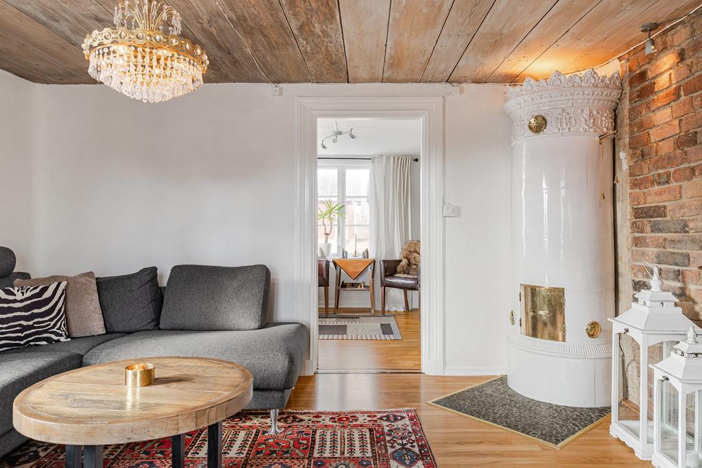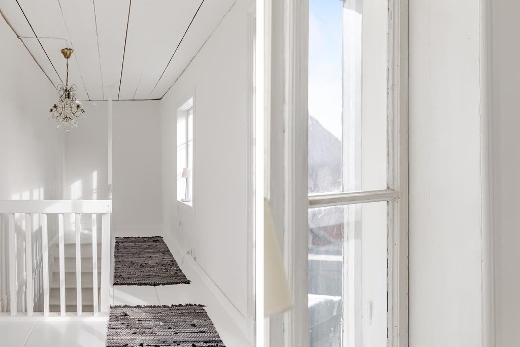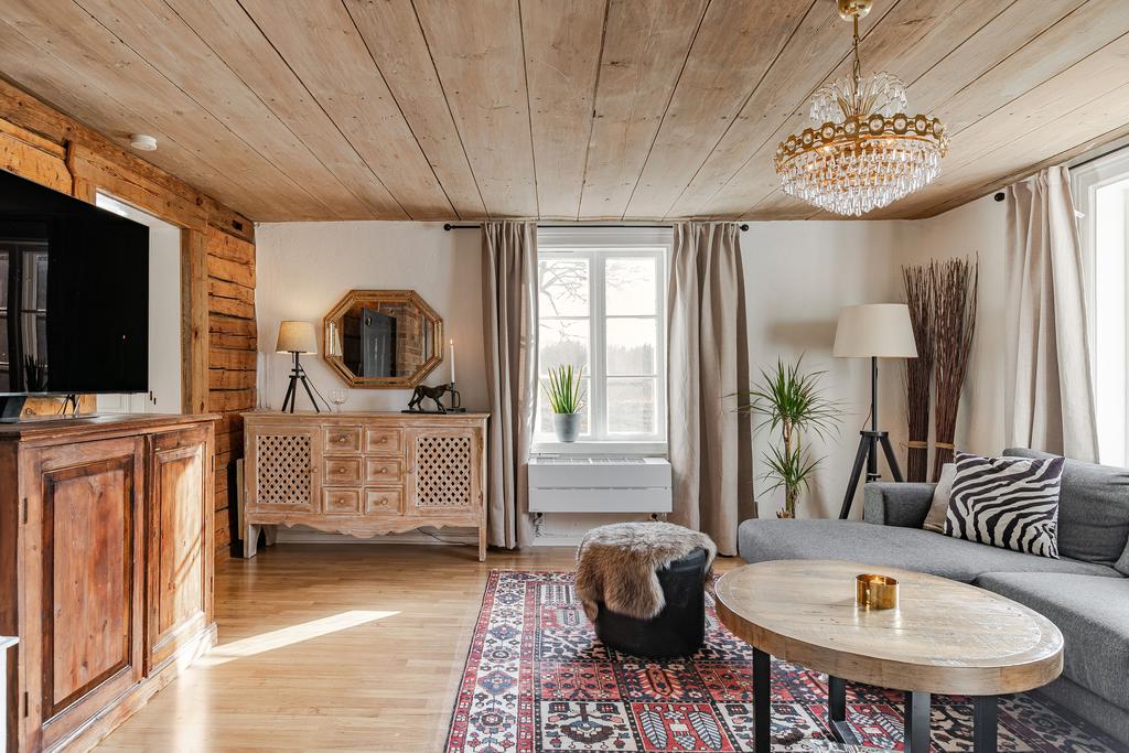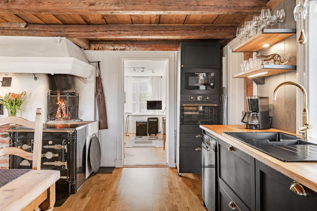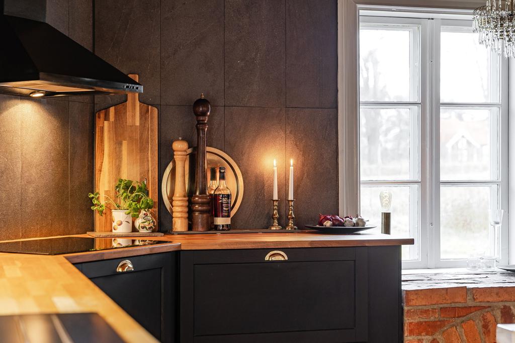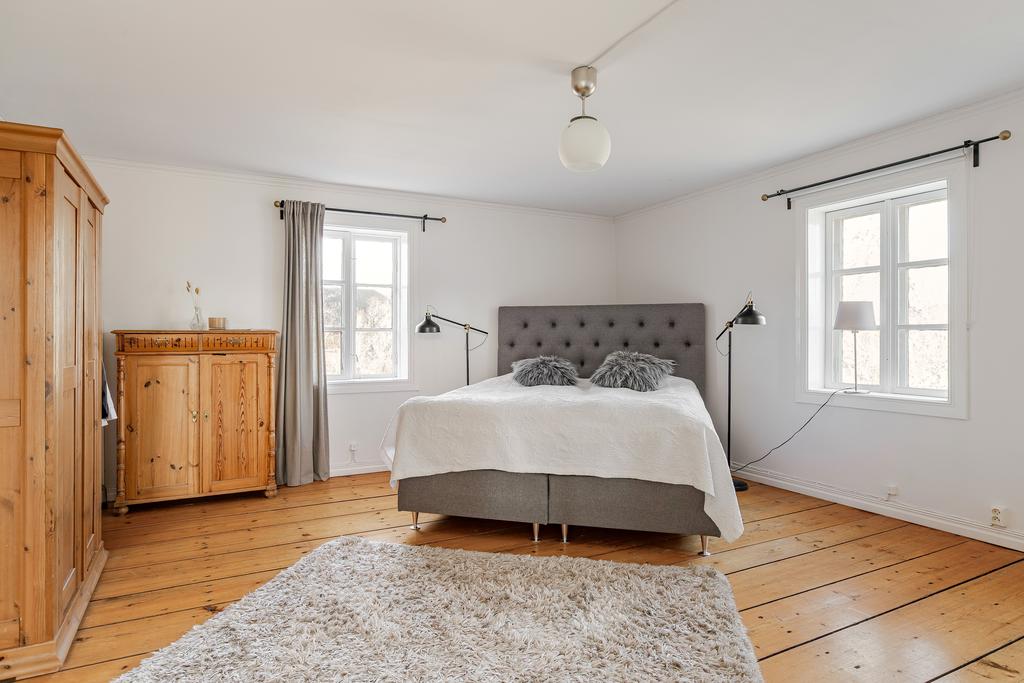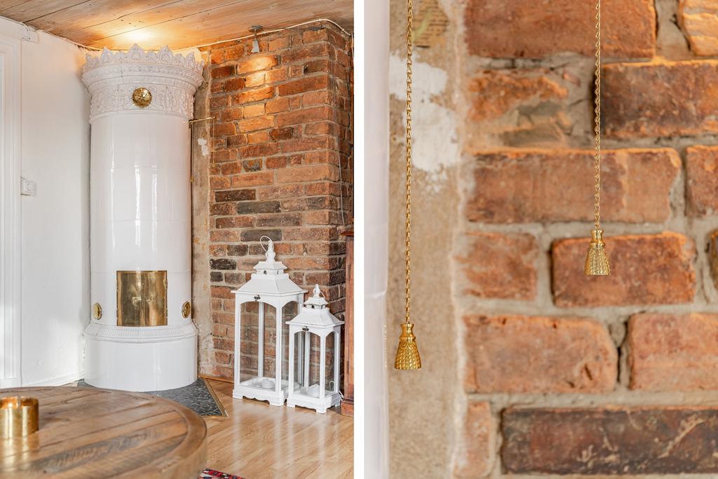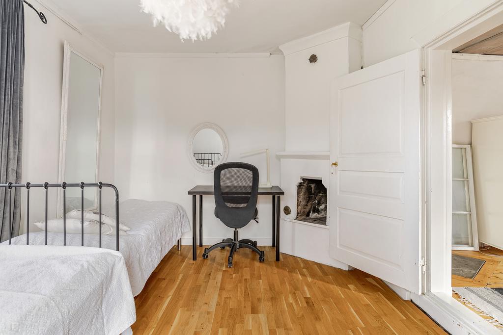 Mangårdsbyggnaden om ca 160 kvm förenar 1700-talets själ med modern komfort. Det generösa lantköket är gårdens hjärta – med murad öppen spis, tegelvalv, synliga takbjälkar och klassisk vedspis. Här möts bevarade originaldetaljer och varsam renovering i en varm och genuin atmosfär där man gärna samlar stora sällskap eller familjens vardagliga måltider. Samtliga fem rum har eldstäder som ger huset liv och karaktär året runt och många av rummen har även gedigna massiva trägolv med breda tiljor. Glasverandan med sina spröjsade fönster, balkongen med utsikt över åkerlandskapet och den stora altanen i kvällssol skapar en vardaglig lyx av varierade platser att njuta av läget, årstider och vyer. Helheten är flexibel och generös till yta med gott om plats för stor familj, gäst och fest där detaljer och välbevarad charm genomgår ytorna. Huset har även ett modernt badrum med helkaklad interiör, hörnbadkar och dusch med en elegant duschvägg i glas.