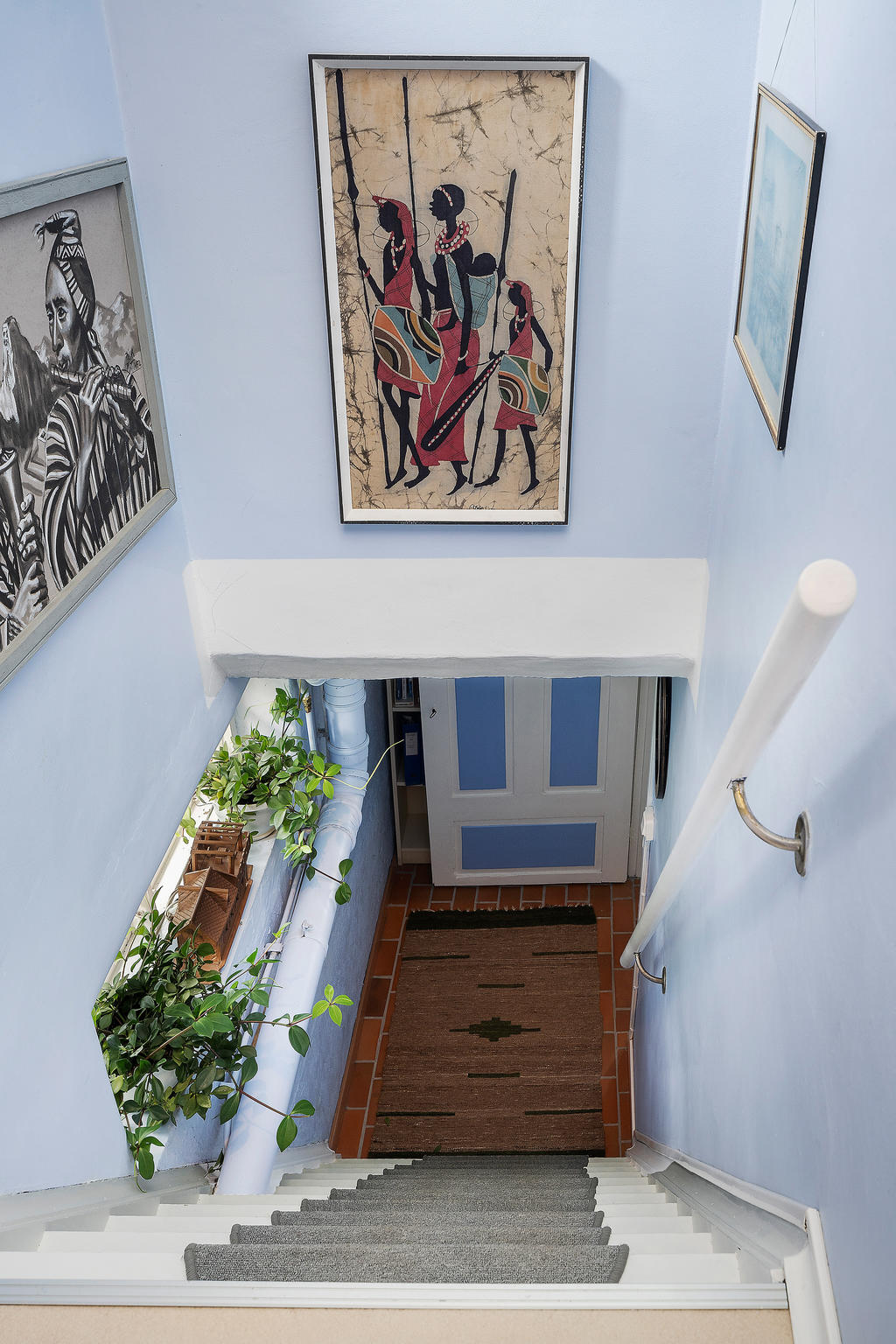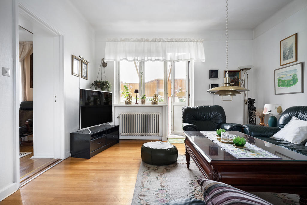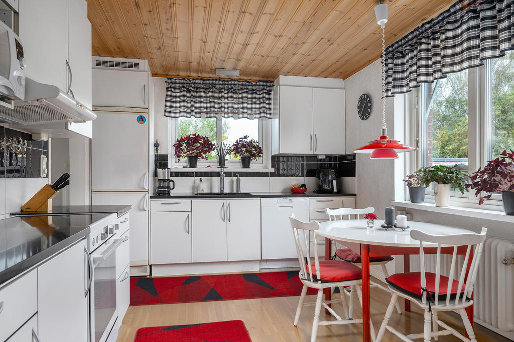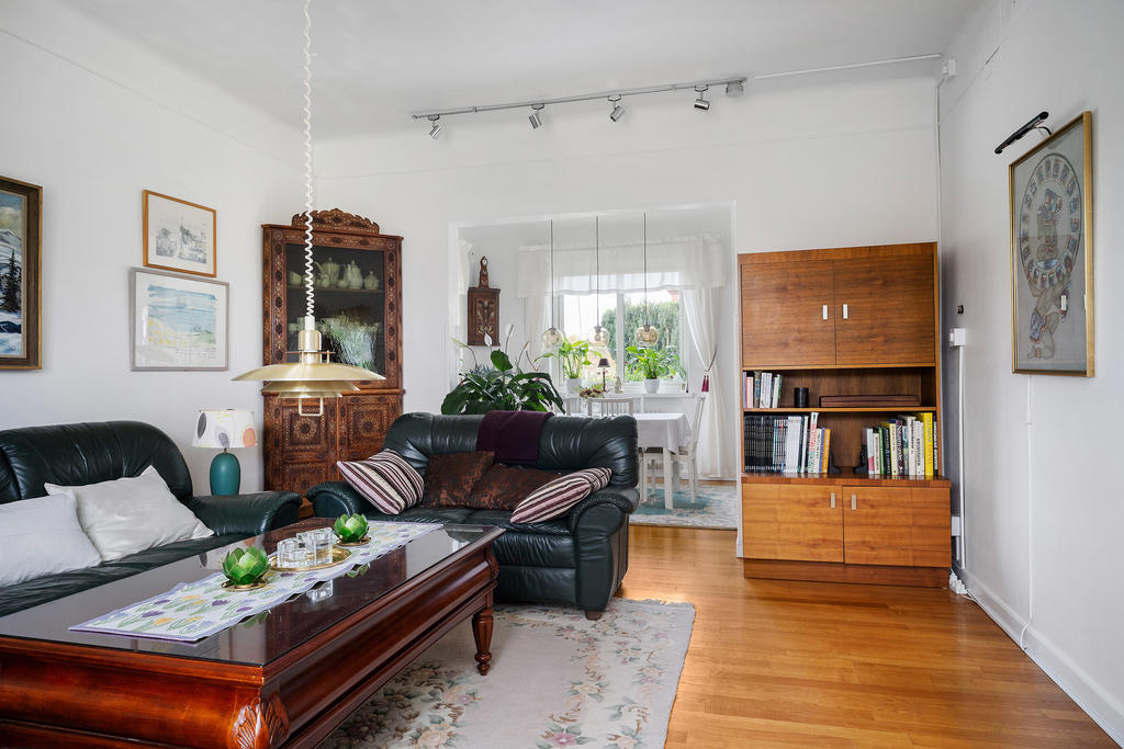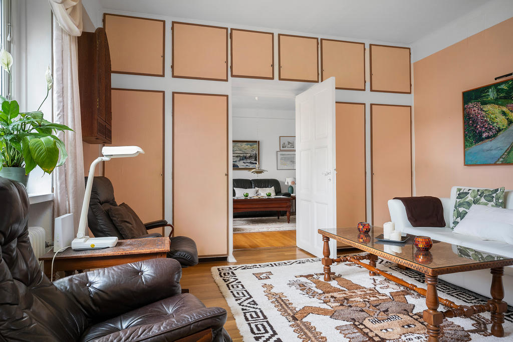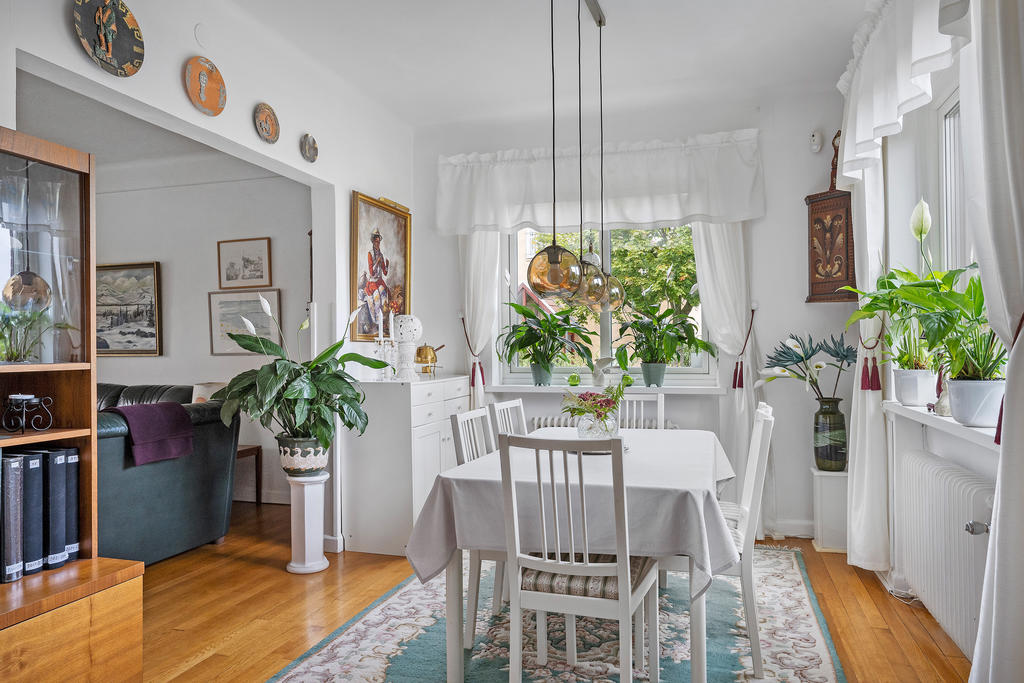 Här finns charm i överflöd och gott om plats för familjeliv och umgänge. På bottenplan möts du av ett rymligt kök med generösa arbetsytor som övergår i en stor matsal – den perfekta platsen för middagar och festliga tillställningar. Planlösningen är social och genomtänkt, med två vardagsrum som binds samman med köket och matsalen i en rundgång där rummen flyter in i varandra på ett naturligt sätt. Här kan man umgås, röra sig fritt och ändå känna sig hemma i varje hörn. På entréplanet finns även en praktisk gästtoalett. Nuvarande ägare använder samtliga rum på entréplan som sociala rum, men det går även utmärkt som sovrum.