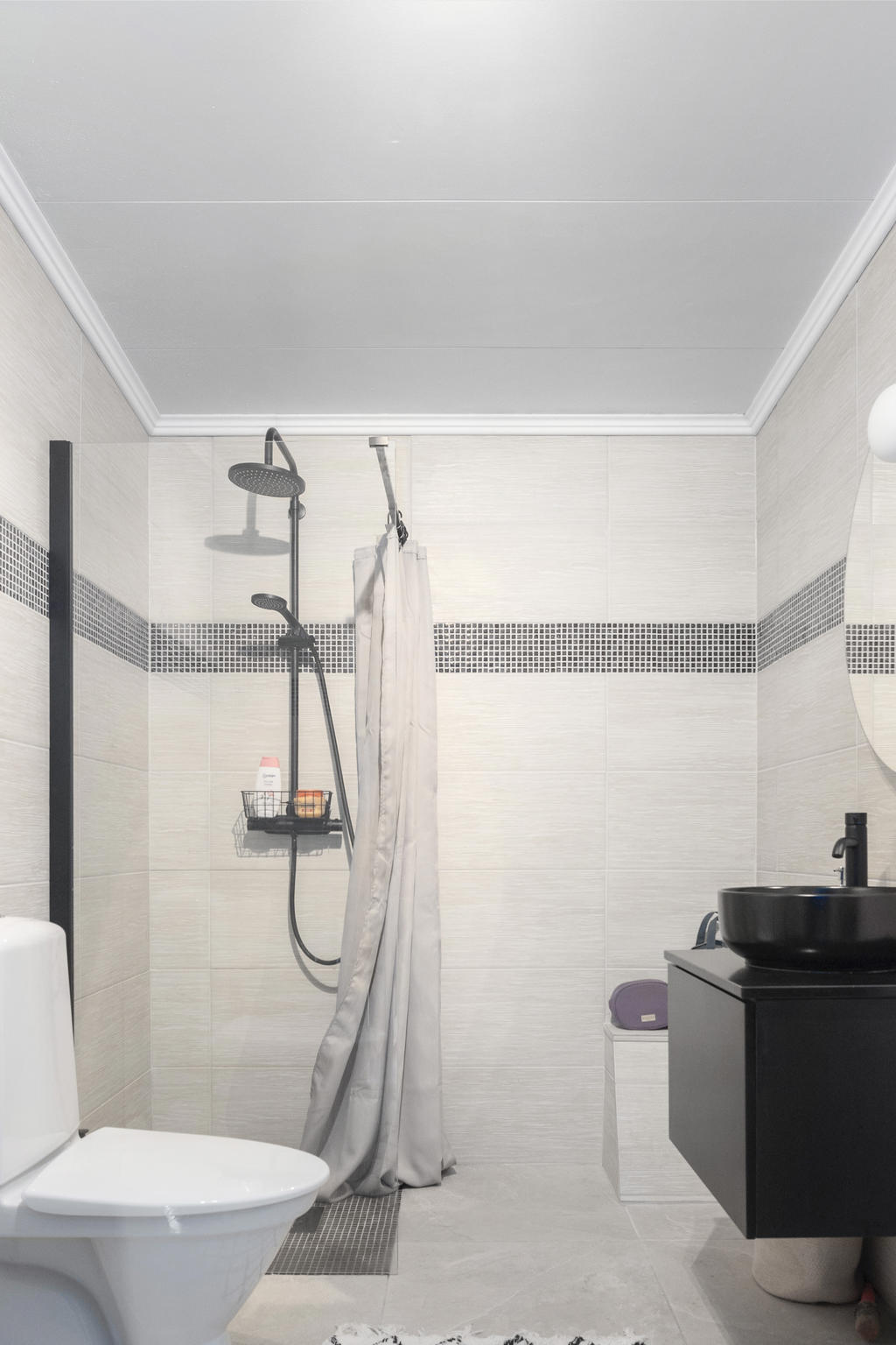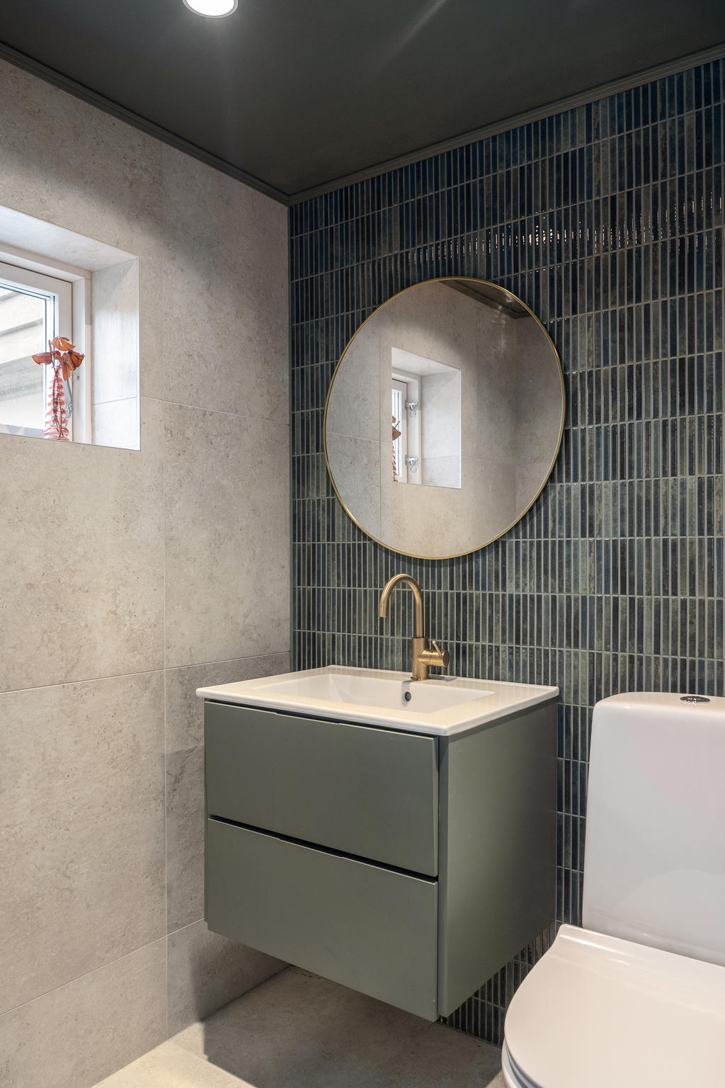 Badrummet på entréplan förvandlar vardagsmorgnar till en spaupplevelse. Helkaklat i tidlösa, ljusa toner ger det en påtaglig hotellkänsla. Utrymmet är så generöst tilltaget att du nästan kan ta ett danssteg in bakom den klara glasväggen i duschen - en härlig påminnelse om vardagslyx när den är som bäst.
