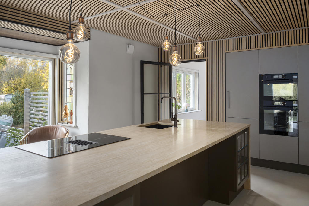 Köket från HTH är en dröm för esteten men framförallt kocken. Bakom de stilrena linjerna döljer sig smart funktion med dubbla inbyggda ugnar och en generös induktionshäll. Blicken dras omedelbart till den vackra bänkskivan i travertin. Vardagsrummet intill fullkomligt badar i ljus tack vare fönster i flera väderstreck. Det vackra parkettgolvet värmer under fötterna och de infällda spotlightsen skapar en mjuk och inbjudande stämning när mörkret faller. Det är ett rum som rymmer både stora fester och tysta lässtunder i fåtöljen.