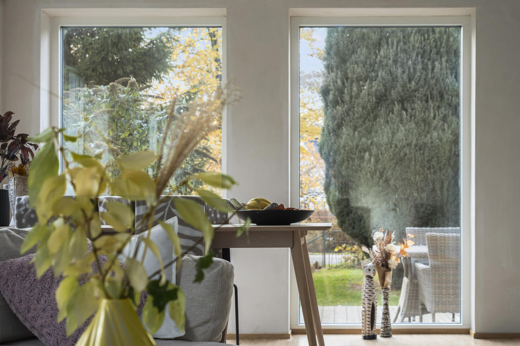 Allt hänger ihop - släta ytor i ljusa toner, parkettgolvet i vardagsrummet, infällda spotlights och golvvärme i hela huset skapar en harmonisk helhet. Det är genomtänkt, men ändå avslappnat. Ett hem med själ, helt enkelt.